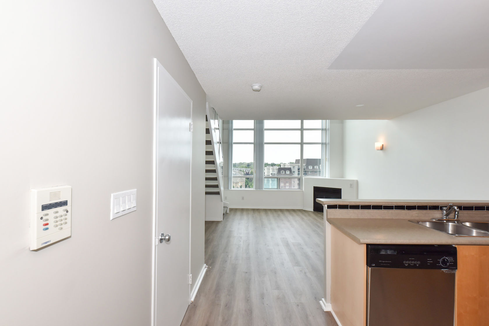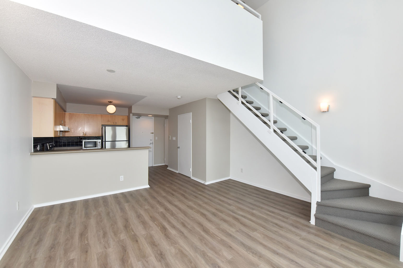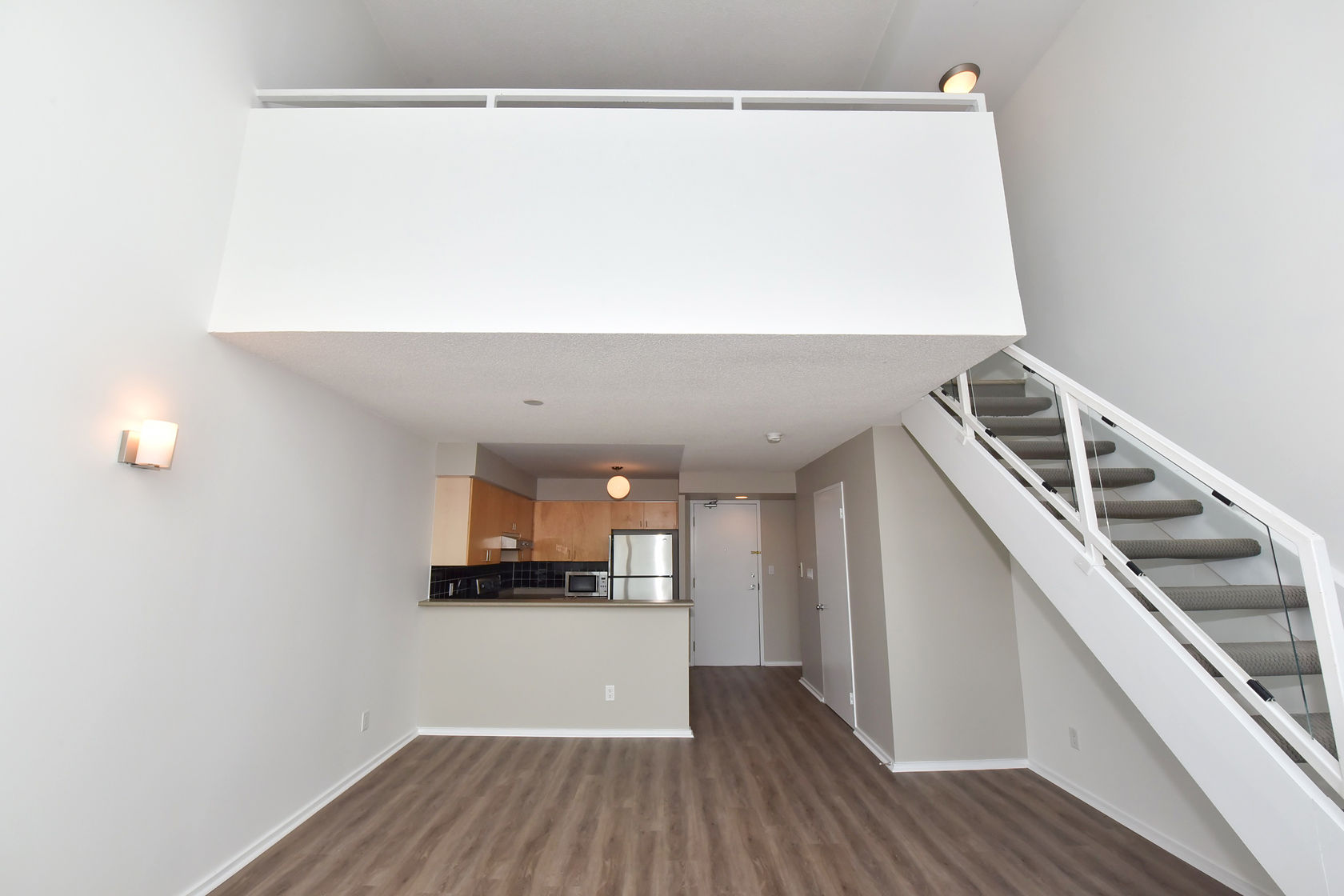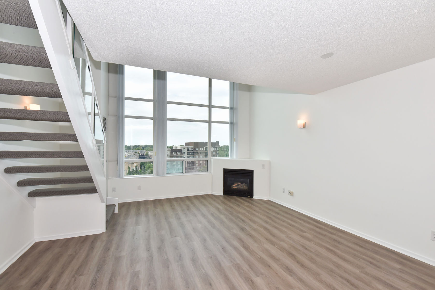 Welcome to Mystic Pointe! This stunning 2-storey loft boasts 17-foot floor-to-ceiling windows, providing plenty of natural light. The open-concept design features two washrooms and a gas fireplace. The main and upper levels have vinyl plank flooring. You'll have access to a variety of building amenities, including gatehouse security, a rooftop patio with BBQ and sundecks, a hot tub, sauna, squash court, billiards, and a lounge/party room. Parking is included in your rent. Located minutes from Lake, downtown Toronto, Queensway shops, and restaurants. This is the perfect place to call home!