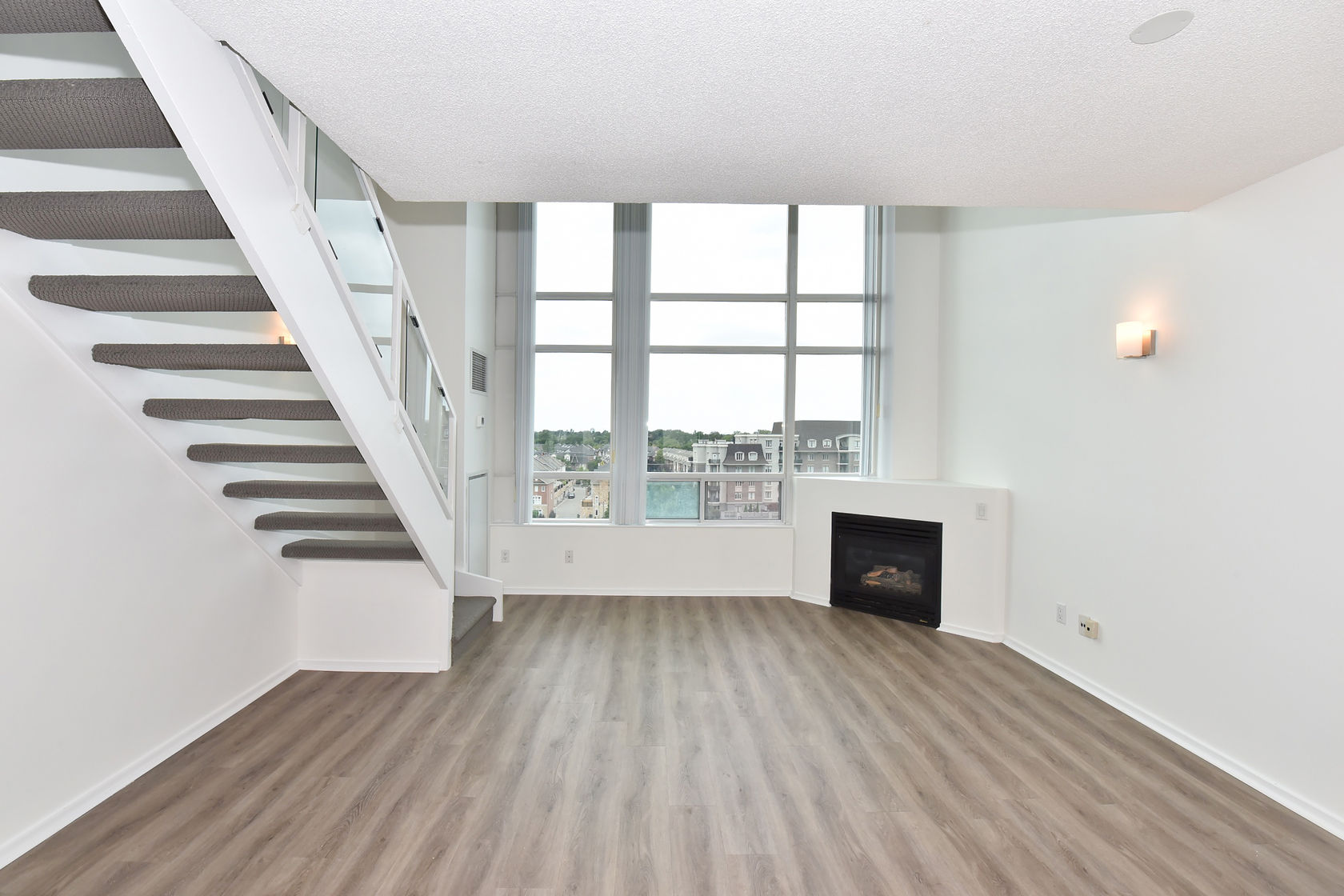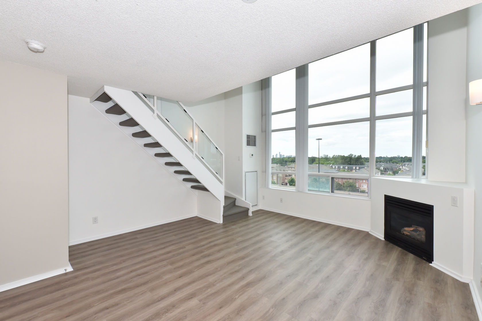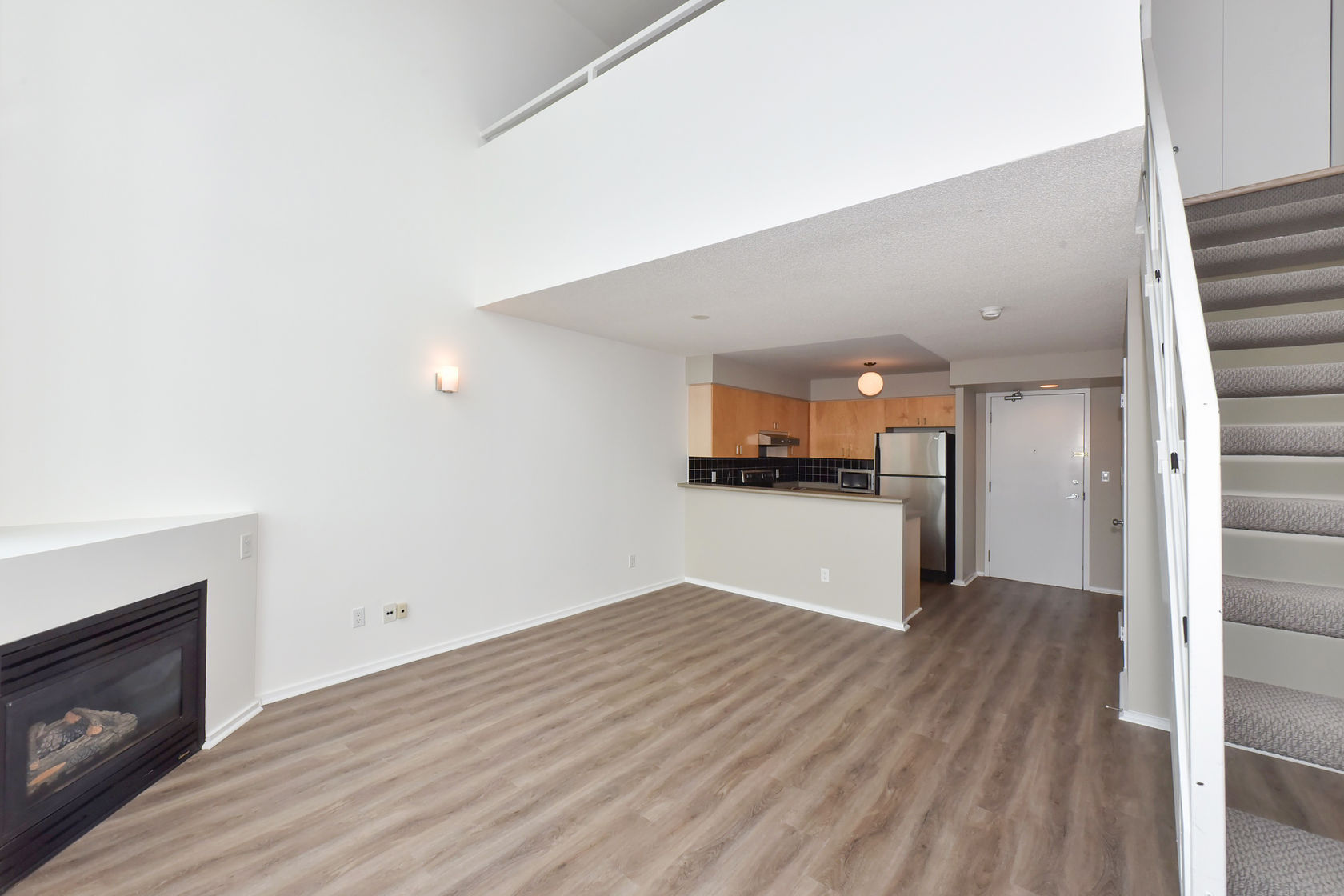 Welcome to Mystic Pointe! This stunning 2-storey loft boasts 17-foot floor-to-ceiling windows, providing plenty of natural light. The open-concept design features two washrooms and a gas fireplace. The main and upper levels have vinyl plank flooring. You'll have access to a variety of building amenities, including gatehouse security, a rooftop patio with BBQ and sundecks, a hot tub, sauna, squash court, billiards, and a lounge/party room. Parking is included in your rent. Located minutes from Lake, downtown Toronto, Queensway shops, and restaurants. This is the perfect place to call home!