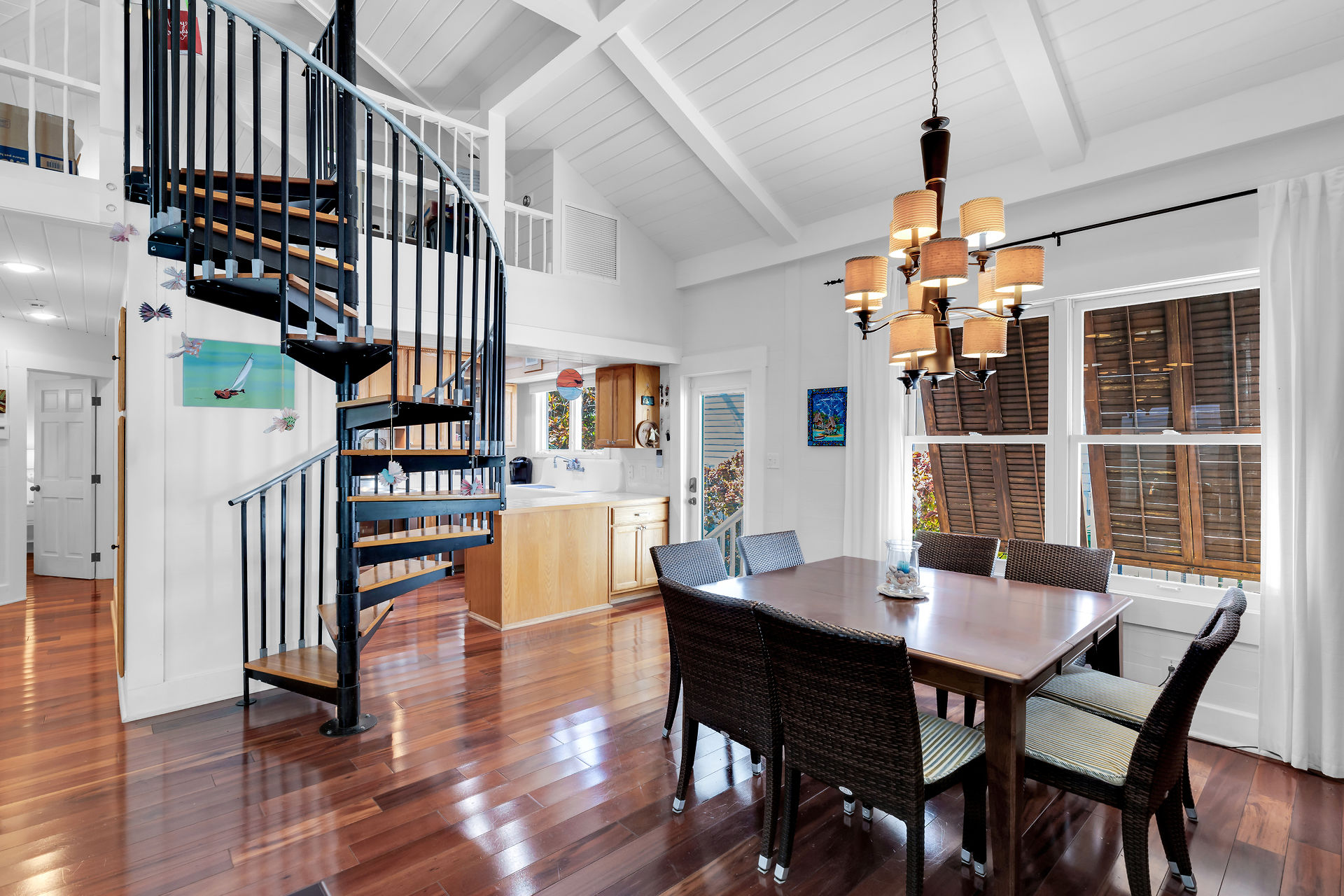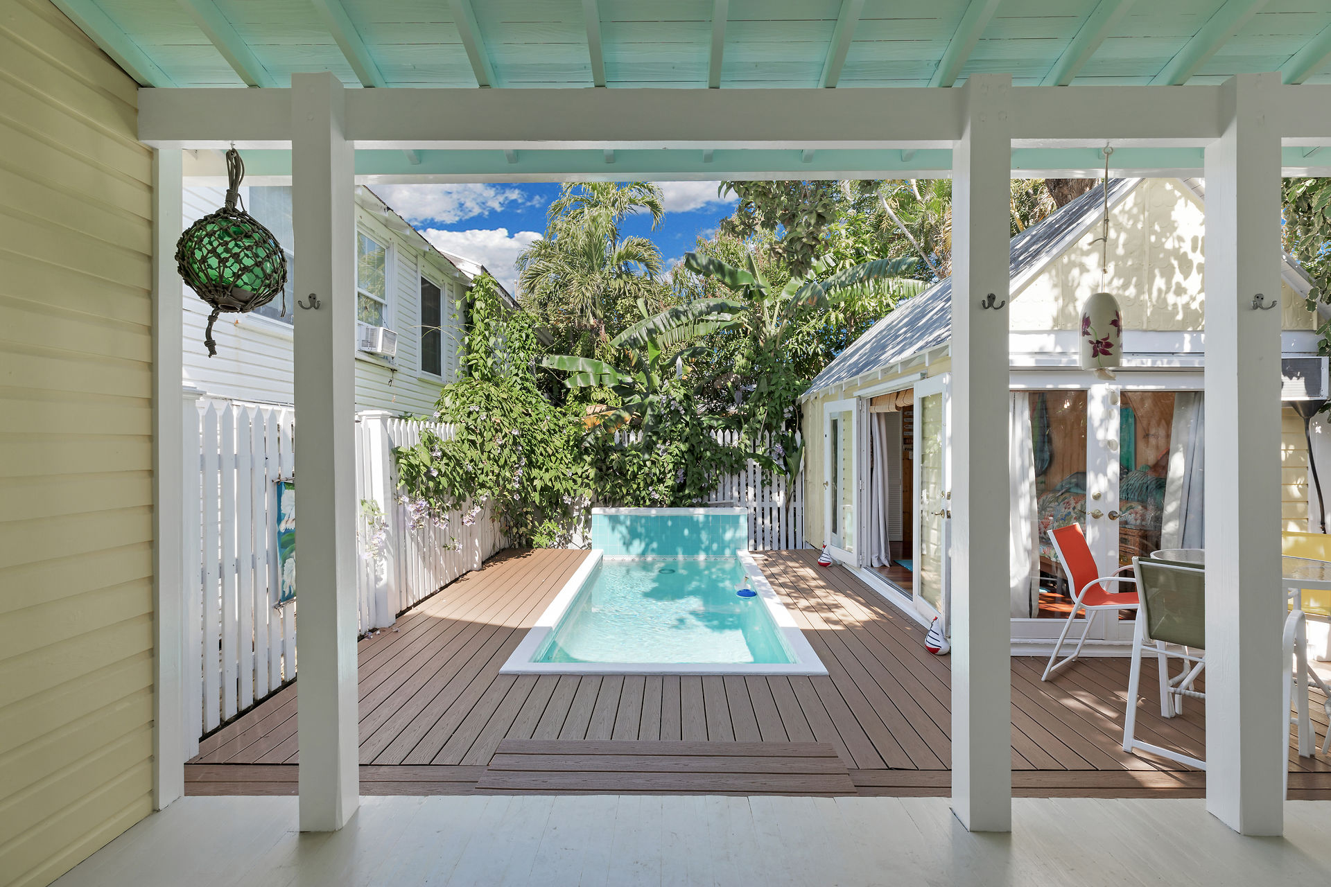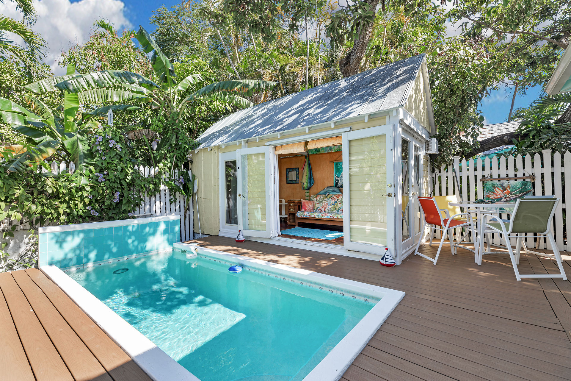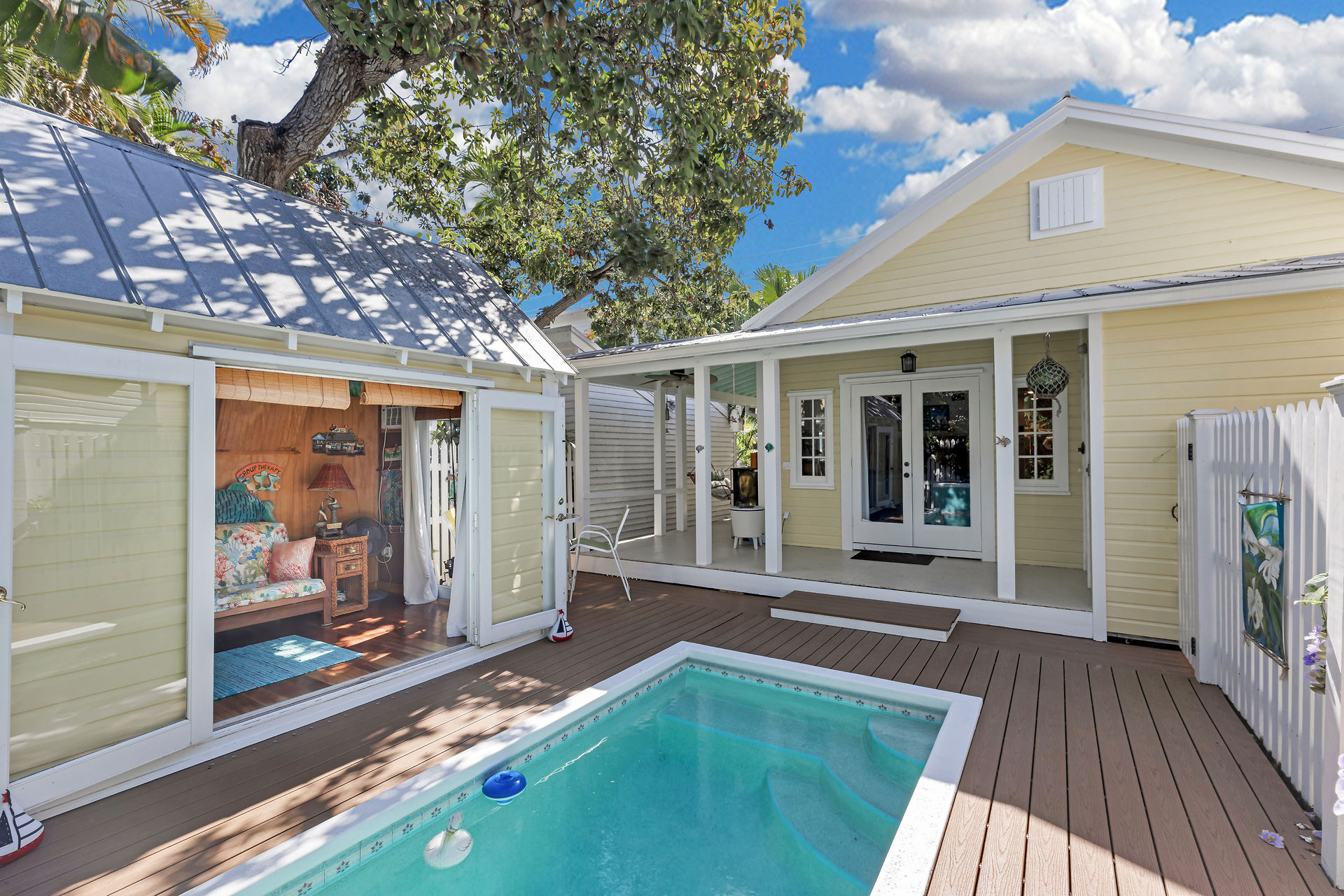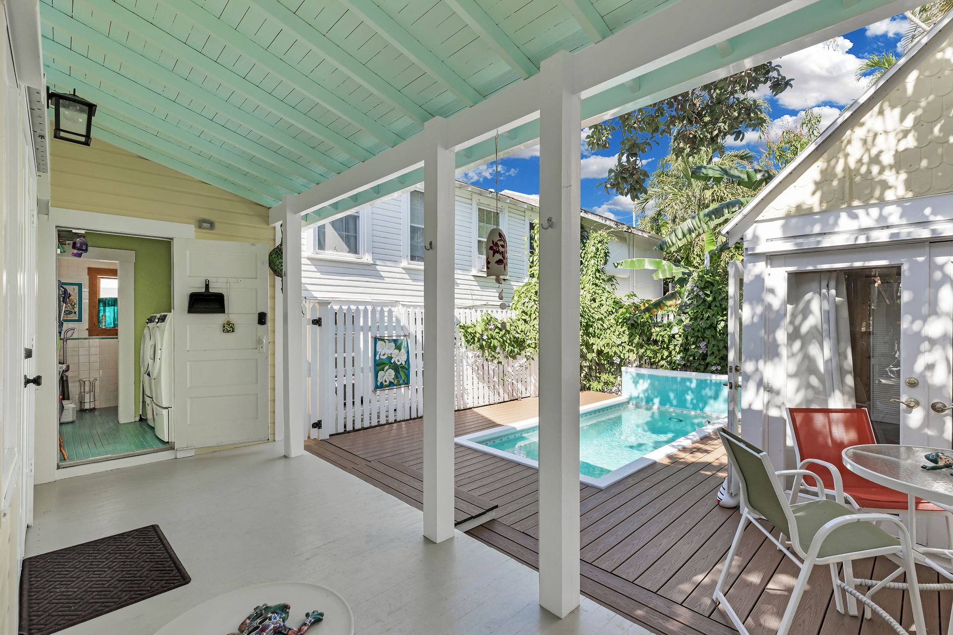 Welcome to this charming home, nestled in one of the most prestigious, highly sought after neighborhoods in Key West. It features 3 bedrooms, 2 full baths and one 1/2 bath. Relax or entertain in the open floor plan living area. 2 sets of french doors flow seamlessly to the wraparound porch, pool and guest cottage/studio. Access to the 1/2 bath from the back porch and guest cottage make spending time in the tropical pool area a pleasure. Dade county pine and a stunning cathedral ceiling add to the spacious and historic ambiance. The spiral staircase brings you to the 3rd bedroom and den/music room. The primary bath is beautifully updated. This home has been meticulously maintained to retain the historic ambiance.