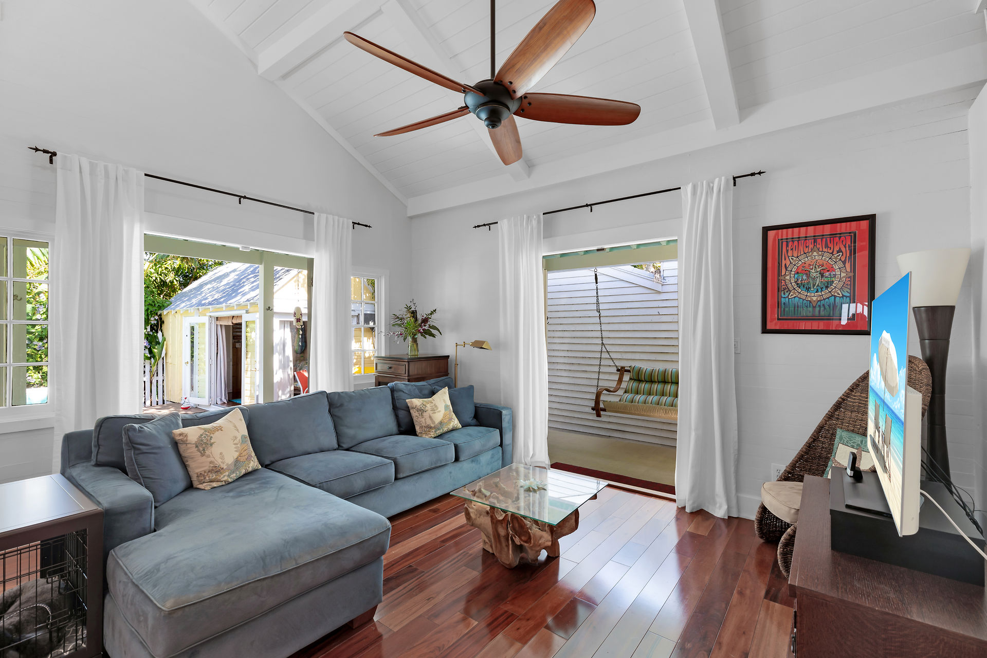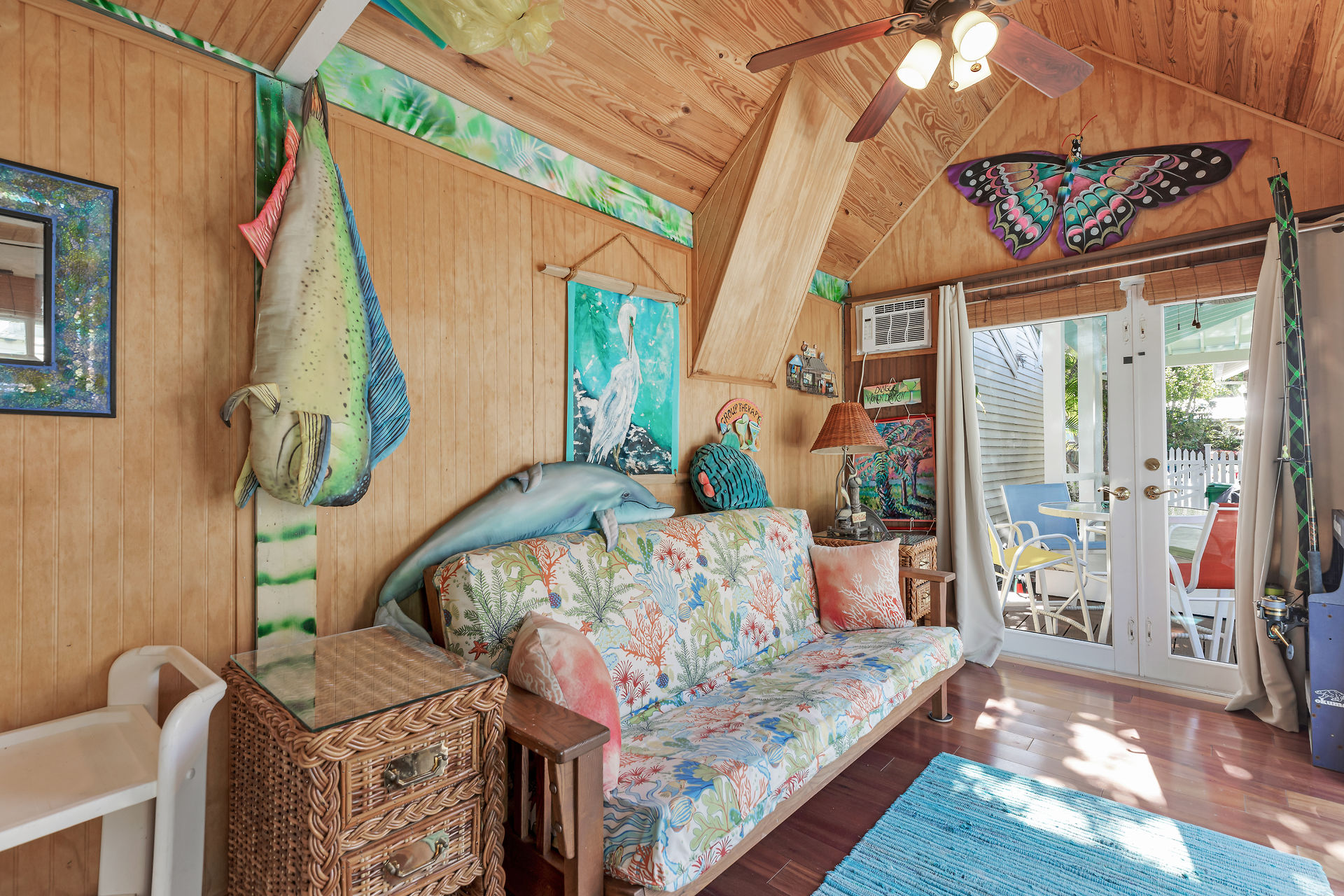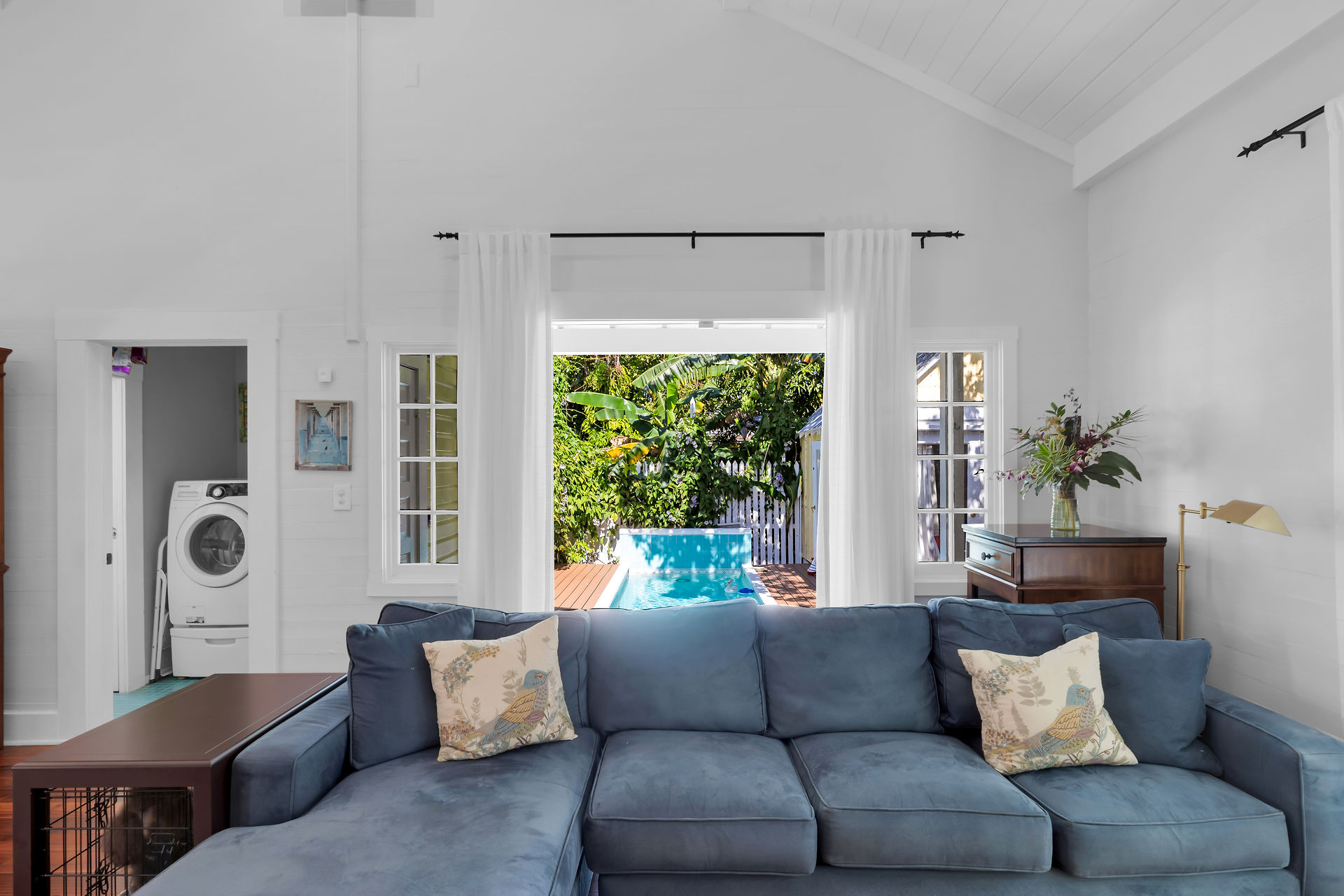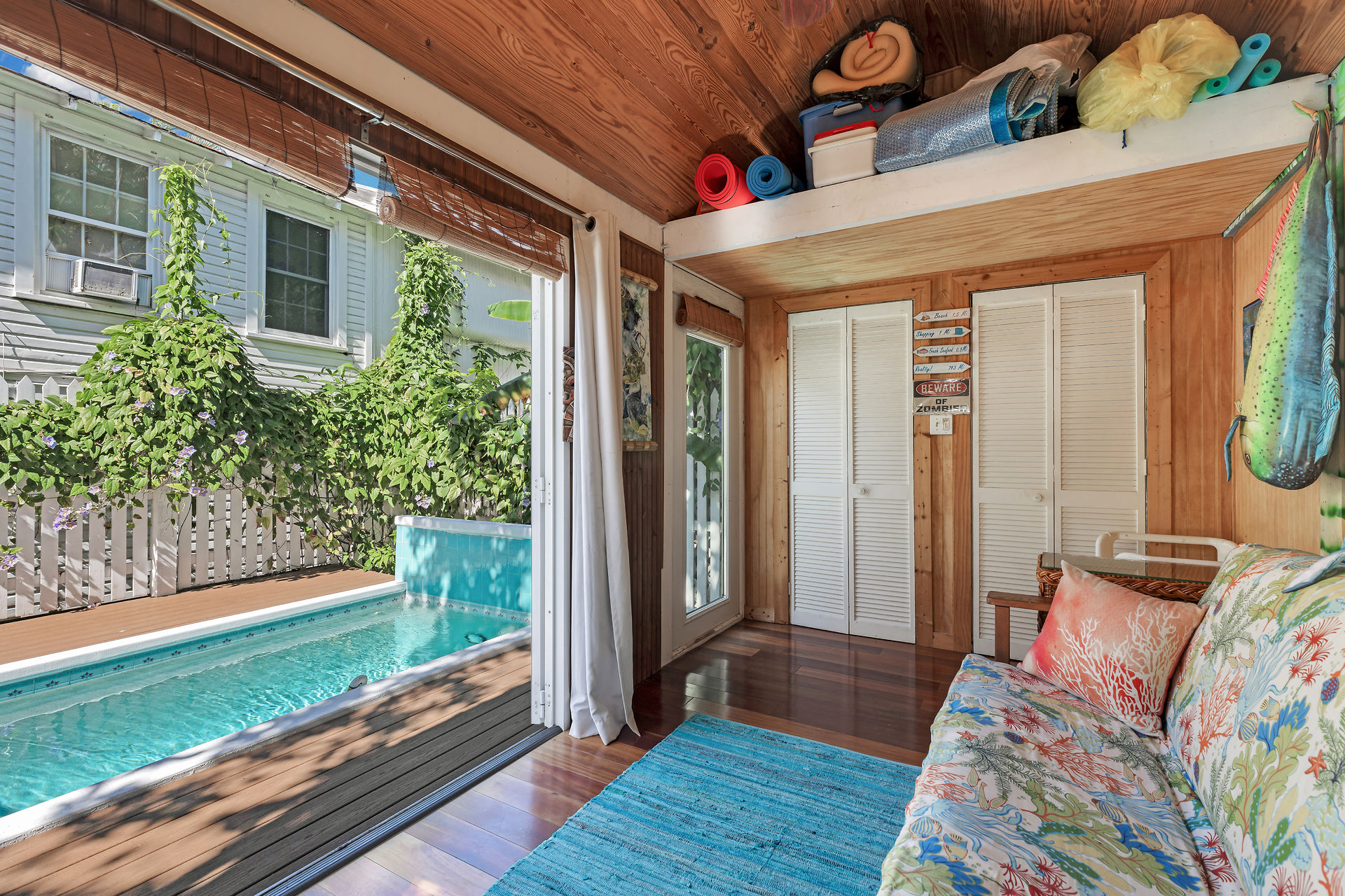 Welcome to this charming home, nestled in one of the most prestigious, highly sought after neighborhoods in Key West. It features 3 bedrooms, 2 full baths and one 1/2 bath. Relax or entertain in the open floor plan living area. 2 sets of french doors flow seamlessly to the wraparound porch, pool and guest cottage/studio. Access to the 1/2 bath from the back porch and guest cottage make spending time in the tropical pool area a pleasure. Dade county pine and a stunning cathedral ceiling add to the spacious and historic ambiance. The spiral staircase brings you to the 3rd bedroom and den/music room. The primary bath is beautifully updated. This home has been meticulously maintained to retain the historic ambiance.