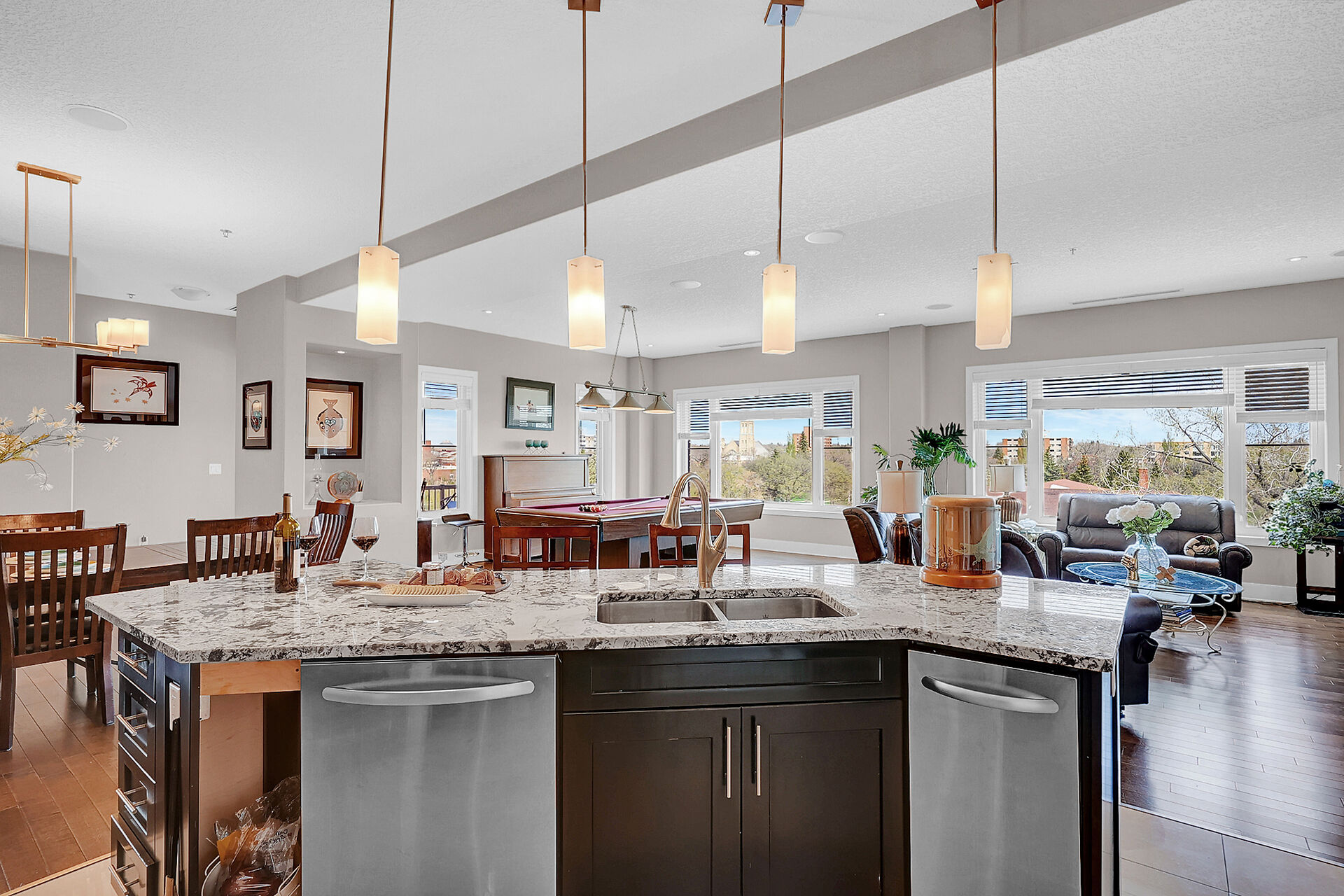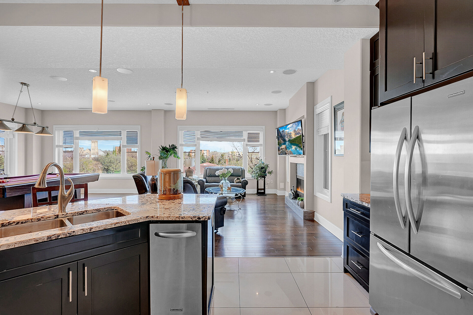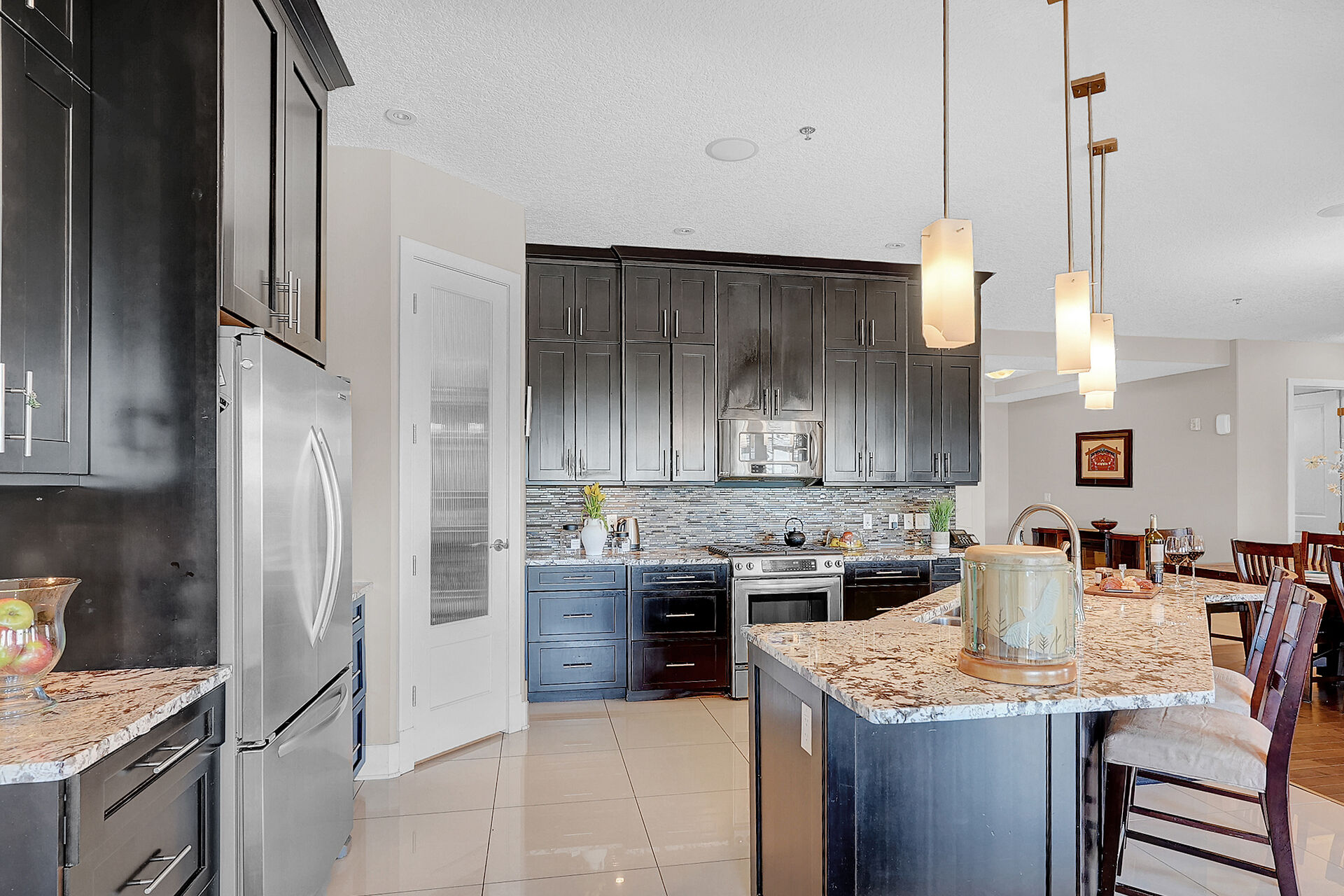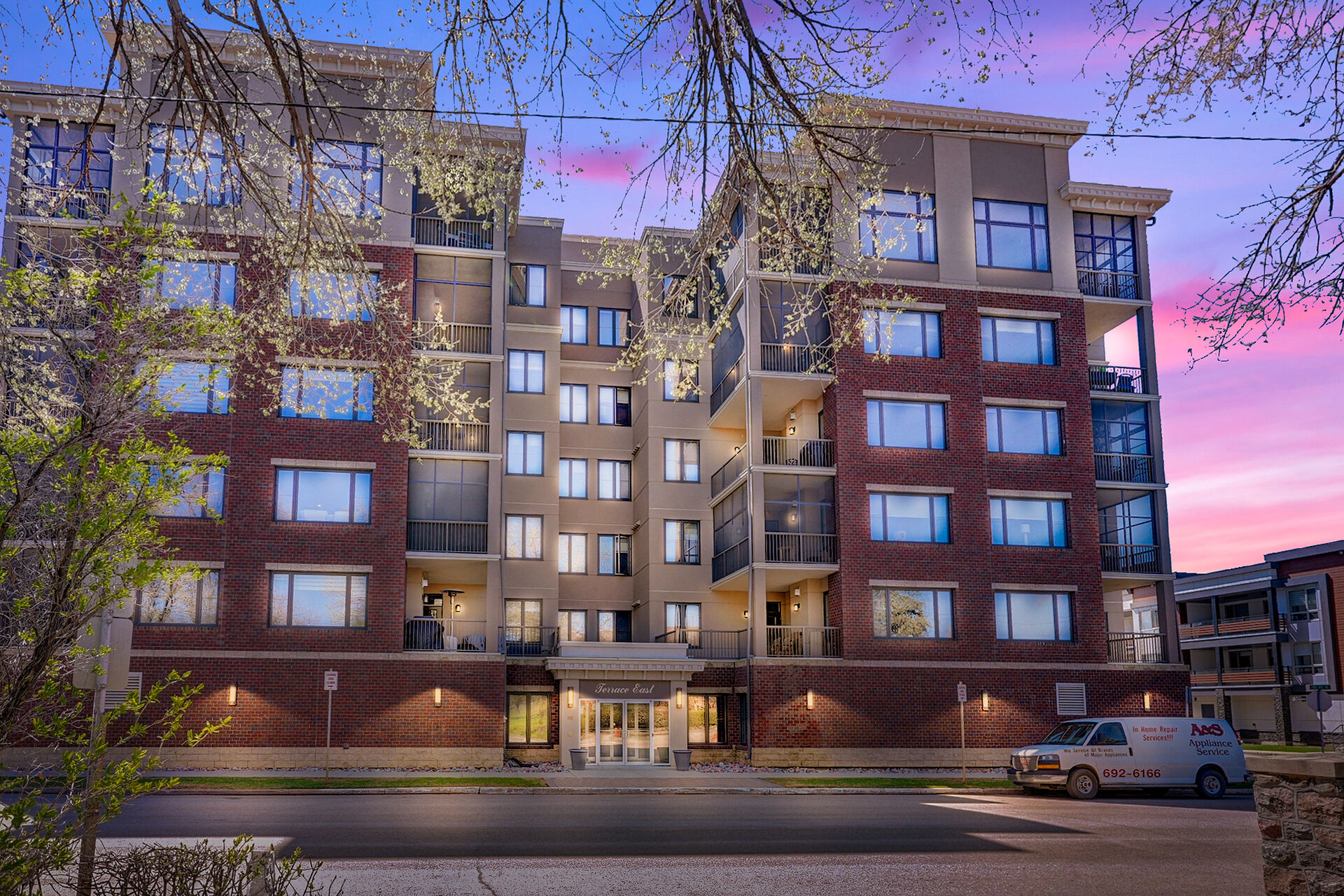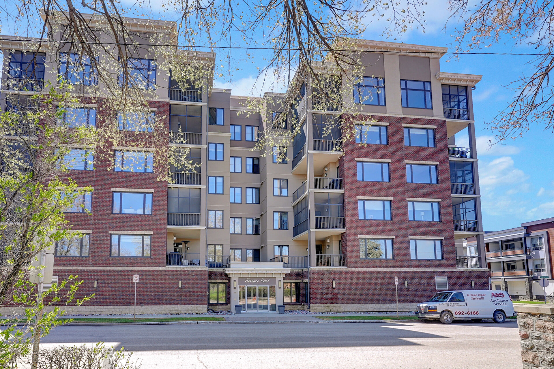Unparalleled elegance & sophistication at Terrace East Penthouse Condo, a residence that epitomizes luxury living w/views of Crescent Park. This extraordinary condo is a sanctuary of style. The grandeur of the 12-foot ceilings w/8ft solid core doors, add to the expansive open-concept living, magnified by floor to ceiling windows inviting an abundance of natural light w/access to 2 Balconies w/1 being screened in. Living Room adorn by sheer space, hosts a Gas Fireplace w/A/V h/u, in addition to the b/i Sound System set thru out. 3 Beds/Den/2.5 Baths. Terrace East is a secure luxury complex, offering 2 underground parking stalls, guest room, gym, mail & library Rms. Visit vickirealty.com for more info & complex specs.