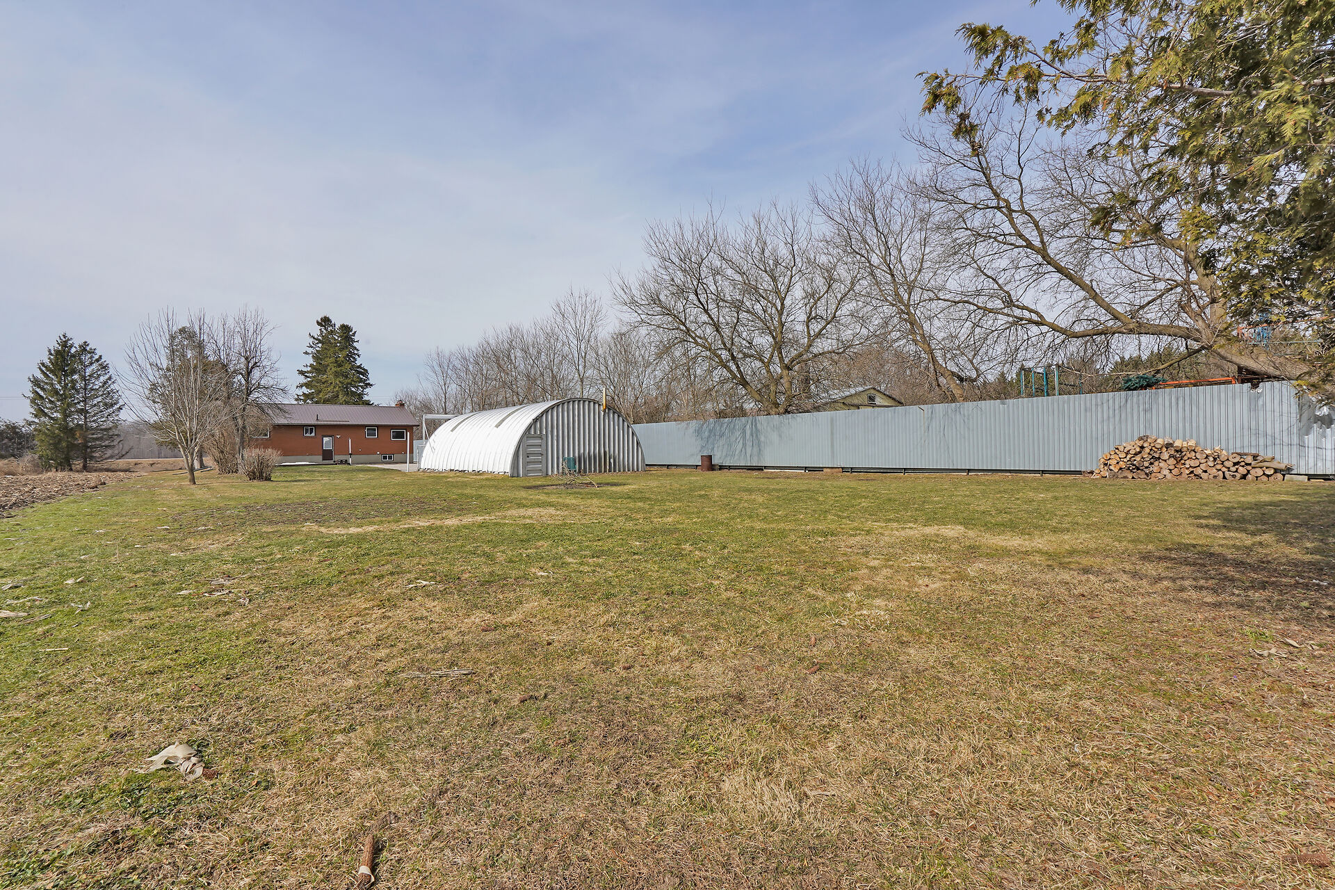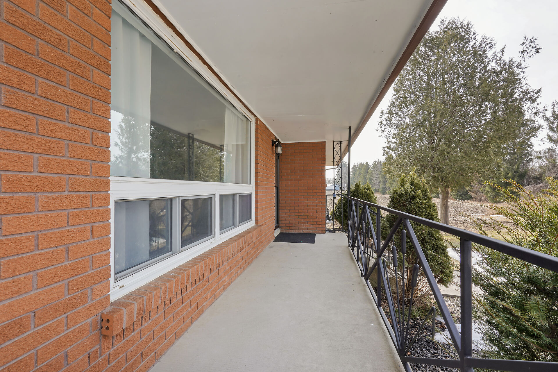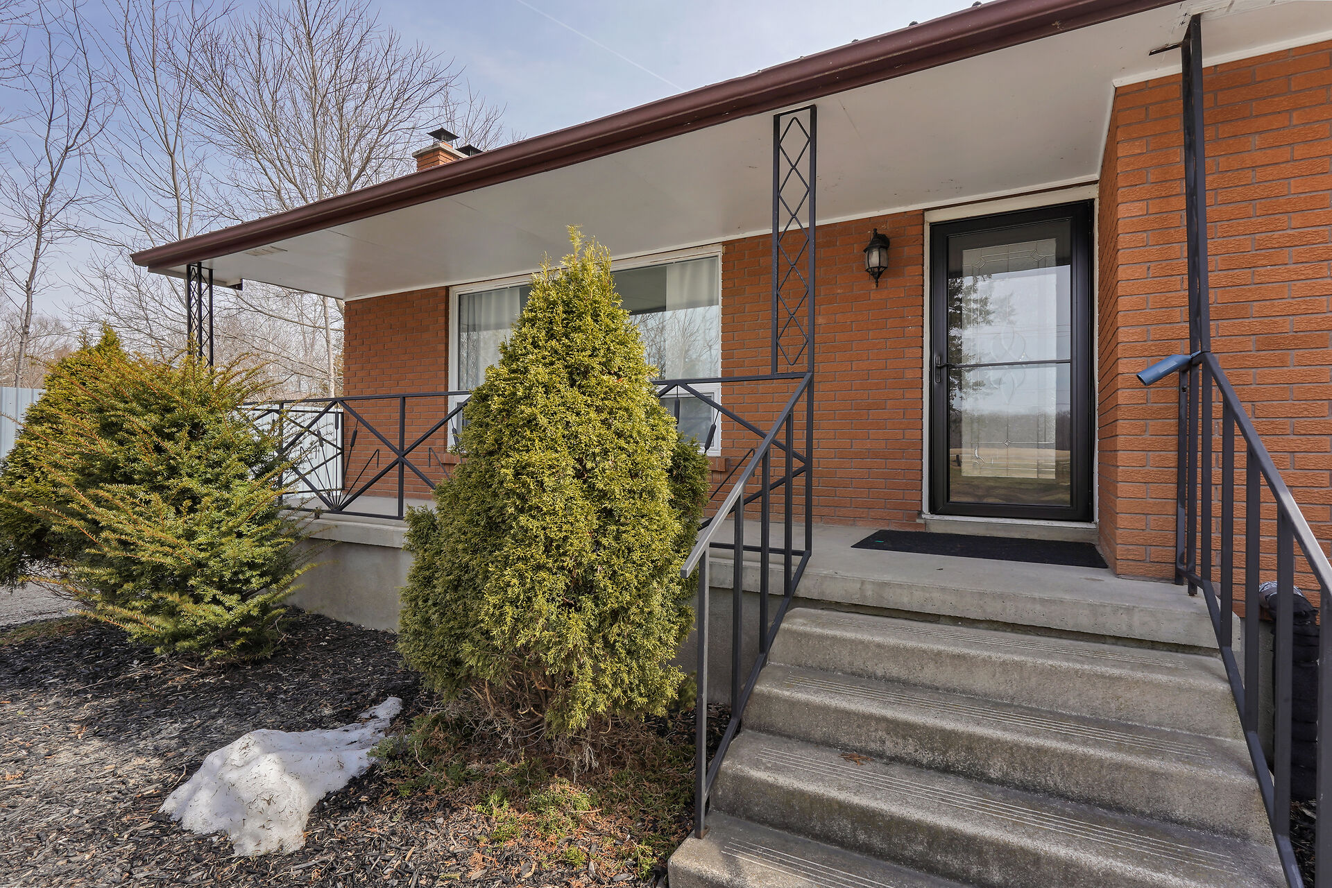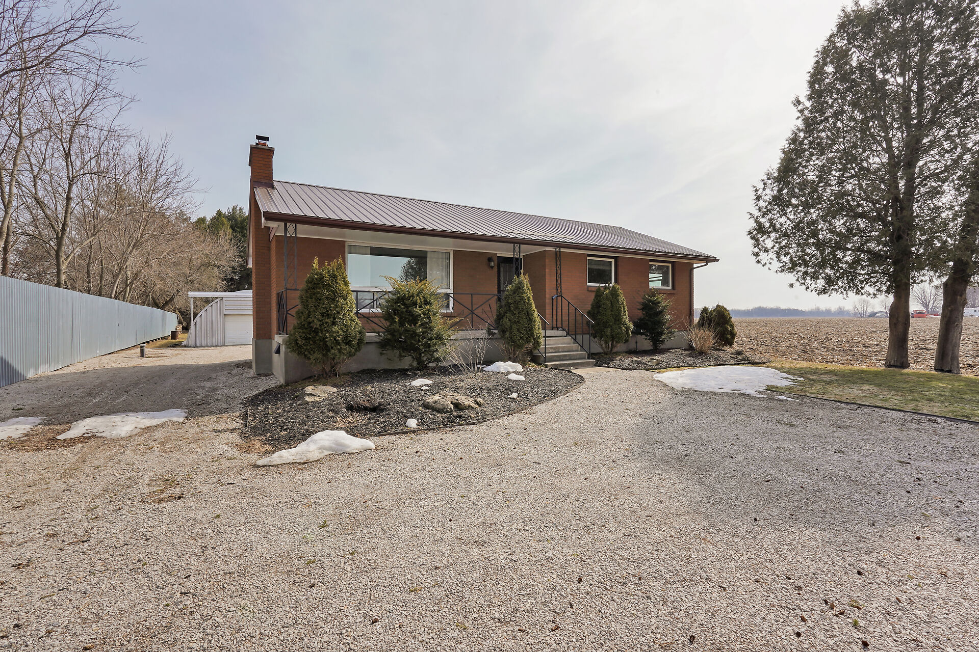 A great little country, cozy brick, home with big garage/shop on not too big of lot, private and short drive to City/Shopping - Updated! The garage is about 25 x 40 ft estimate with concrete floor, hydro and single garage door, rough in for wood stove- plus might fit two cars in tandem! The home has the covered front porch; updated flooring in living room with brick fireplace (as-is); open to dining area then updated kitchen with cabinets & appliances & off the kitchen is convenient door to rear yard. There are 3 carpeted bedrooms on the main. Full updated bathroom with glass doors. The lower level has family room with ba