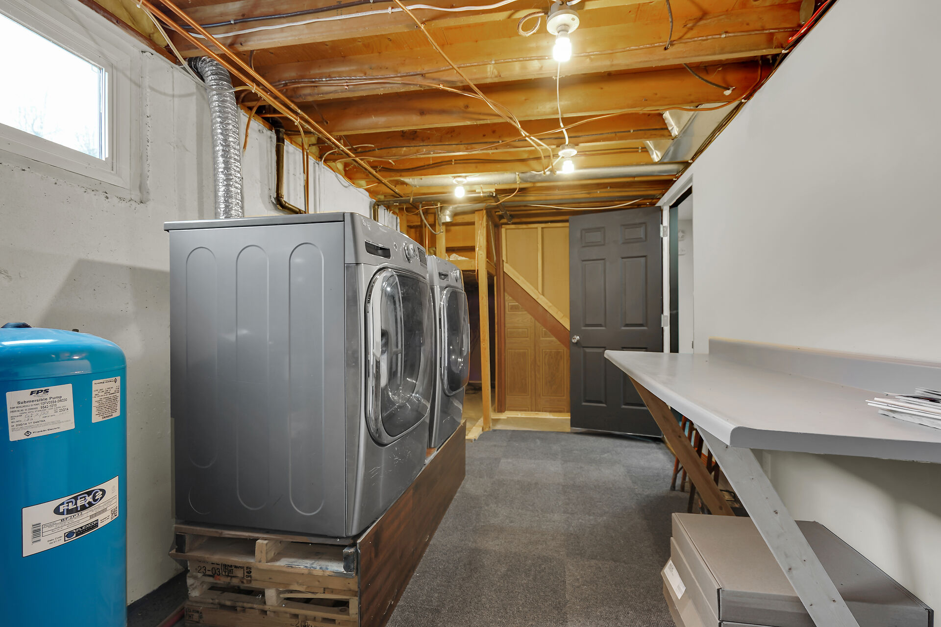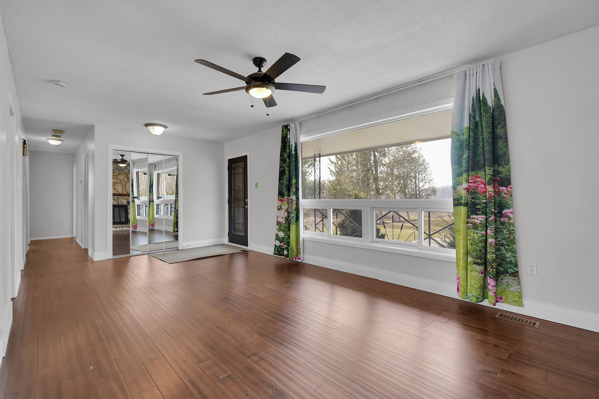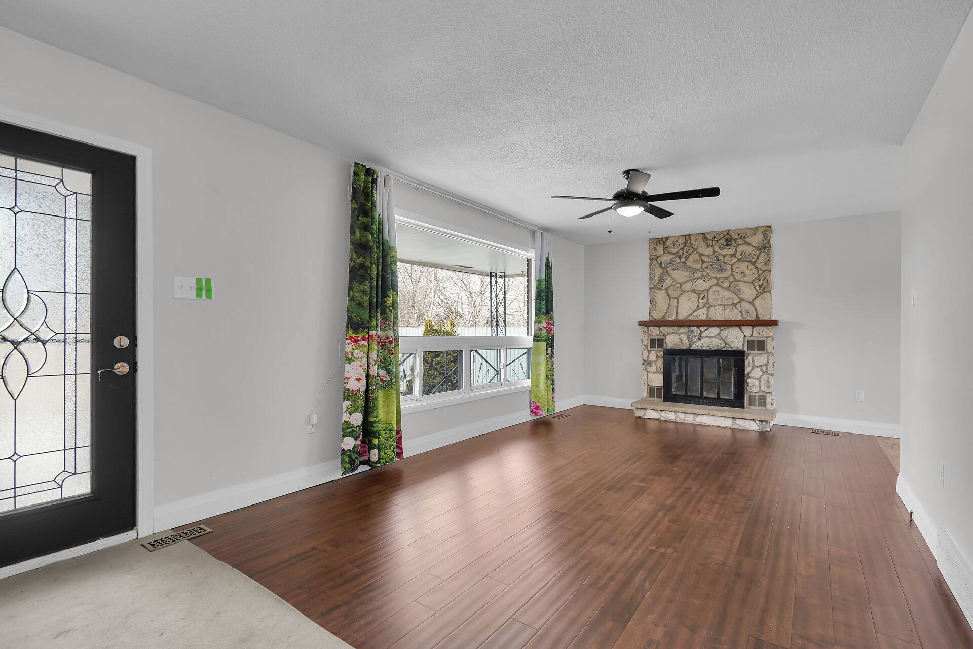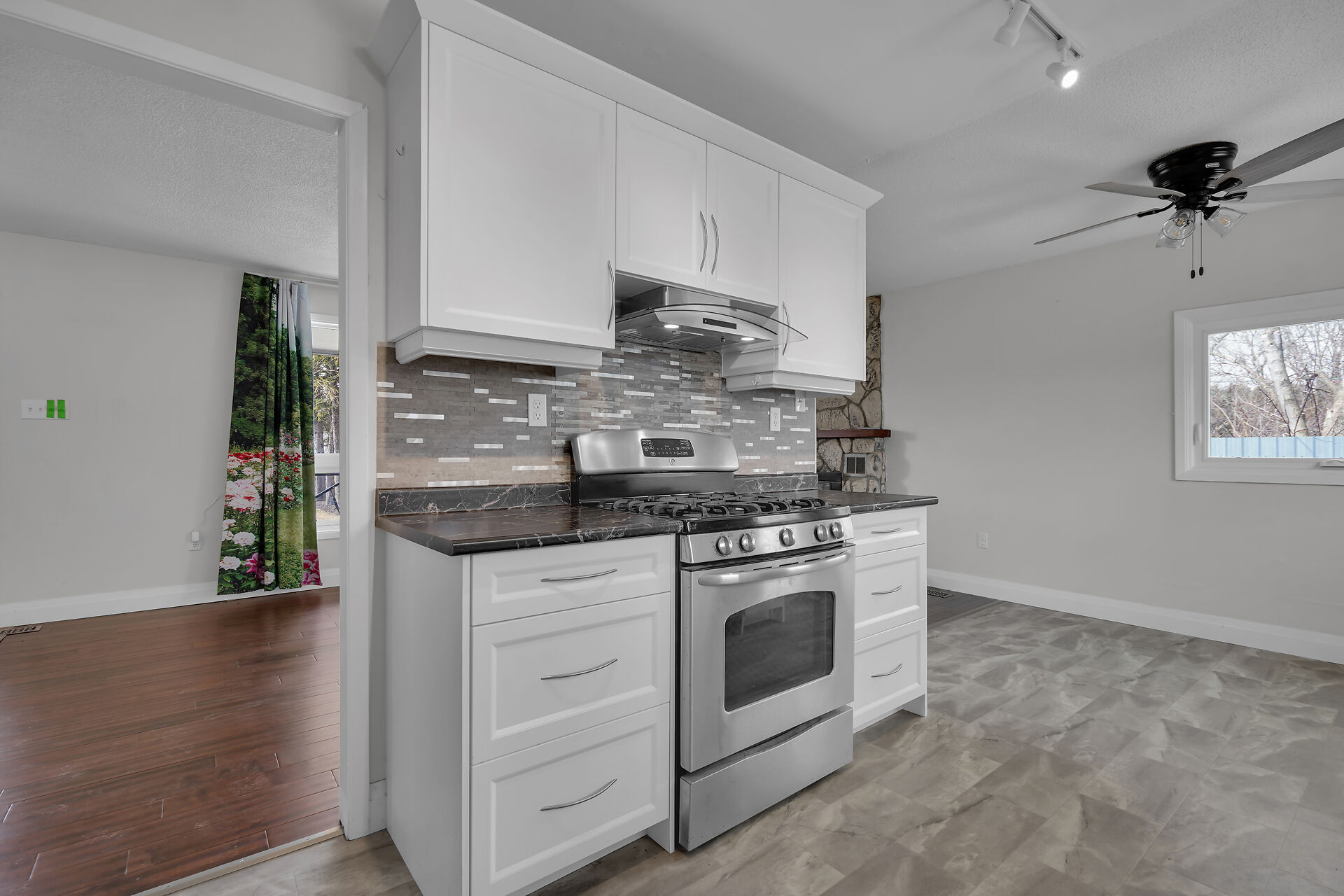 A great little country, cozy brick, home with big garage/shop on not too big of lot, private and short drive to City/Shopping - Updated! The garage is about 25 x 40 ft estimate with concrete floor, hydro and single garage door, rough in for wood stove- plus might fit two cars in tandem! The home has the covered front porch; updated flooring in living room with brick fireplace (as-is); open to dining area then updated kitchen with cabinets & appliances & off the kitchen is convenient door to rear yard. There are 3 carpeted bedrooms on the main. Full updated bathroom with glass doors. The lower level has family room with ba
