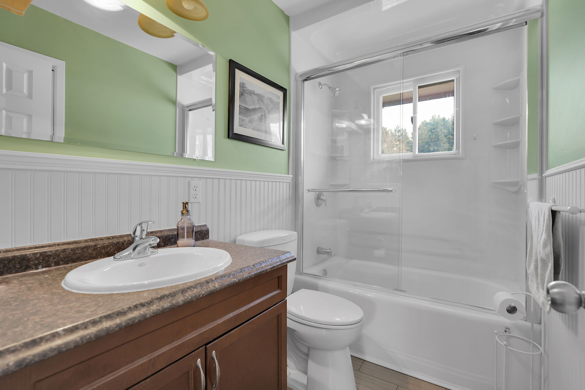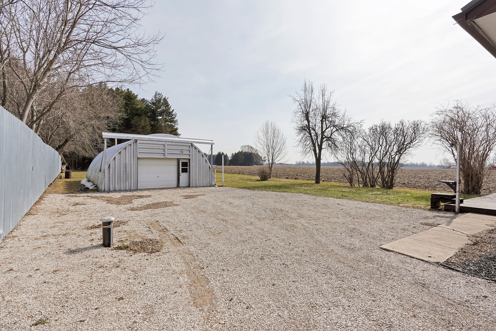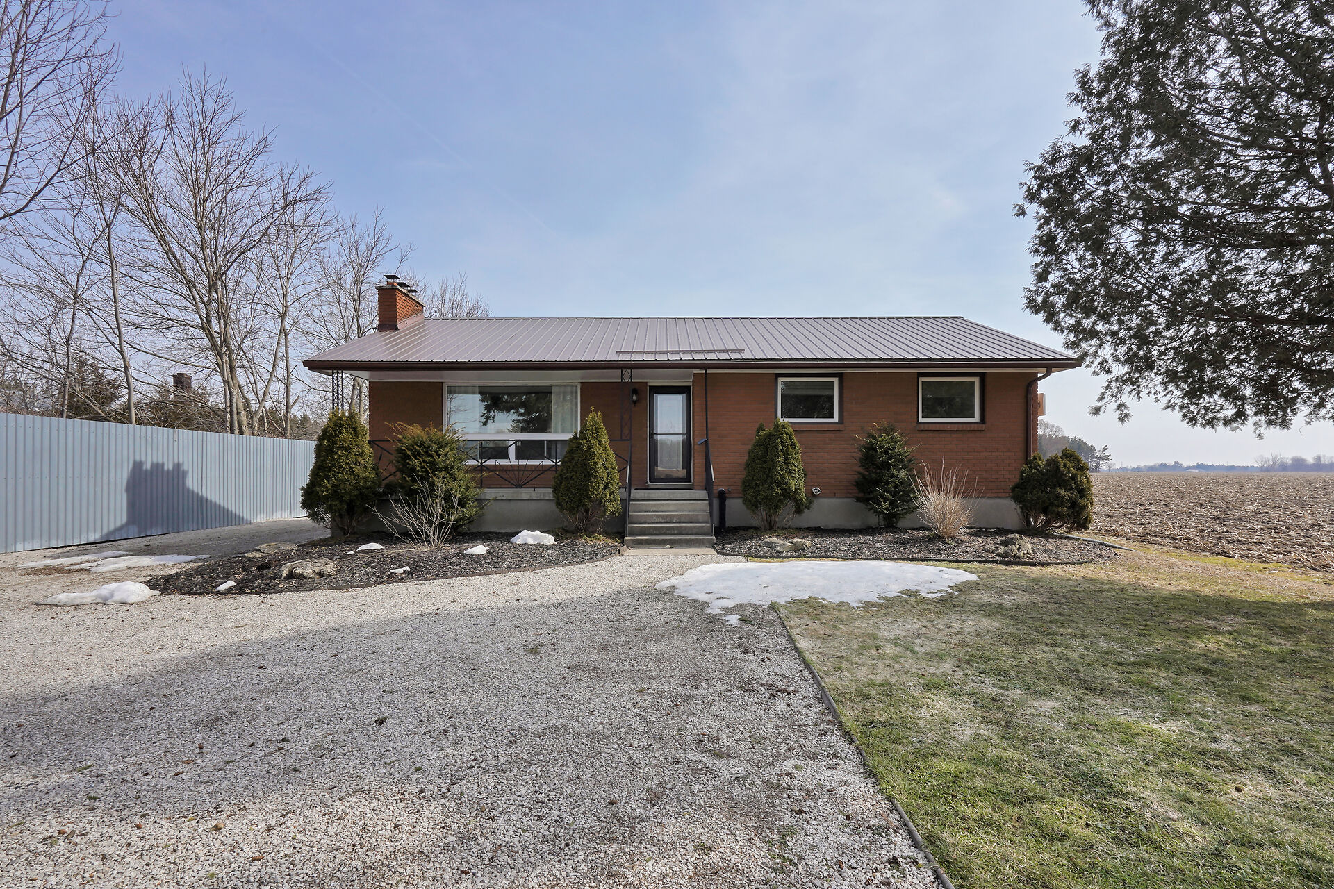 A great little country, cozy brick, home with big garage/shop on not too big of lot, private and short drive to City/Shopping - Updated! The garage is about 25 x 40 ft estimate with concrete floor, hydro and single garage door, rough in for wood stove- plus might fit two cars in tandem! The home has the covered front porch; updated flooring in living room with brick fireplace (as-is); open to dining area then updated kitchen with cabinets & appliances & off the kitchen is convenient door to rear yard. There are 3 carpeted bedrooms on the main. Full updated bathroom with glass doors. The lower level has family room with ba