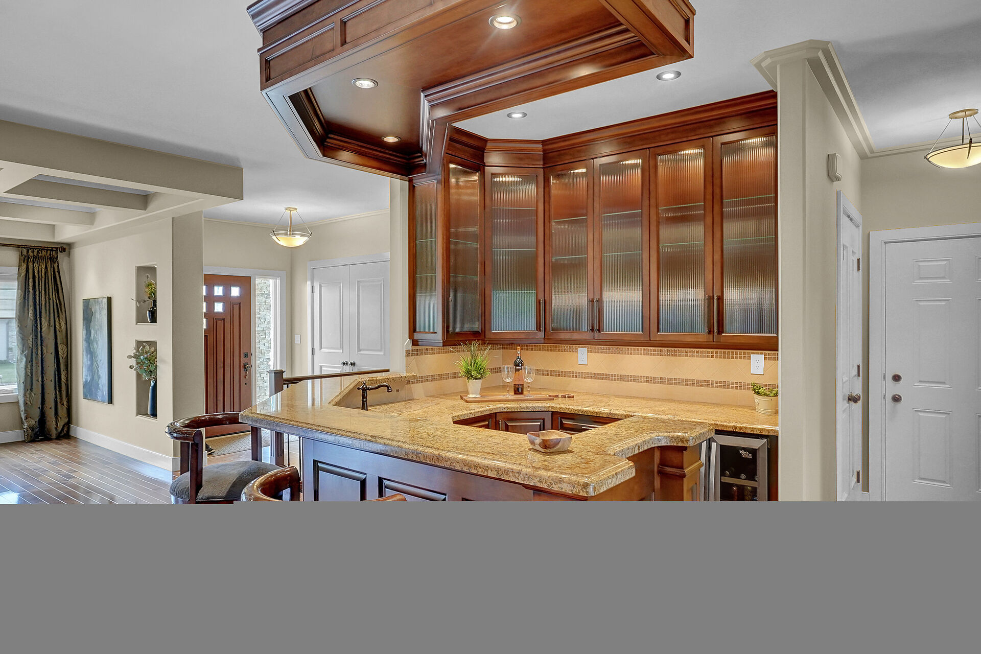 This luxury condo epitomizes refined living. Meticulously designed, it's an unparalleled lifestyle. A stone's throw from the golf course, this gated condo blends privacy & prestige. High-end luxury finishes, in opulent spaces, including 2 x dbl. att. heated garages. The elegant living room features coffered ceiling & gas fireplace, leading to a grand dining room illuminated by a chandelier. Gourmet kitchen boasts Sub-Zero refrigeration, WOLF gas stove & granite countertop island. Casual spaces include seating area & bar. 2 bedrooms & office, on main & 2 bedrooms, family, theater rooms & Den in lower. The primary suite boasts a luxurious bath. Outdoors, enjoy a deck, xeriscaped landscaping. Luxury living!