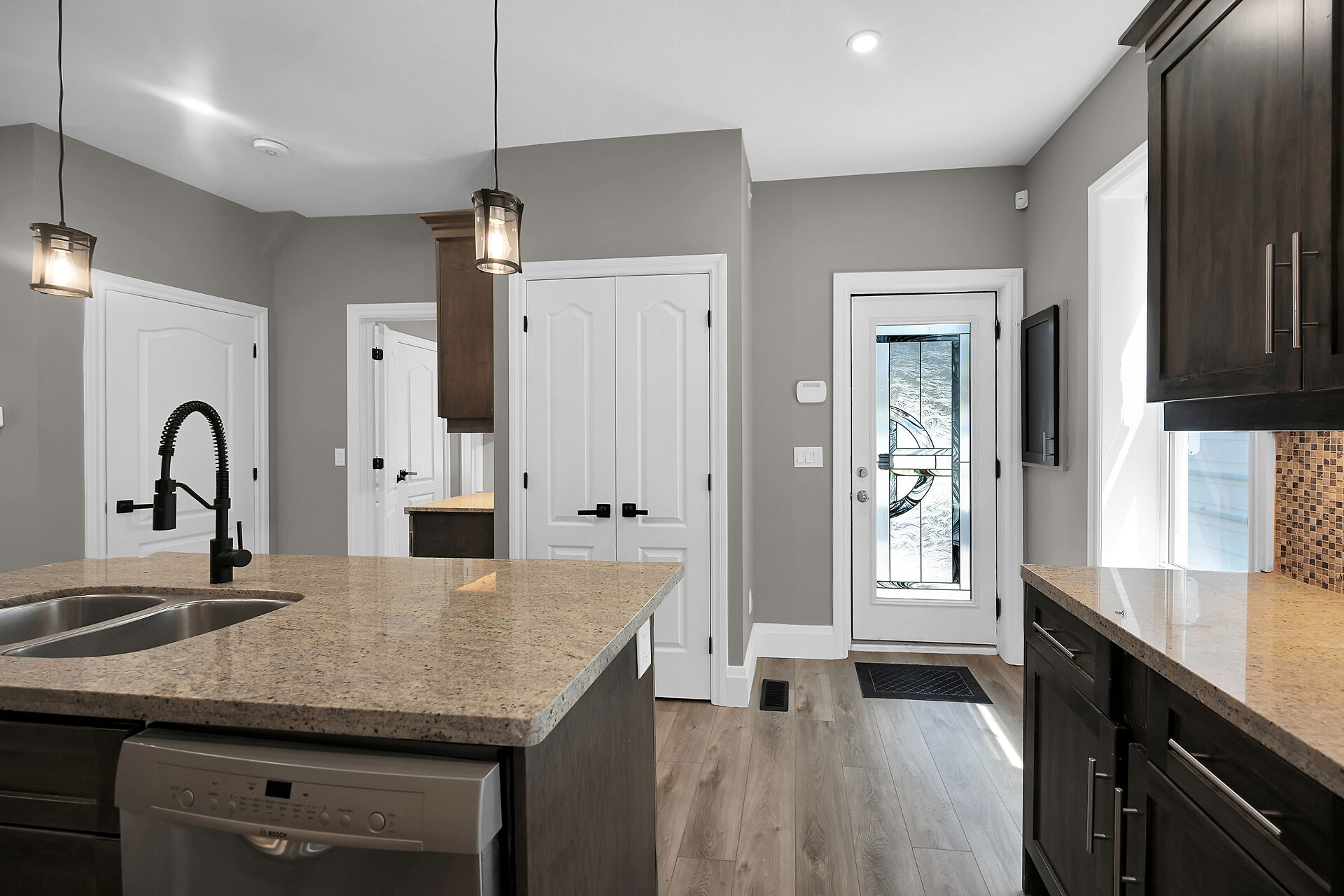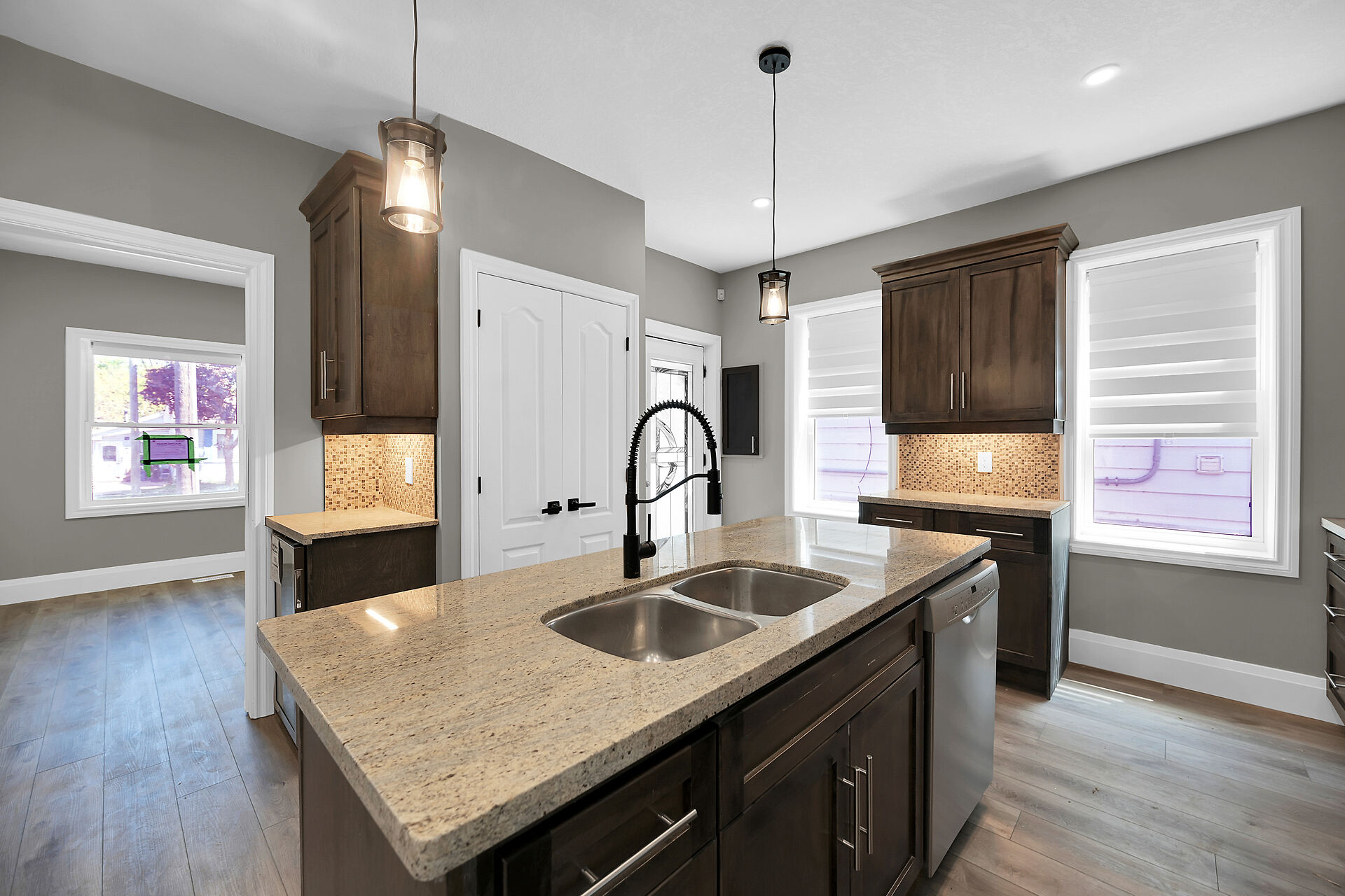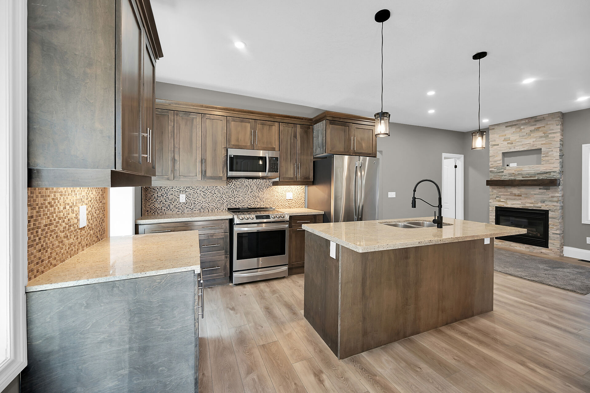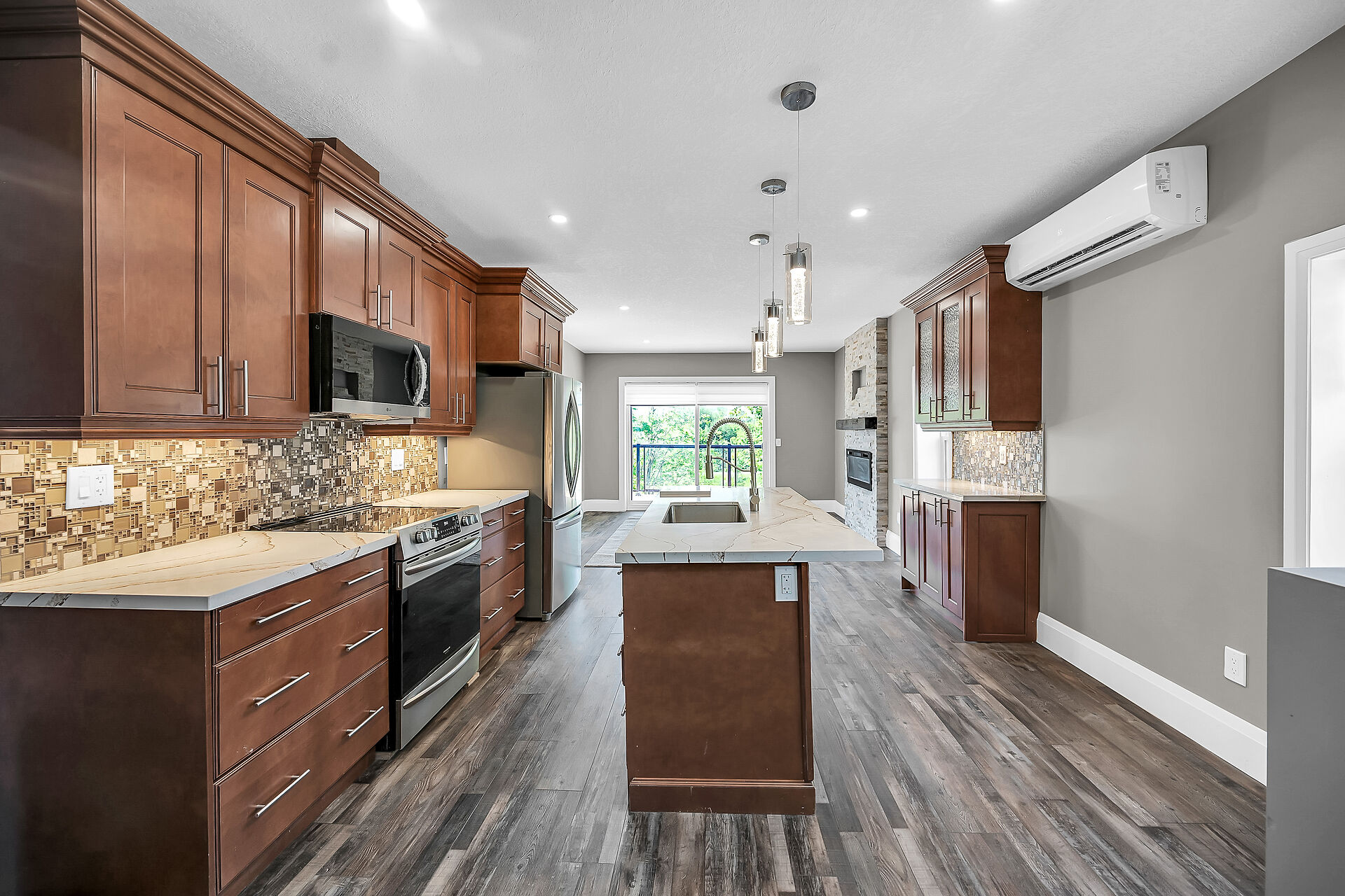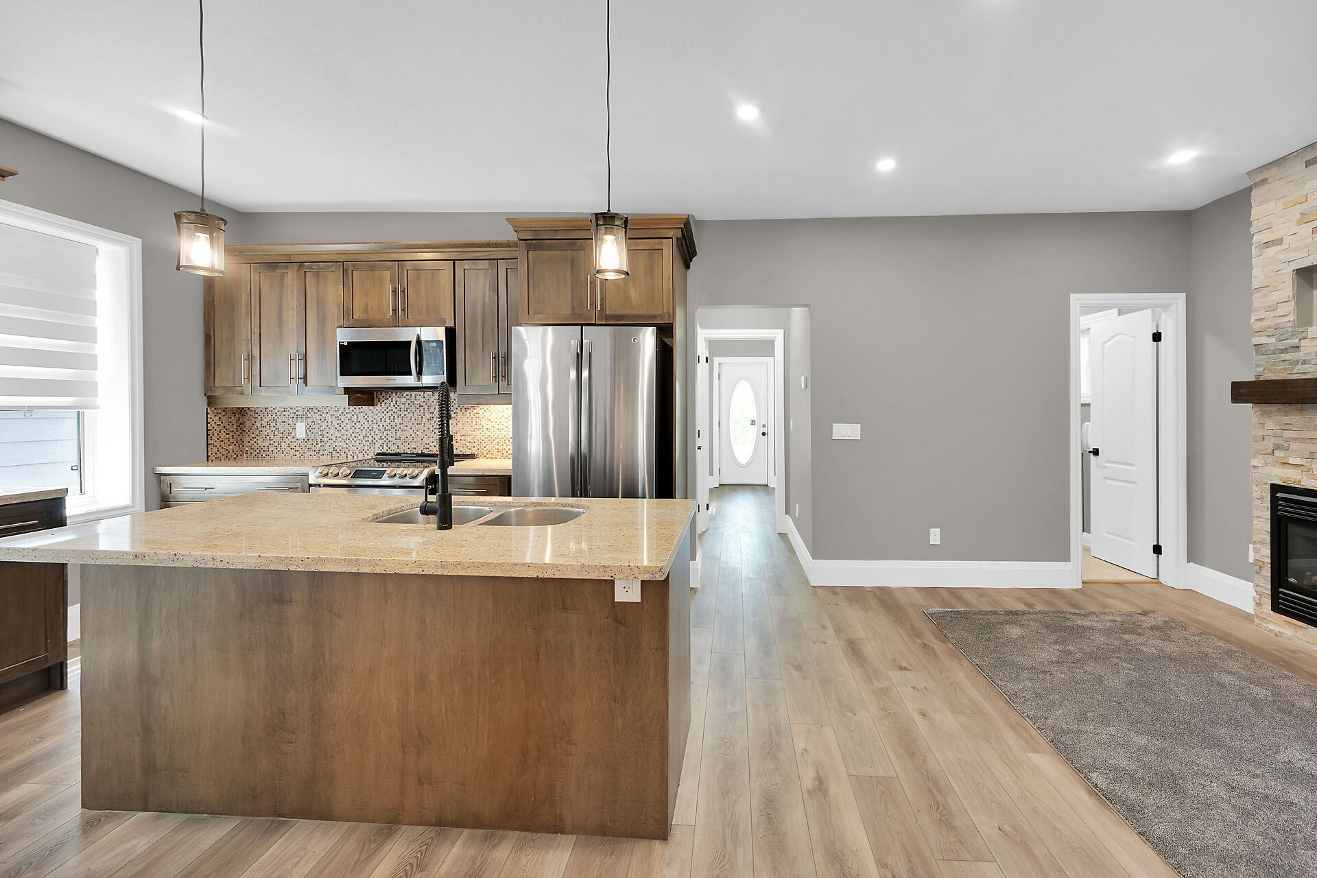 Don't miss this fantastic opportunity to own a spacious, versatile home with a self-contained accessory suite, ideal for extended family. Featuring 4 bedrooms total-2 on the main floor, 2 upstairs, each level has its own entrance, kitchen, laundry, and water softener. The main kitchen boasts granite counters; upstairs offers sleek Corian. Enjoy soaker jet tubs, a cozy gas fireplace on the main level, and an electric fireplace above. The private backyard backs onto the Grand River with scenic trails just steps away. Perfect for multi-generational living in a beautiful natural setting!