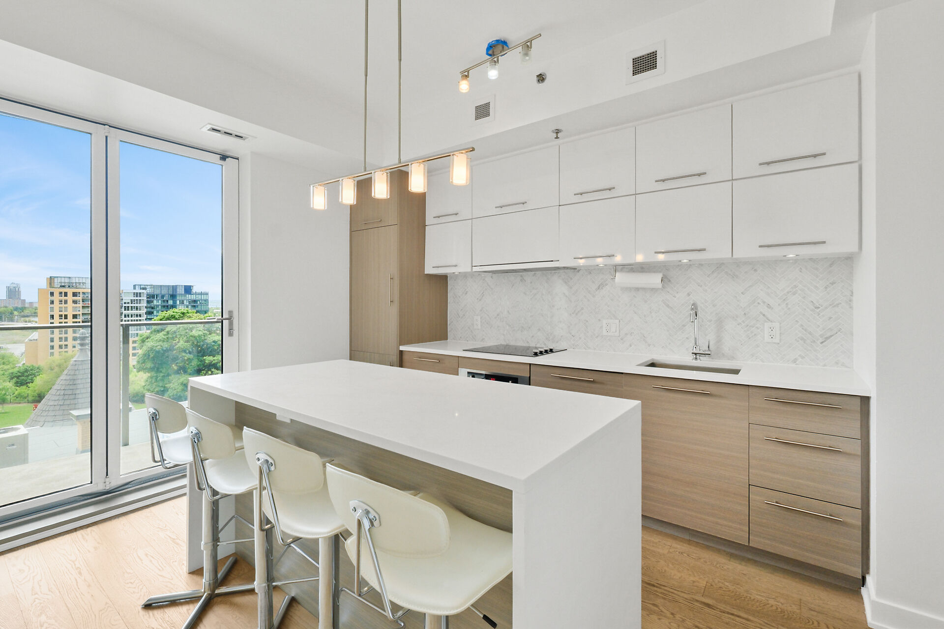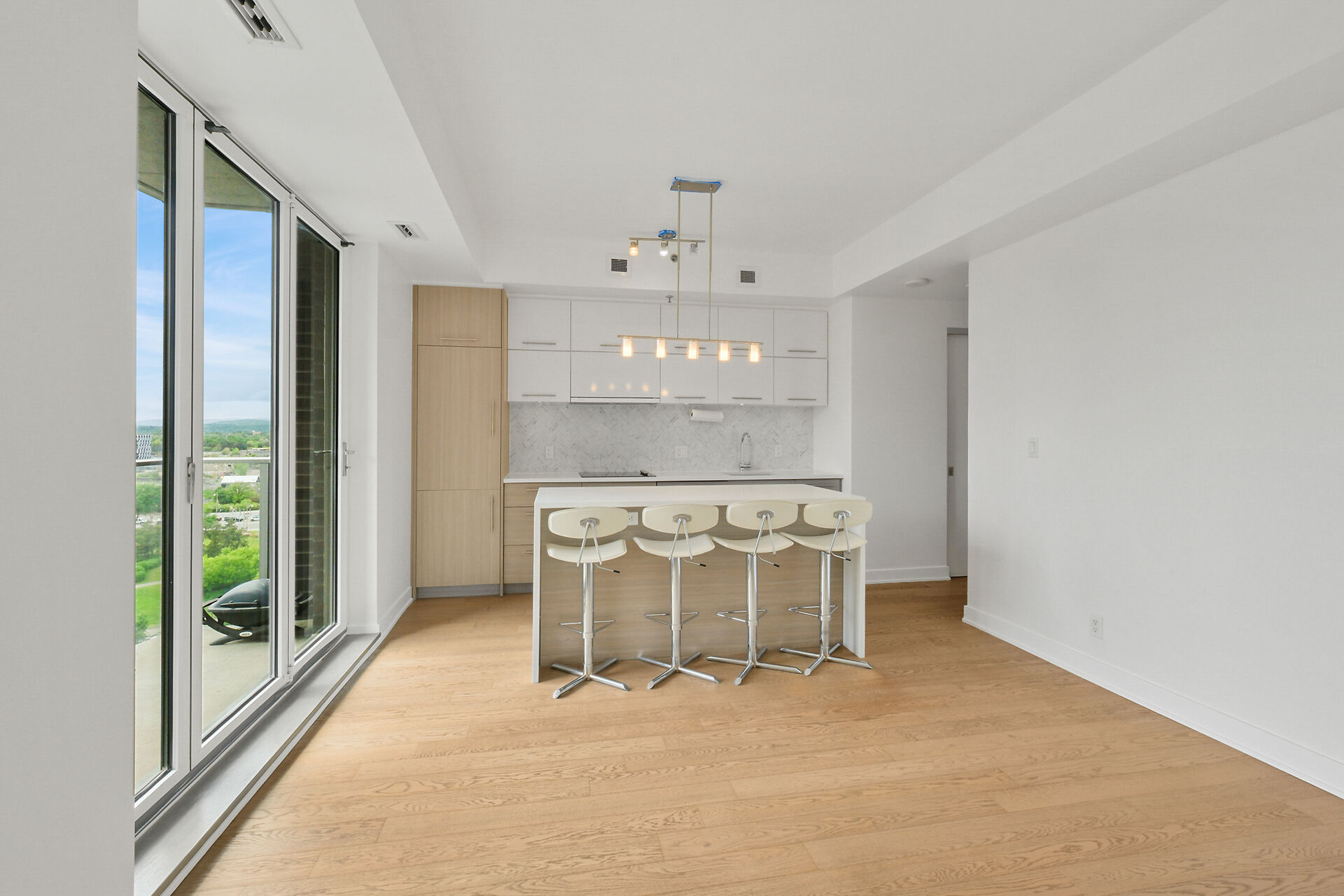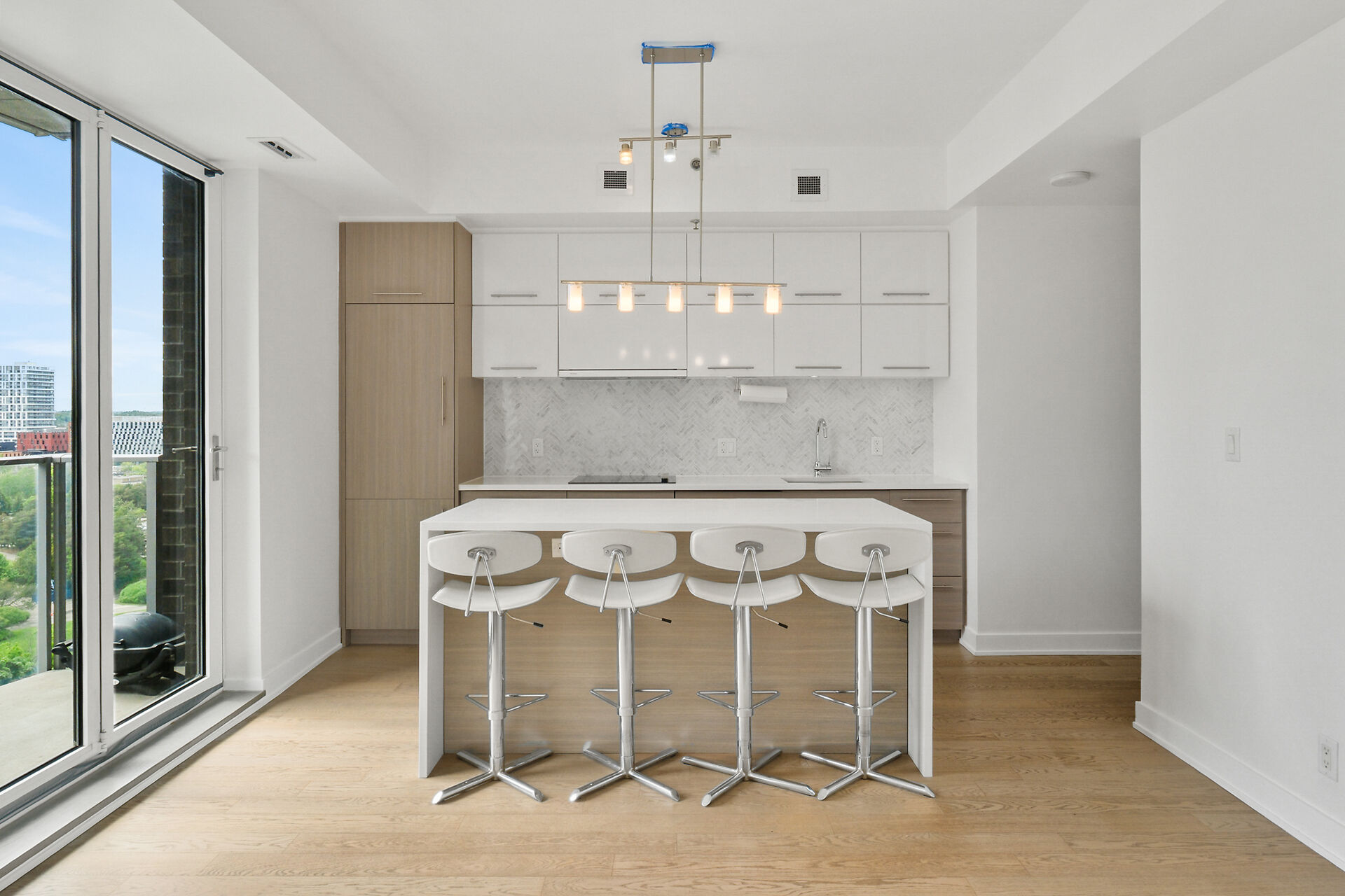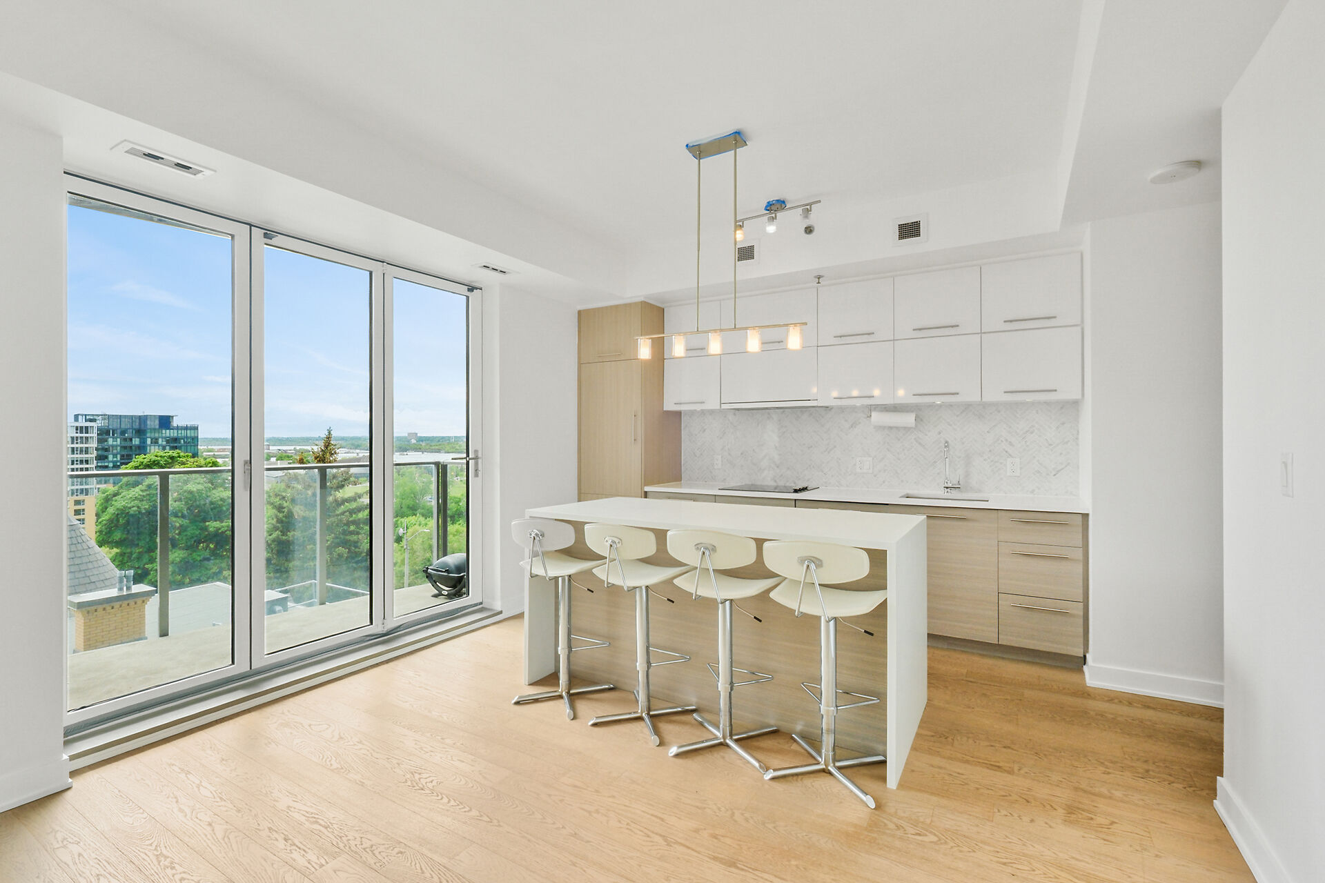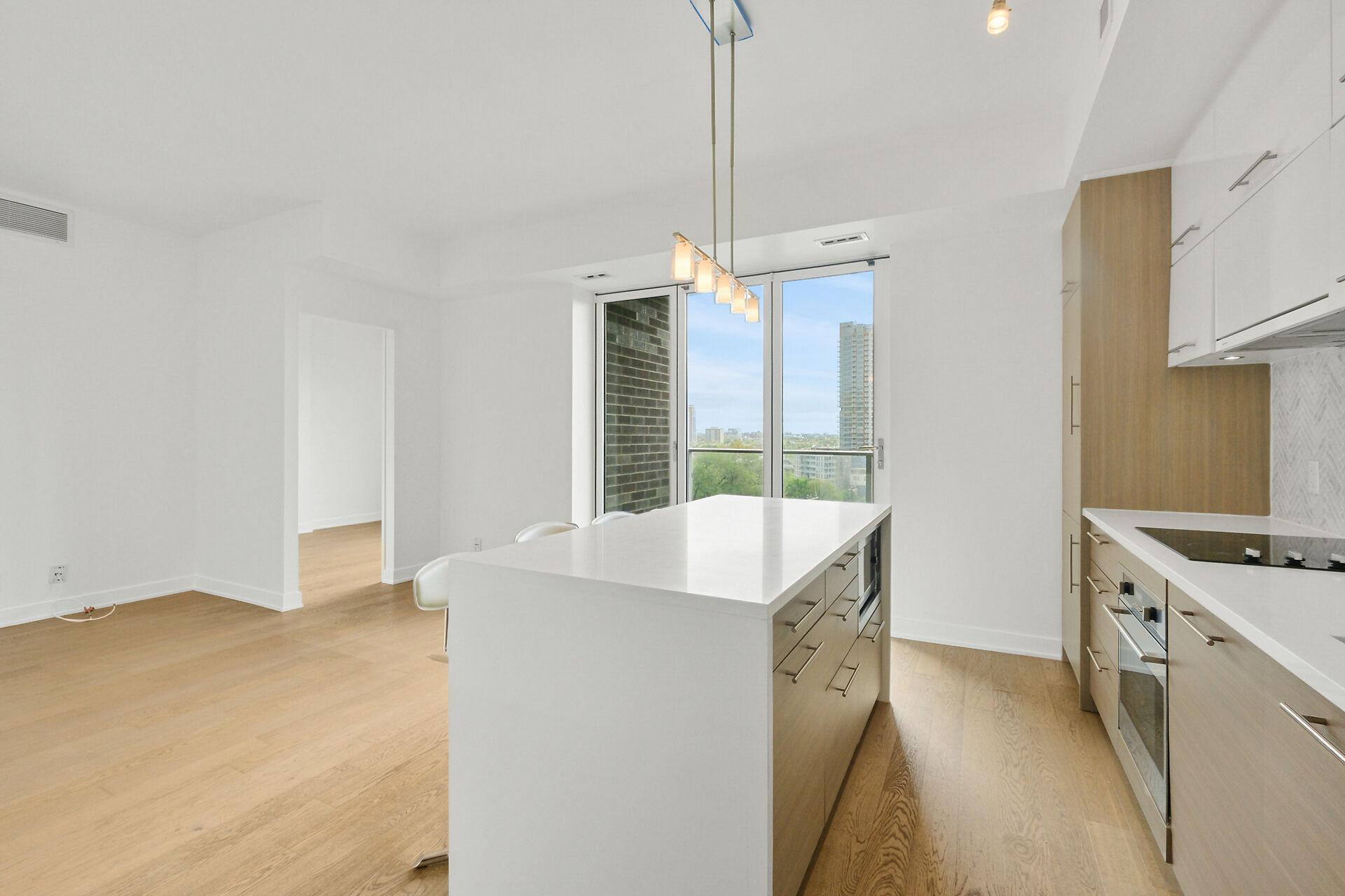 Take in the breathtaking views of the Ottawa River, the Gatineau Hills, and glorious sunsets. The LRT and transit are within easy steps of your front door. The Tempo model is stylishly finished, complete with an open concept kitchen /living area, a bedroom, walk-in-closet, 3 piece bathroom, AND a private den. . The European-styled, integrated kitchen has electric cooktop, stainless steel fronts and plenty of complimenting cabinetry and counterspace. Gleaming kitchen countertops, sparkling ceramic backsplash. The expansive island doubles as a breakfast bar with seating for four. A western exposure bathes the unit in natural daylight. Enjoy a comprehensive range of top-notch amenities!