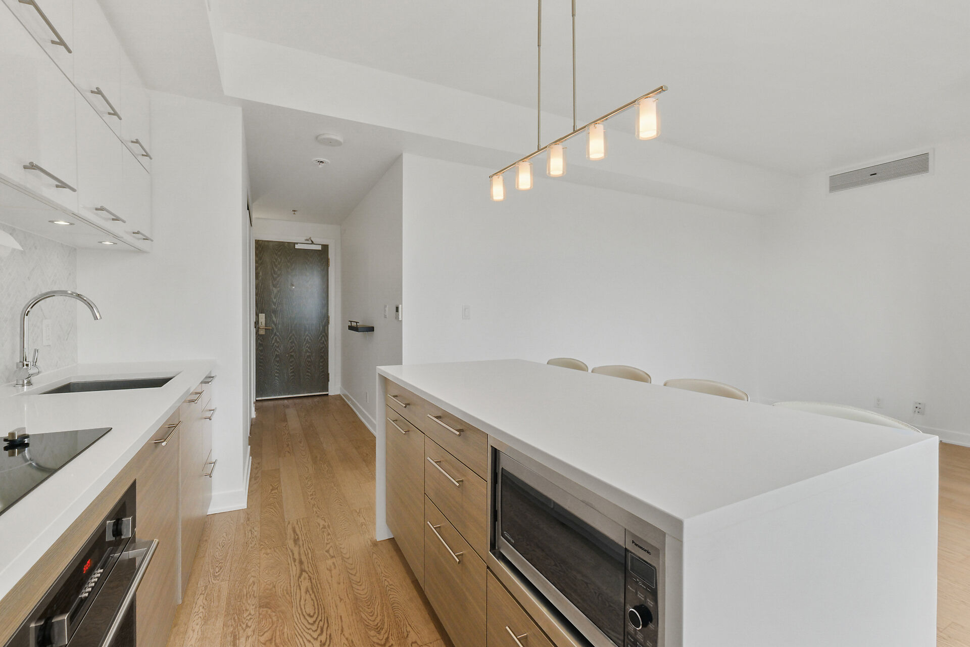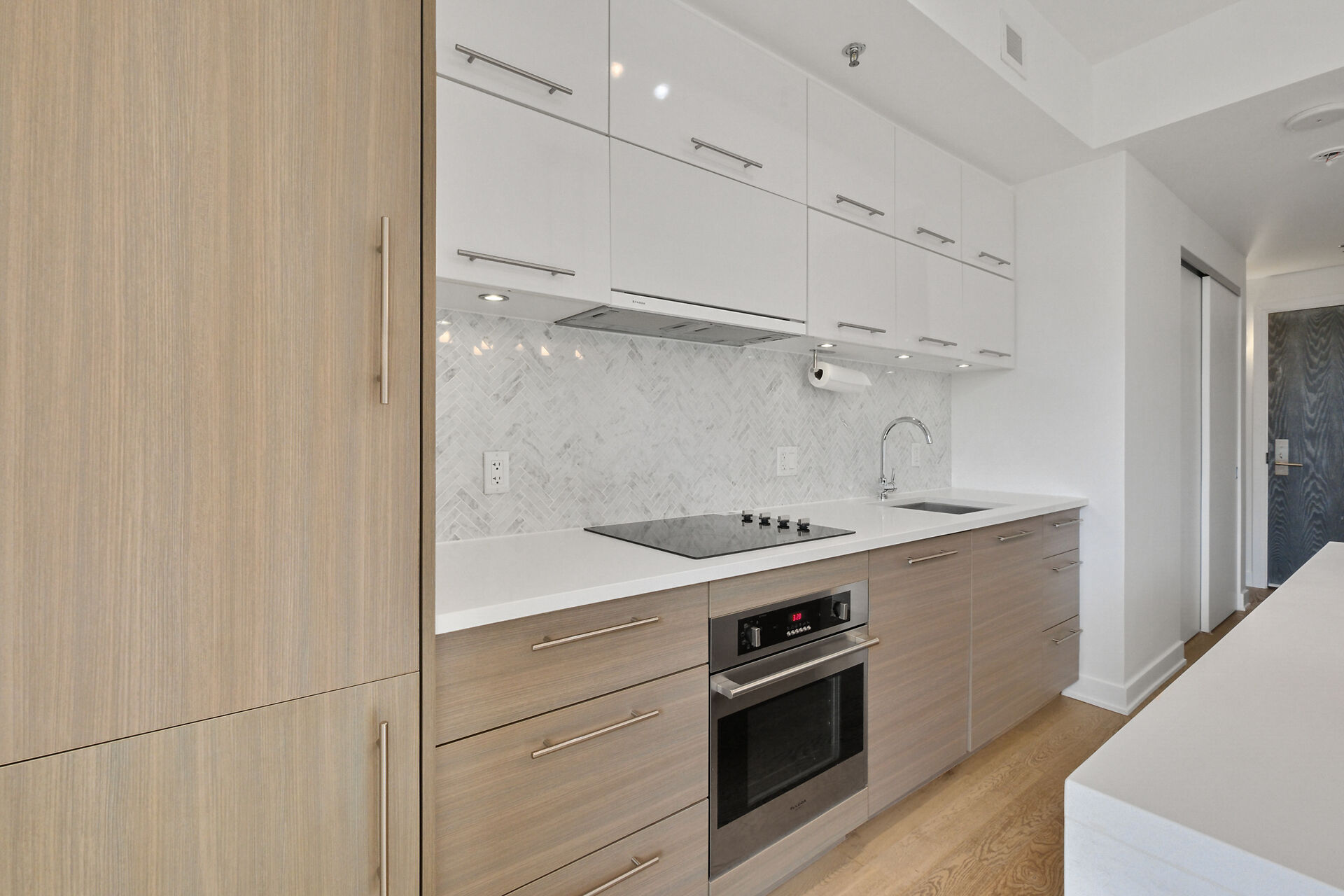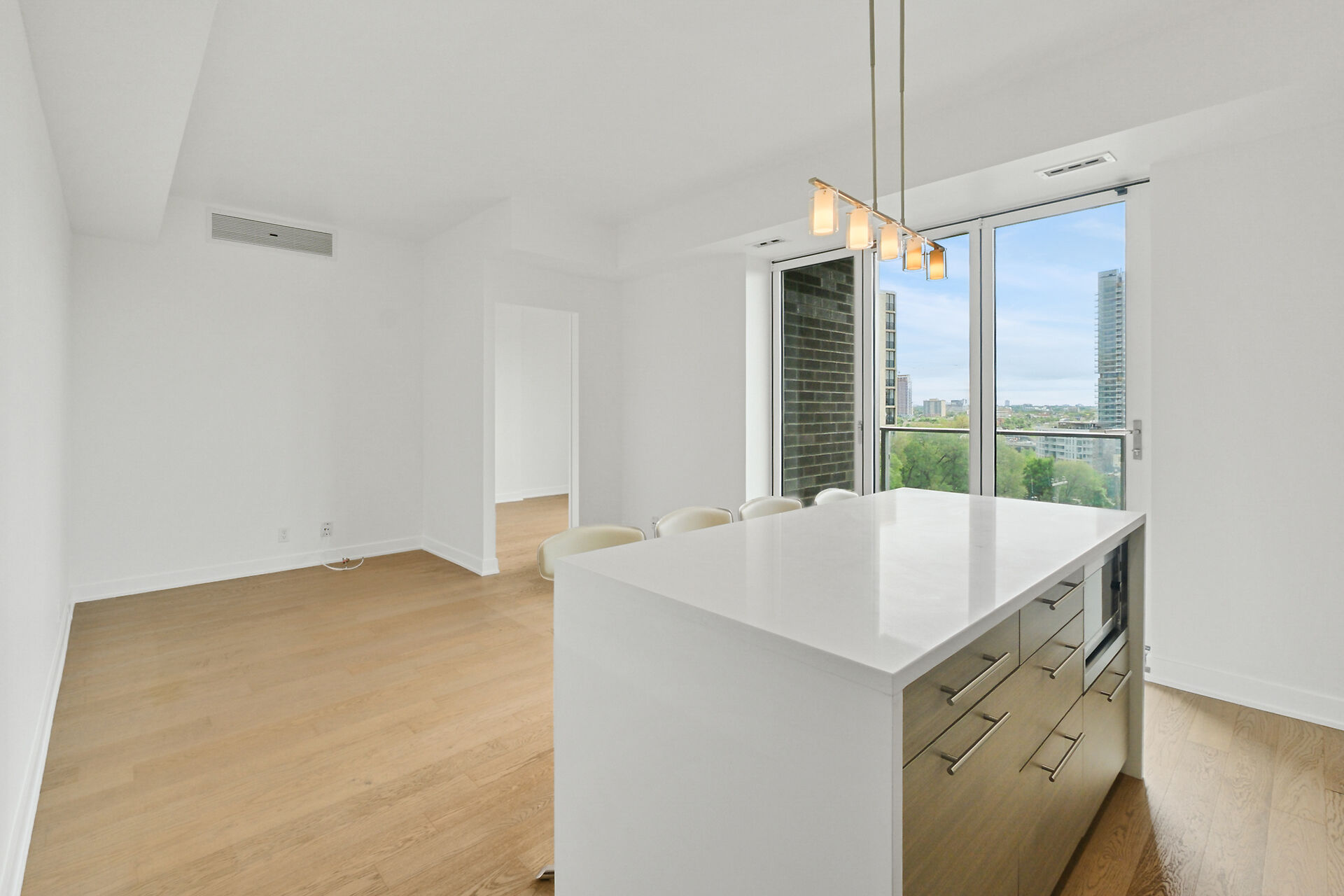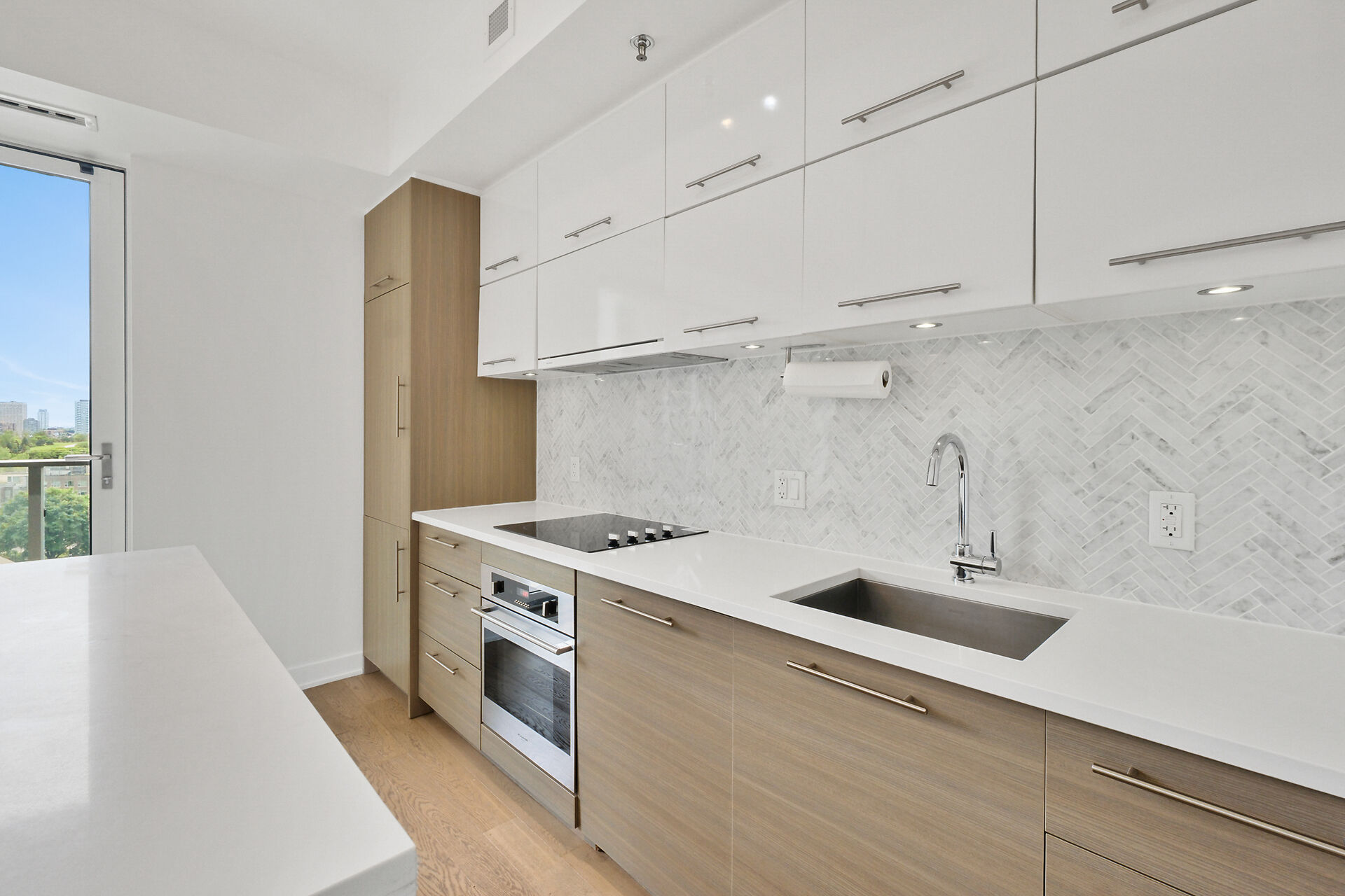 Take in the breathtaking views of the Ottawa River, the Gatineau Hills, and glorious sunsets. The LRT and transit are within easy steps of your front door. The Tempo model is stylishly finished, complete with an open concept kitchen /living area, a bedroom, walk-in-closet, 3 piece bathroom, AND a private den. . The European-styled, integrated kitchen has electric cooktop, stainless steel fronts and plenty of complimenting cabinetry and counterspace. Gleaming kitchen countertops, sparkling ceramic backsplash. The expansive island doubles as a breakfast bar with seating for four. A western exposure bathes the unit in natural daylight. Enjoy a comprehensive range of top-notch amenities!