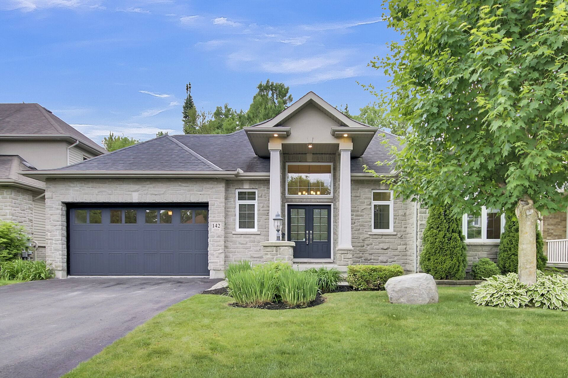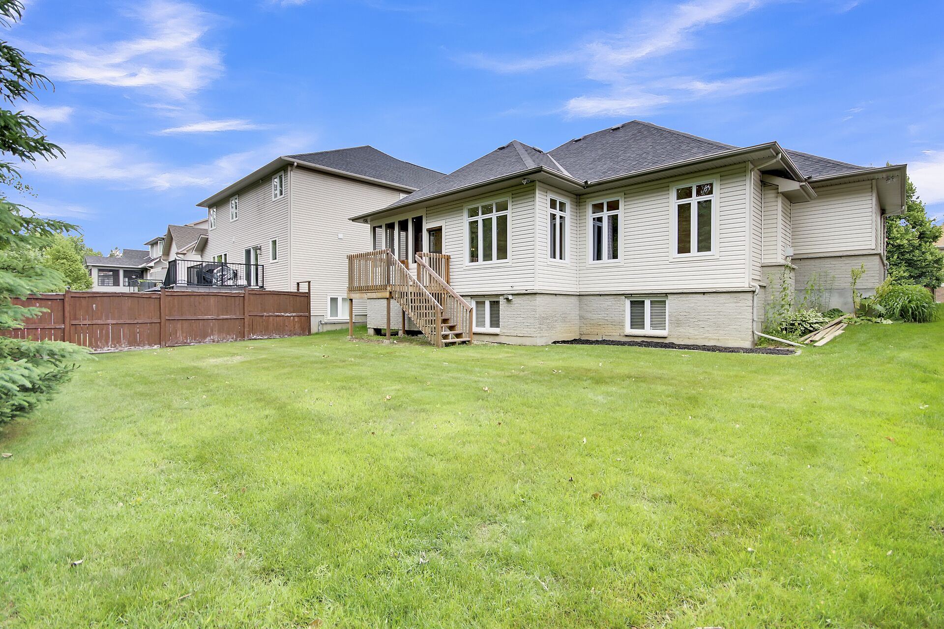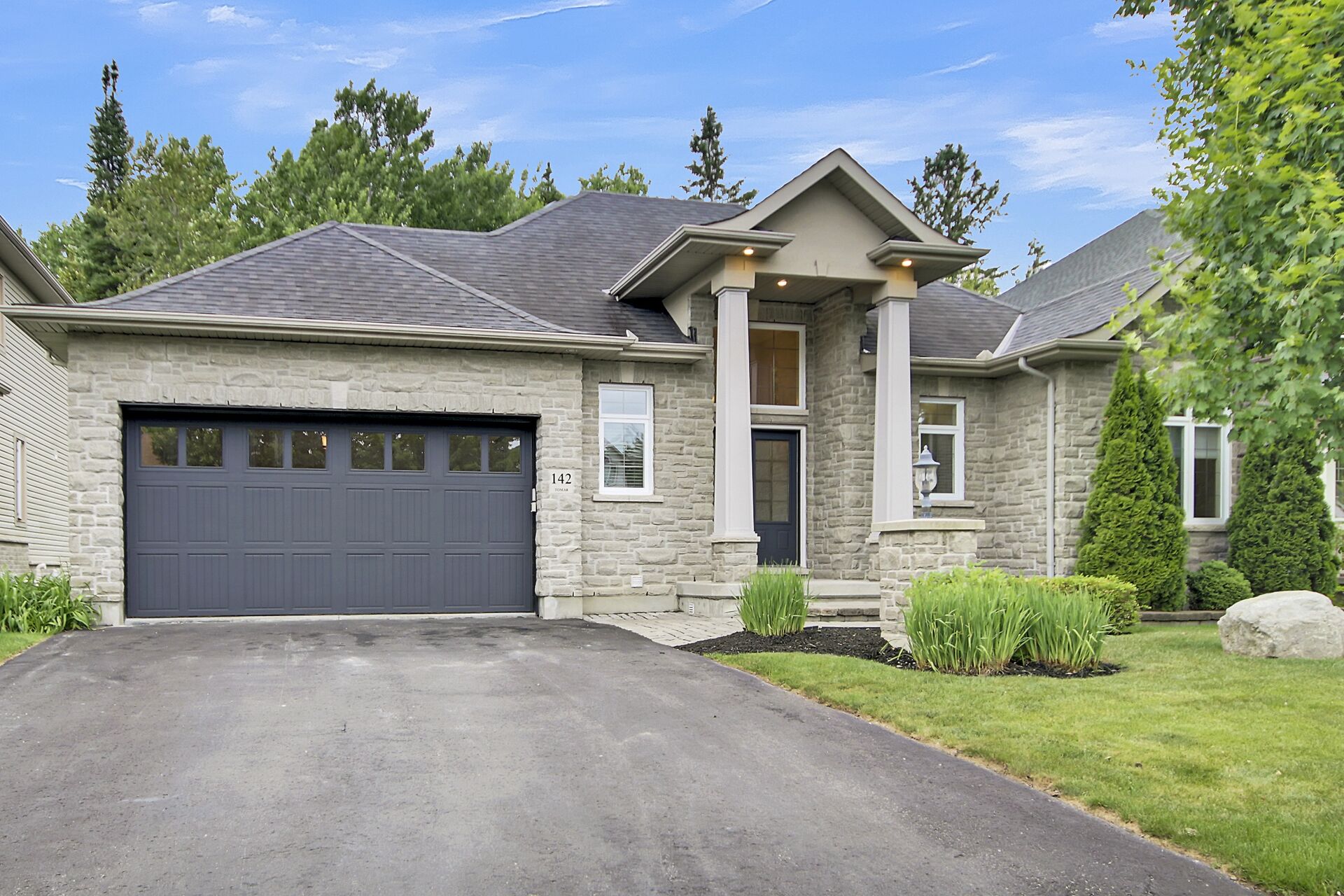 Situated on a premium lot w/NO REAR NEIGHBOURS and incredible curb appeal with full stone facade and signature "chalet styled" roof lines... this exceptionally well maintained, original owner kept home features a stunning 2+1 bedrm design that is "THEEE" perfect choice for downsizers, empty nesters or even professional couples!! lofty 11' and 9' ceil,refinished hardwd floors, staircase & handrail,kitchen w/upgraded cabinetry, granite counters,S.S appliances and walk in pantry, eating area has direct access to a 15'x7' screened in porch and separate deck,pool sized yard backing onto private wooded area. Fin.recrm,3rd bedrm,bathrm + storagerm in L/L! Full irrigation system.A must see for bungalow lovers!!