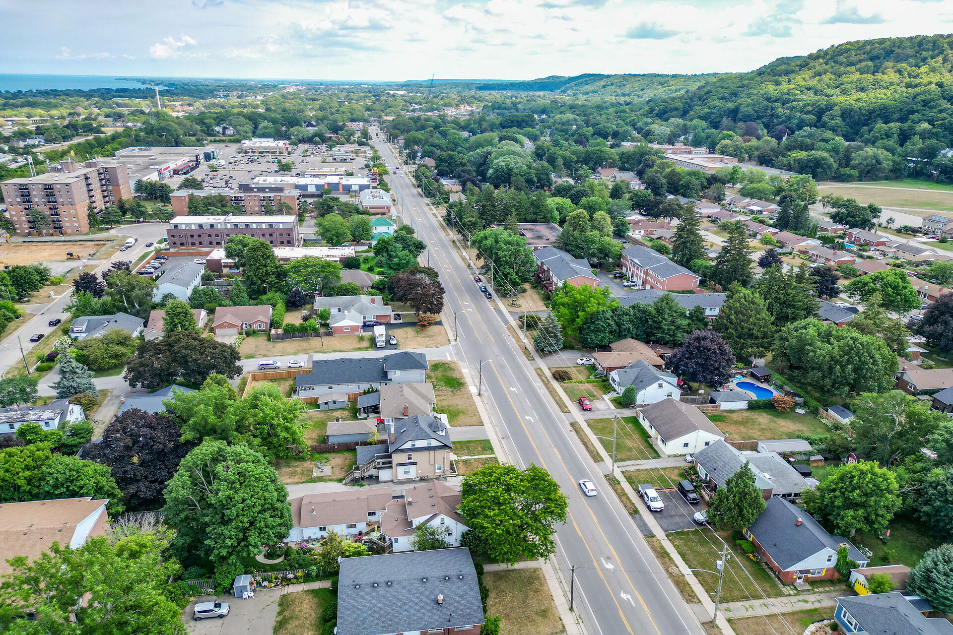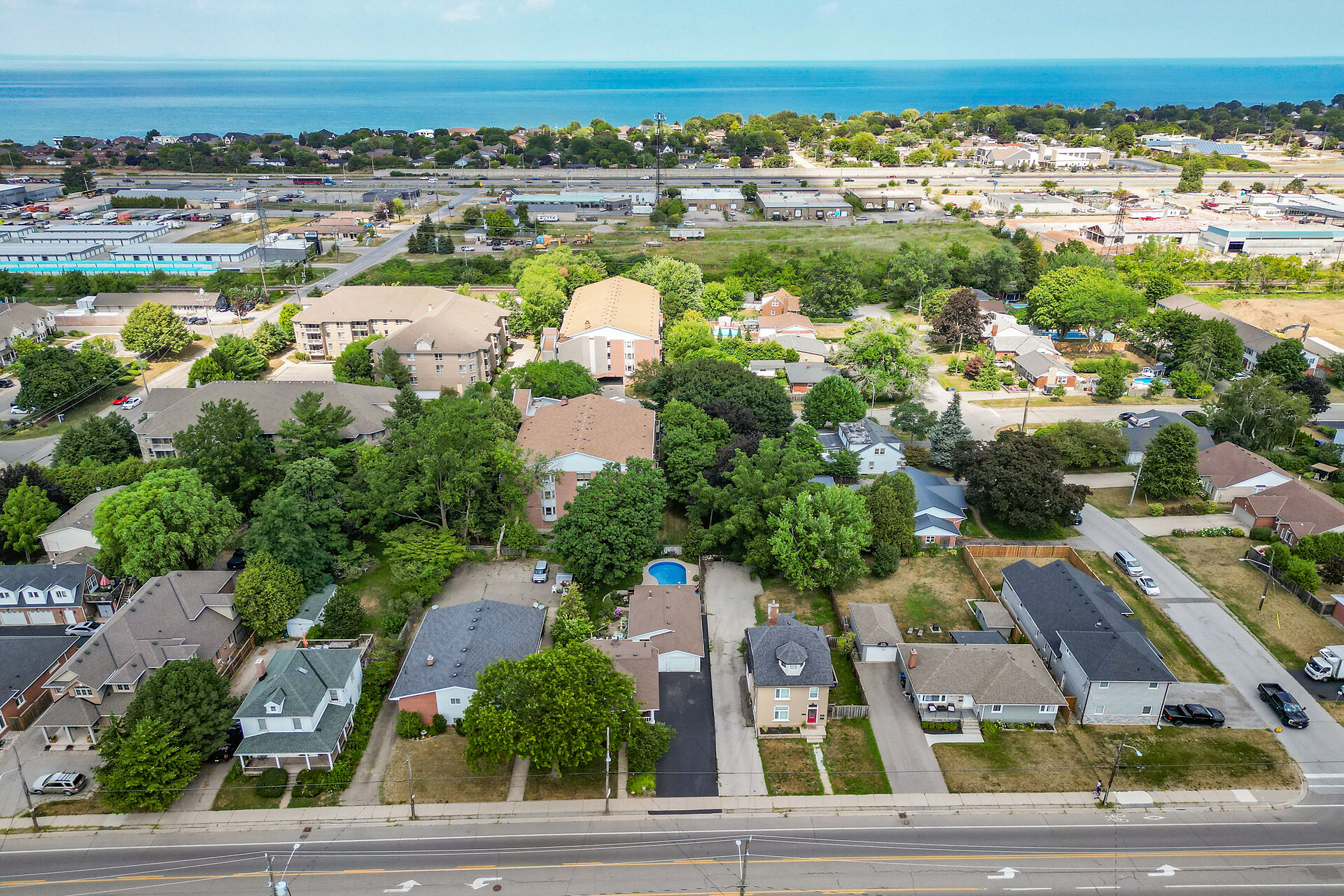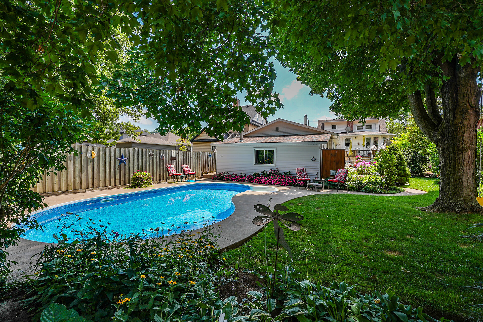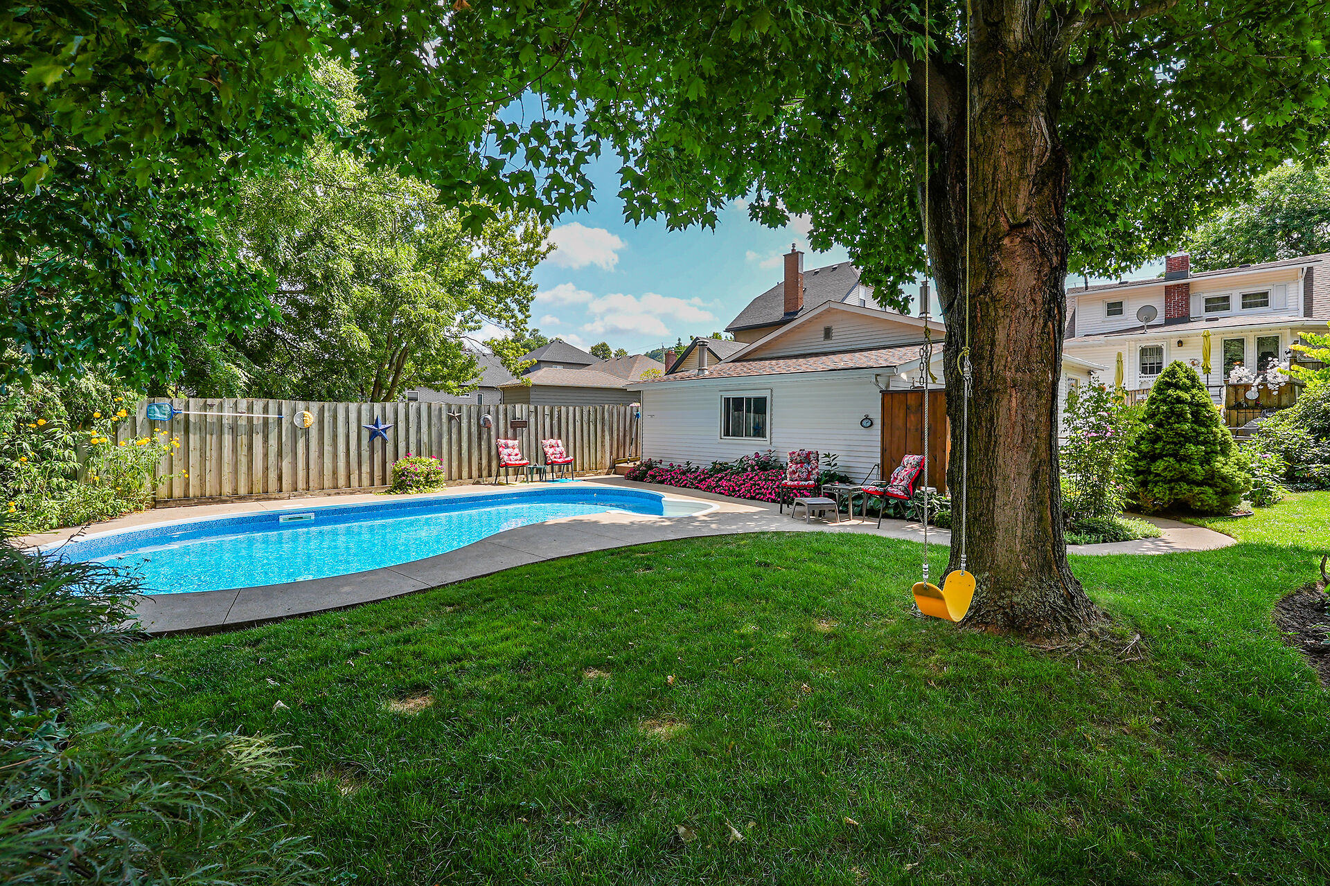 This gracious Grimsby home blends historic charm with modern comfort. Hardwood floors flow through the open-concept main level, featuring an updated eat-in kitchen and a warm family room with a brick gas fireplace. The elegant living/dining room offers crown moulding, an electric fireplace, and abundant natural light. Upstairs are two inviting bedrooms, including a primary with walk-in closet. The lower level adds a cozy rec room and storage. Outside, a private "secret garden" awaits with an inground pool, outdoor shower, multiple decks, and a change room. A large outbuilding offers a heated garage, office, and workshop. Minutes from shops, dining, and amenities with easy highway access.