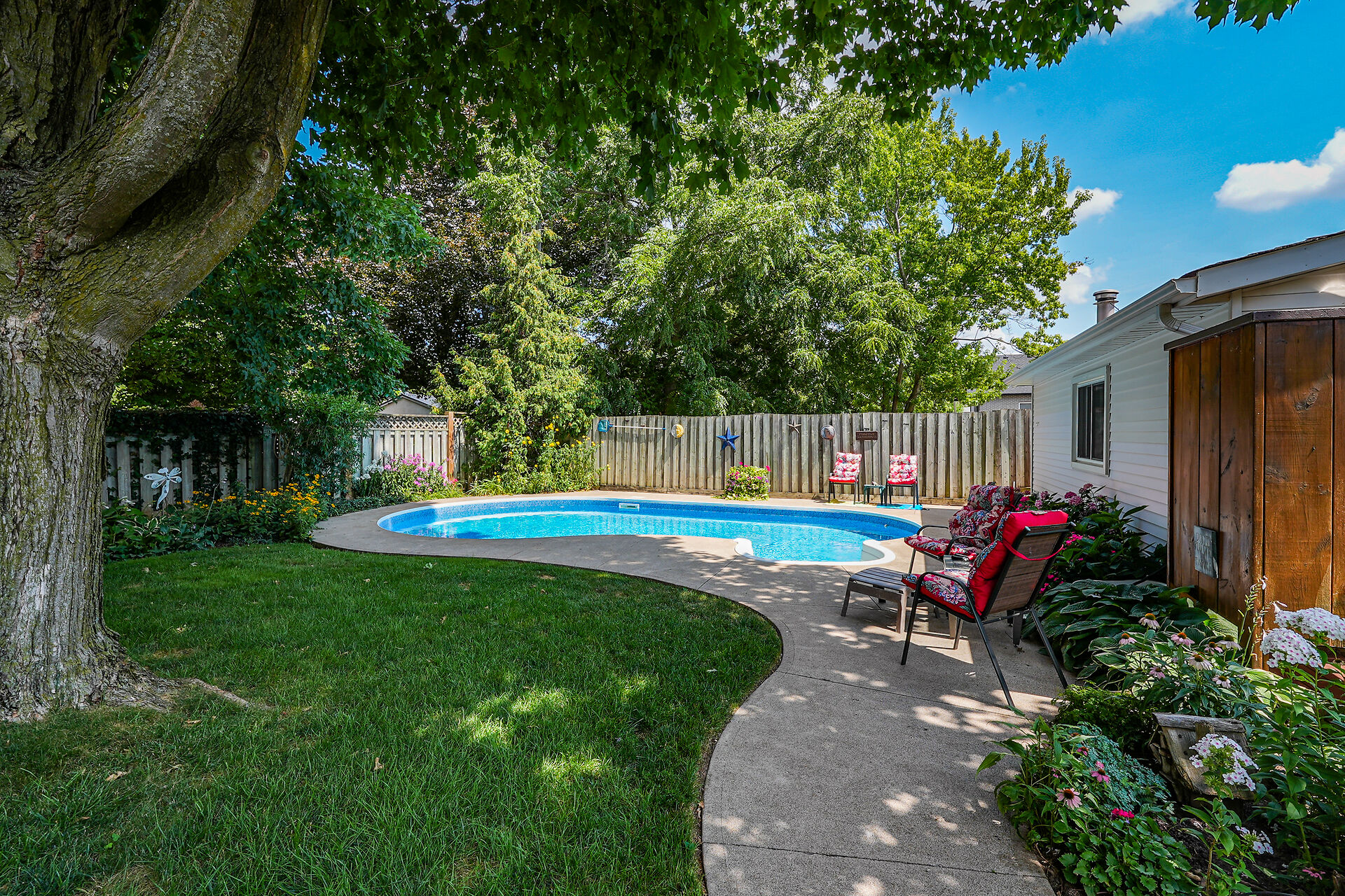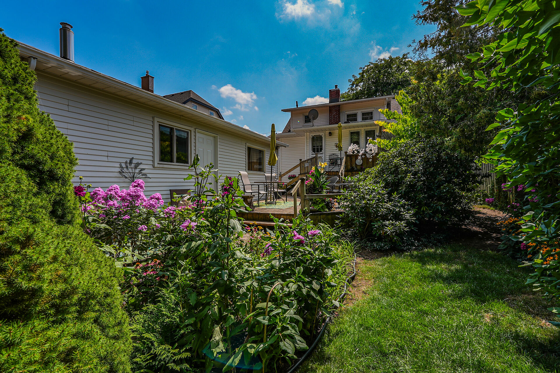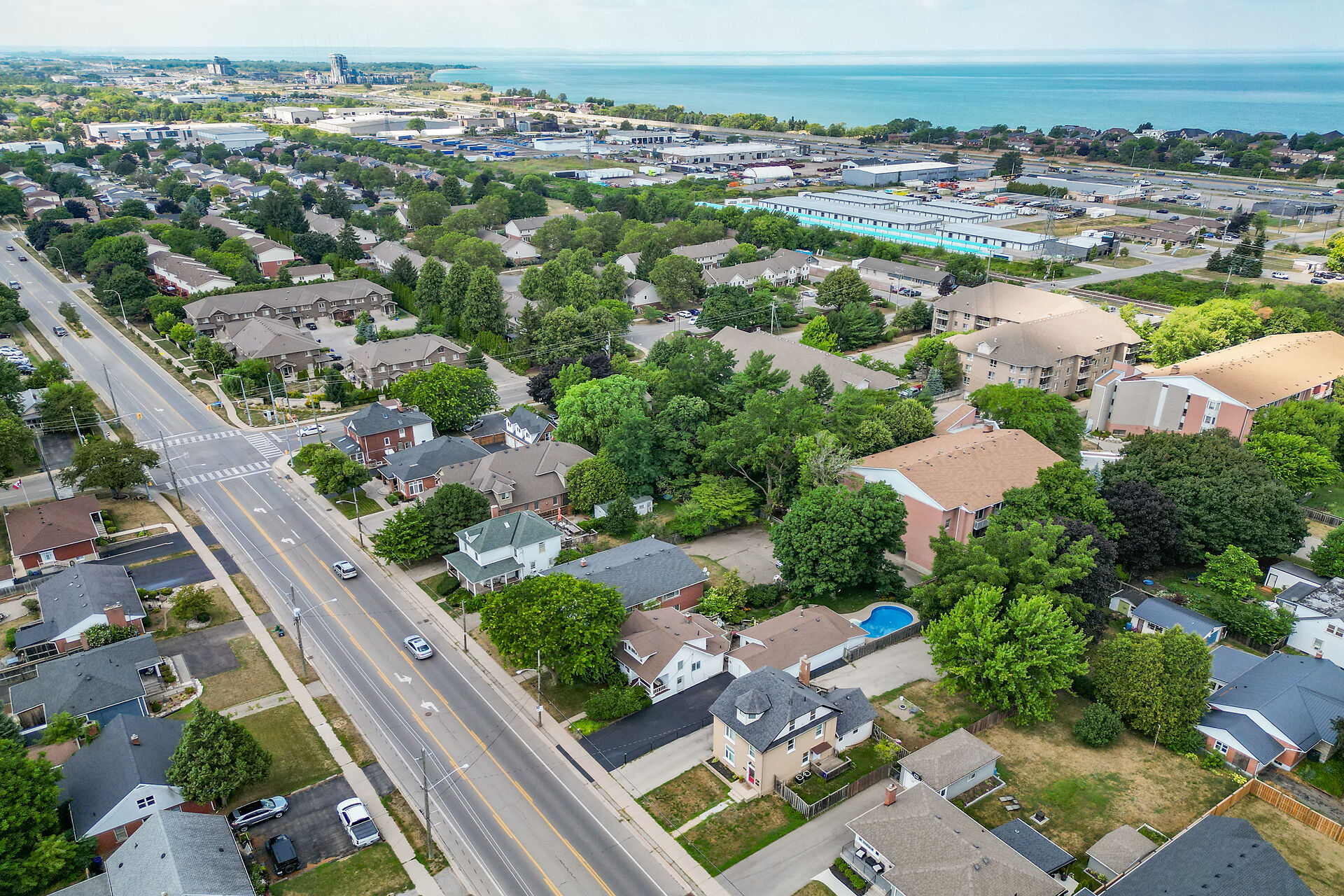 This gracious Grimsby home blends historic charm with modern comfort. Hardwood floors flow through the open-concept main level, featuring an updated eat-in kitchen and a warm family room with a brick gas fireplace. The elegant living/dining room offers crown moulding, an electric fireplace, and abundant natural light. Upstairs are two inviting bedrooms, including a primary with walk-in closet. The lower level adds a cozy rec room and storage. Outside, a private "secret garden" awaits with an inground pool, outdoor shower, multiple decks, and a change room. A large outbuilding offers a heated garage, office, and workshop. Minutes from shops, dining, and amenities with easy highway access.