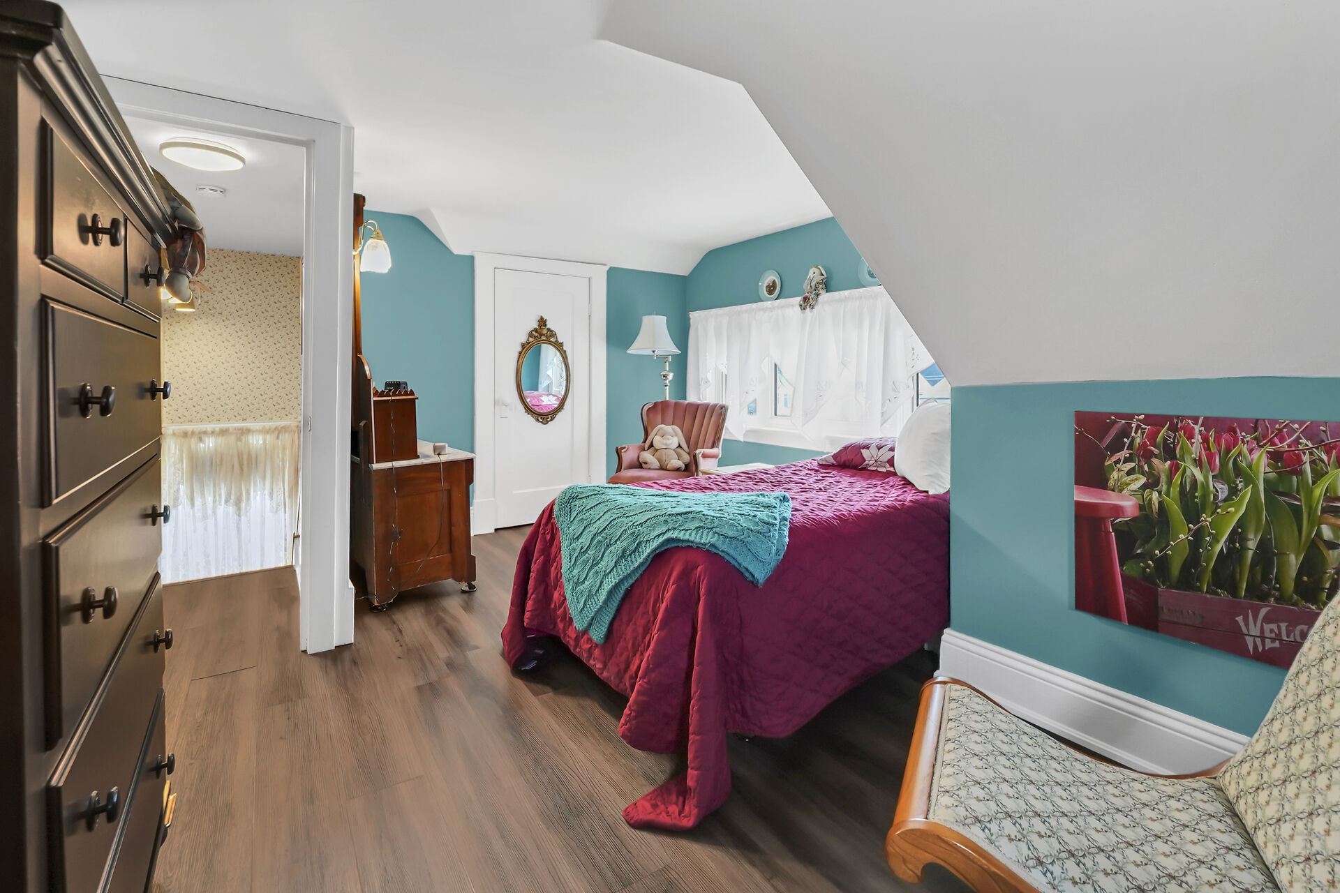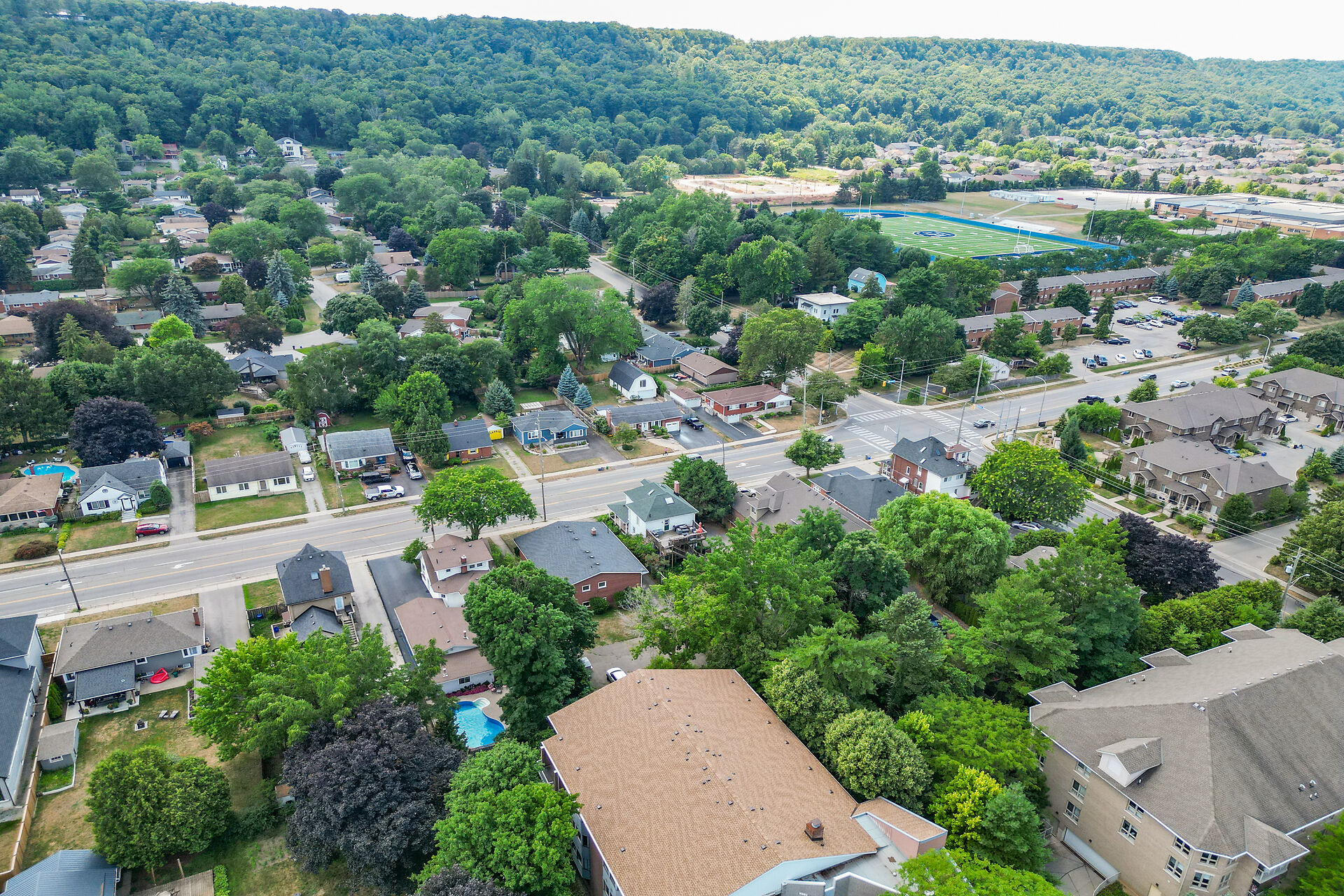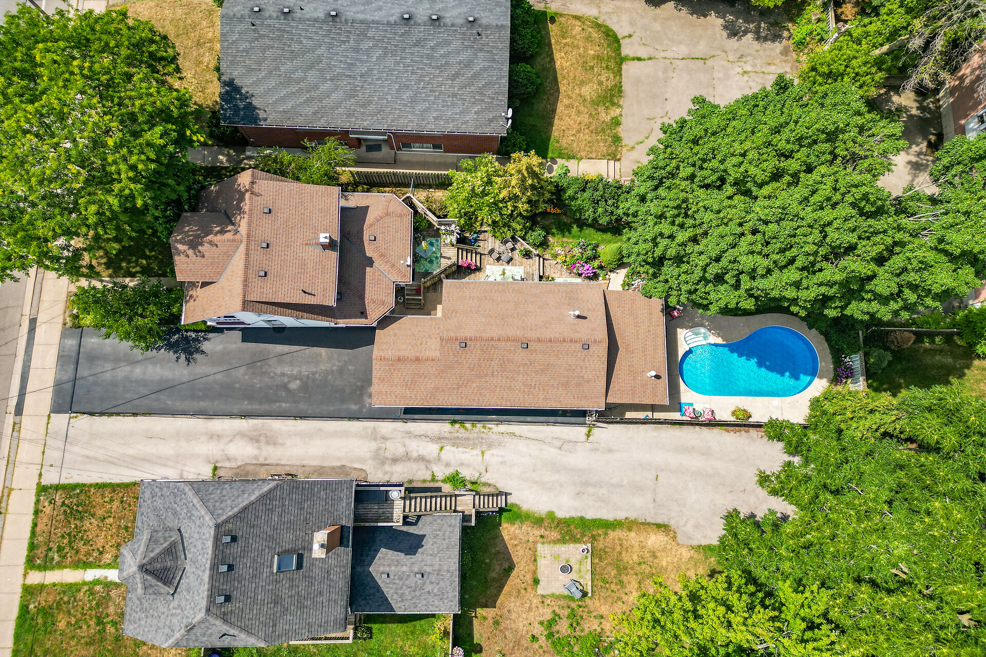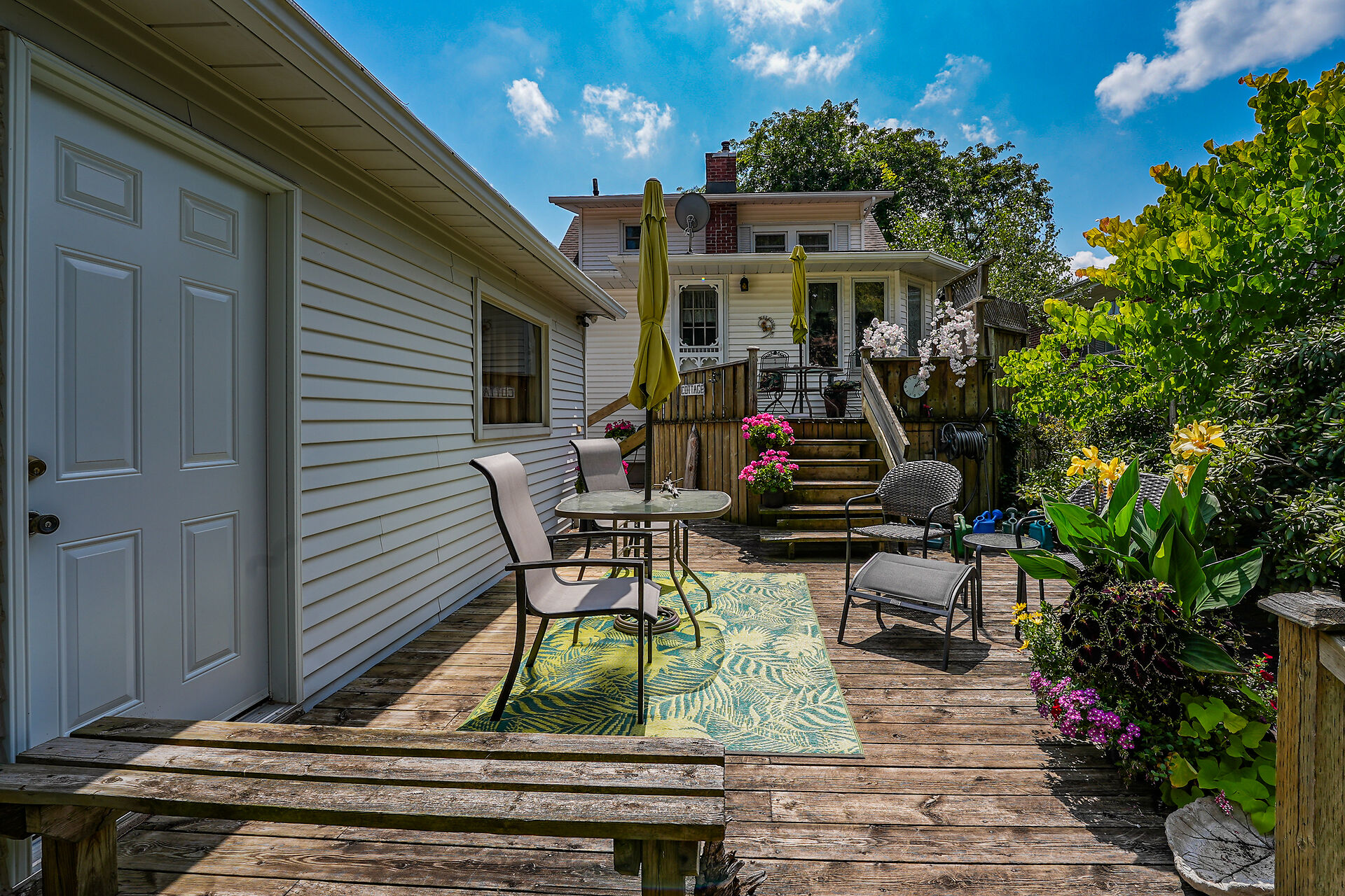 This gracious Grimsby home blends historic charm with modern comfort. Hardwood floors flow through the open-concept main level, featuring an updated eat-in kitchen and a warm family room with a brick gas fireplace. The elegant living/dining room offers crown moulding, an electric fireplace, and abundant natural light. Upstairs are two inviting bedrooms, including a primary with walk-in closet. The lower level adds a cozy rec room and storage. Outside, a private "secret garden" awaits with an inground pool, outdoor shower, multiple decks, and a change room. A large outbuilding offers a heated garage, office, and workshop. Minutes from shops, dining, and amenities with easy highway access.