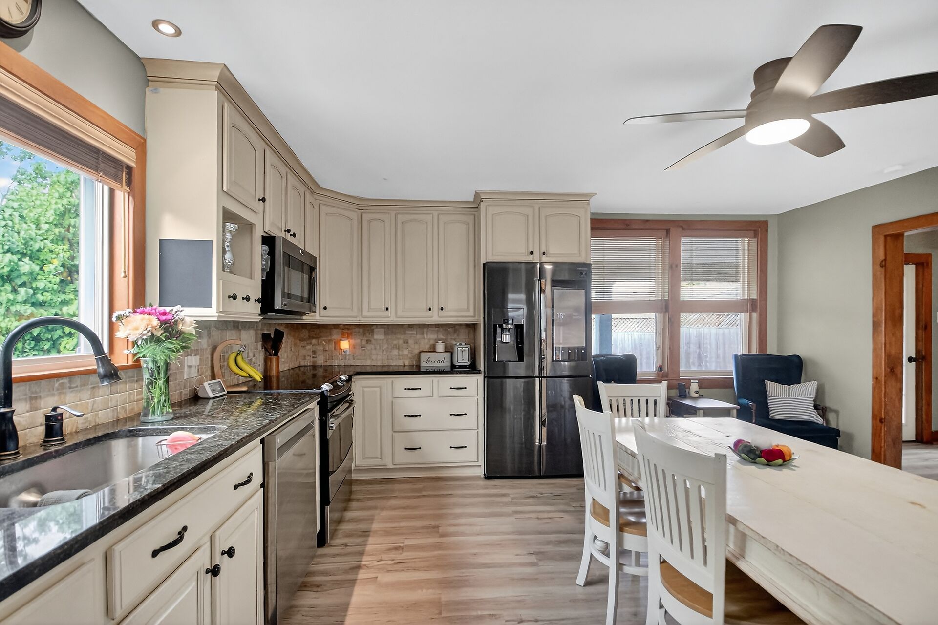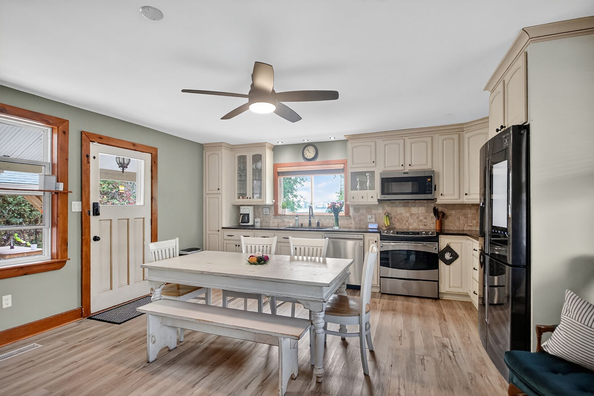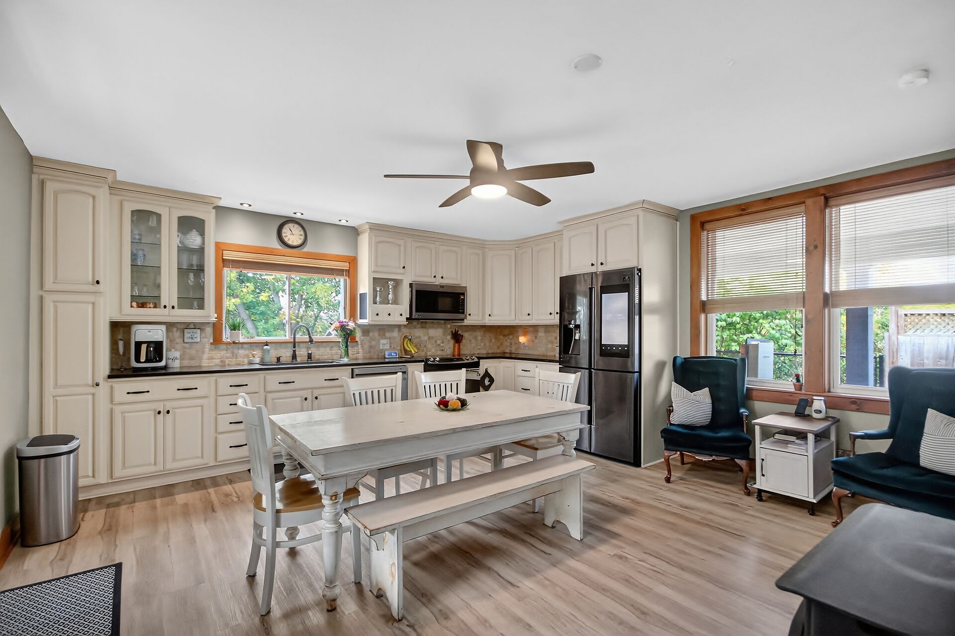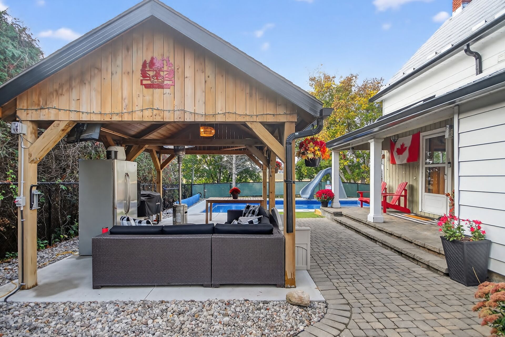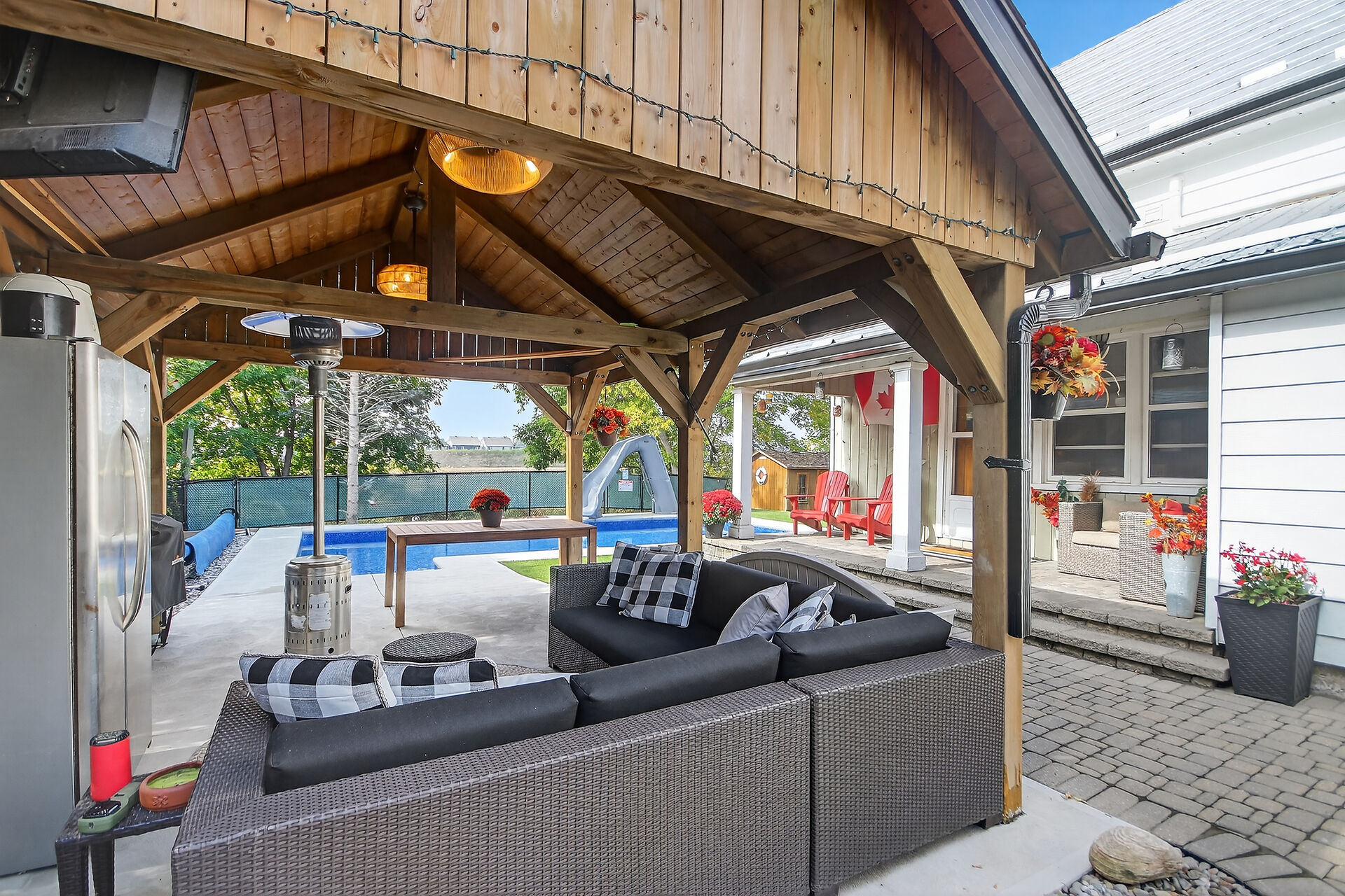 Welcome to 103 Queen Charlotte! This one-of-a-kind home blends the comfort of country living with the amenities and conveniences of city living. This 4-bedroom home is modernized and perfect for a growing family and entertaining! The inviting front porch and swing set the tone for this warm and welcoming home. Inside, you'll find a brightly updated kitchen with granite counters, a generous dining area that can host all your family gatherings, and a wood stove for chilly nights. Recent updates include a powder room refresh, built-in storage, permanent exterior lighting, and new eaves trough that include a lifetime warranty. Enjoy summer days in your backyard oasis featuring a heated inground pool (2023/24), profe