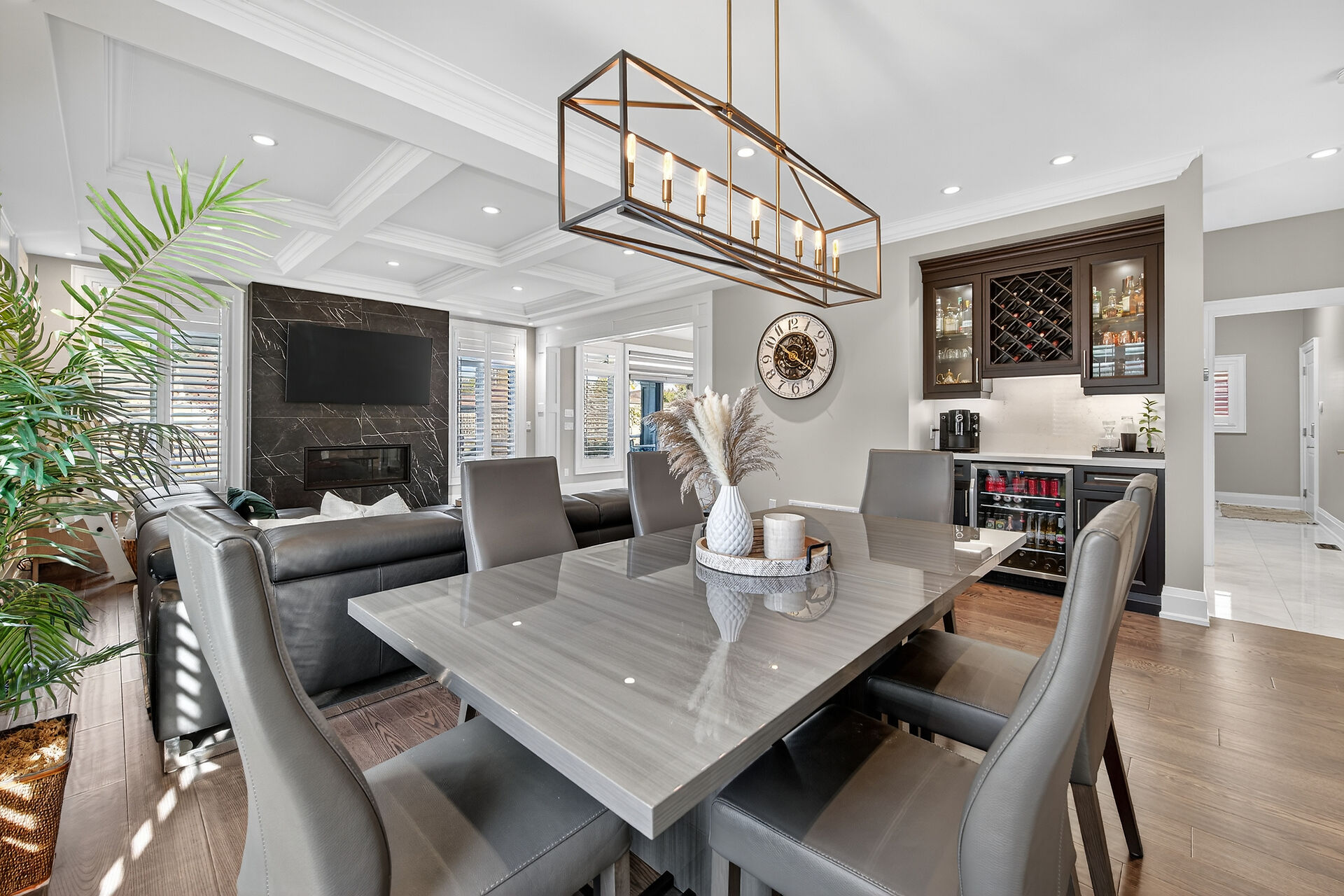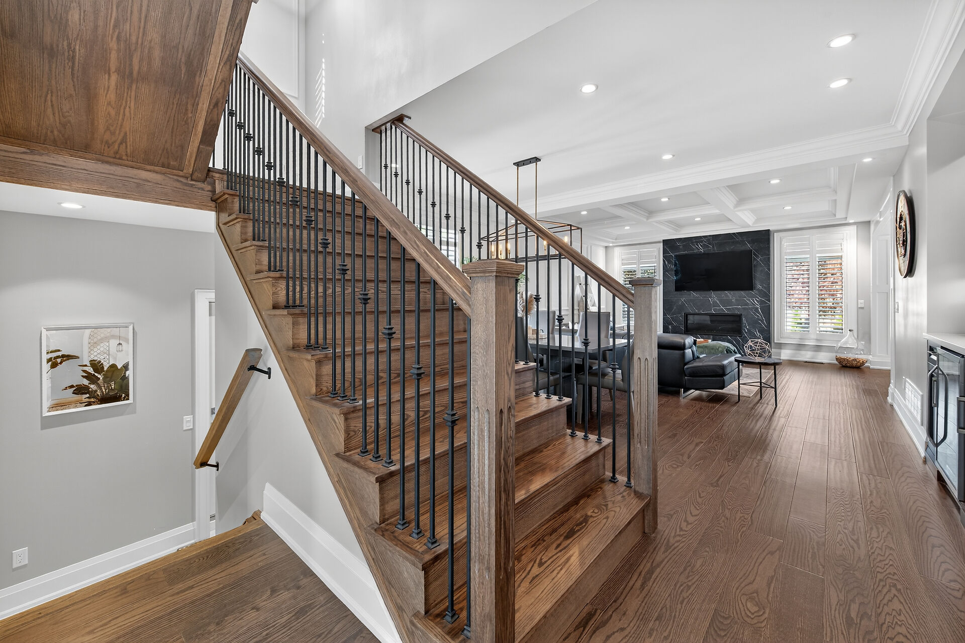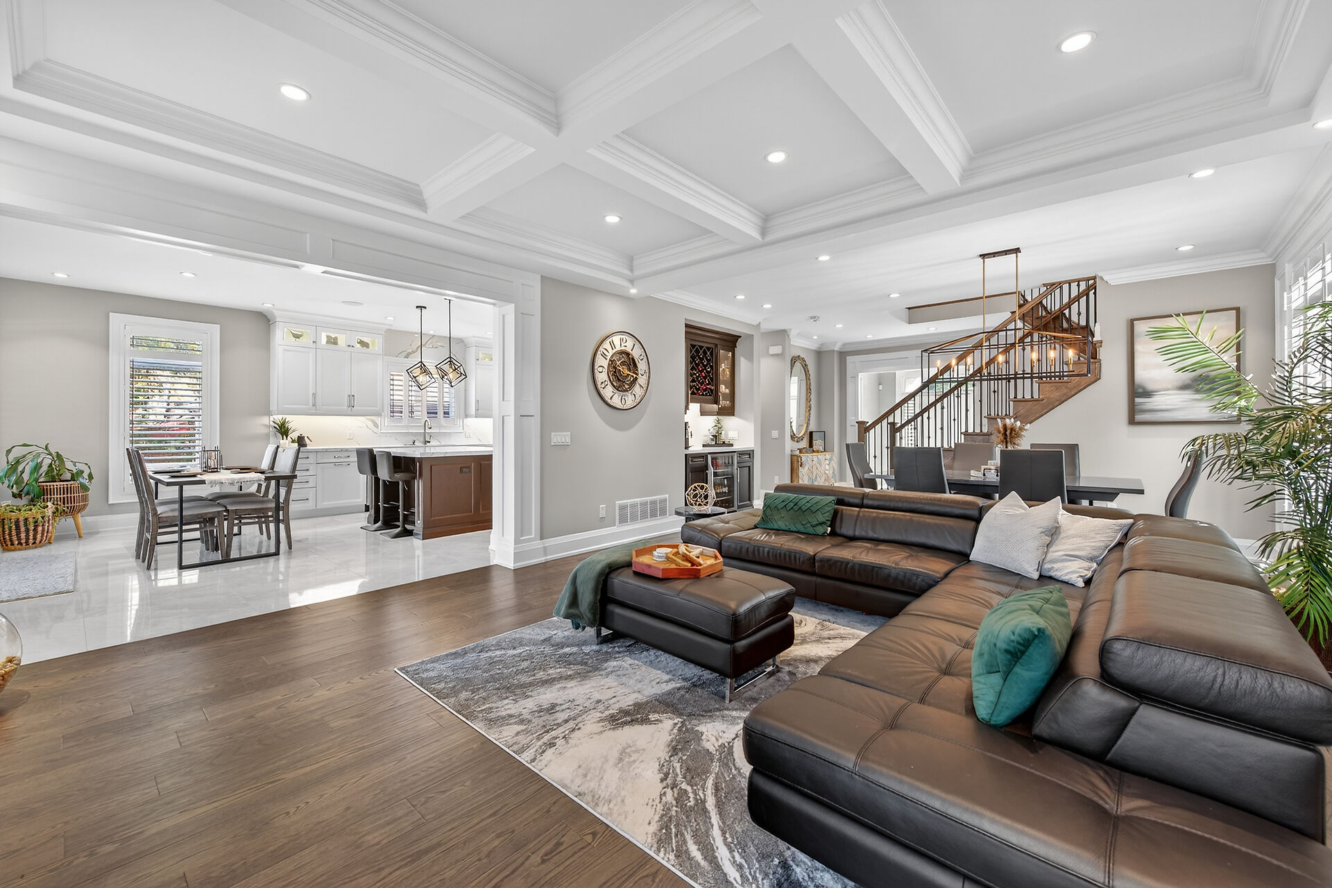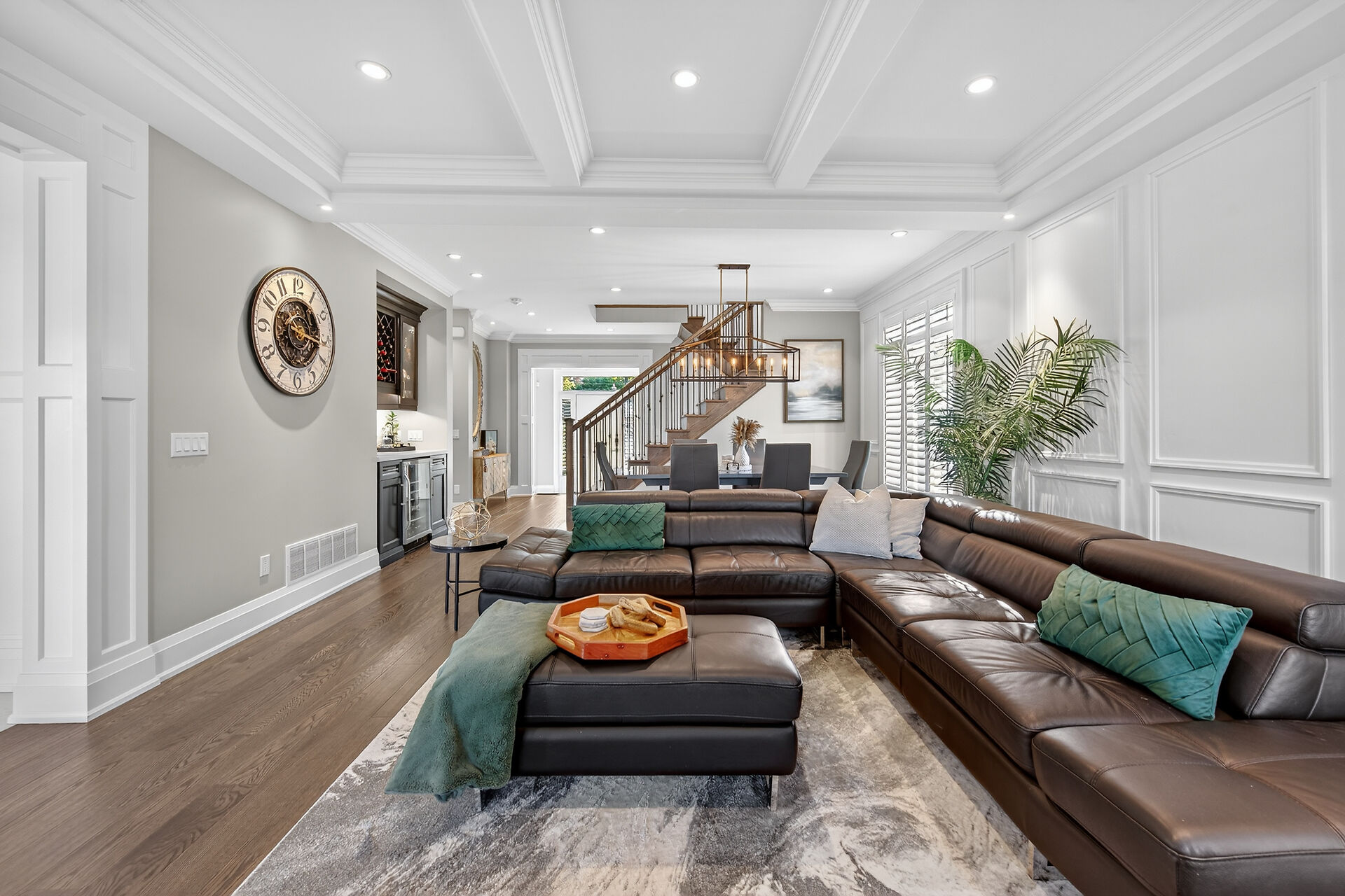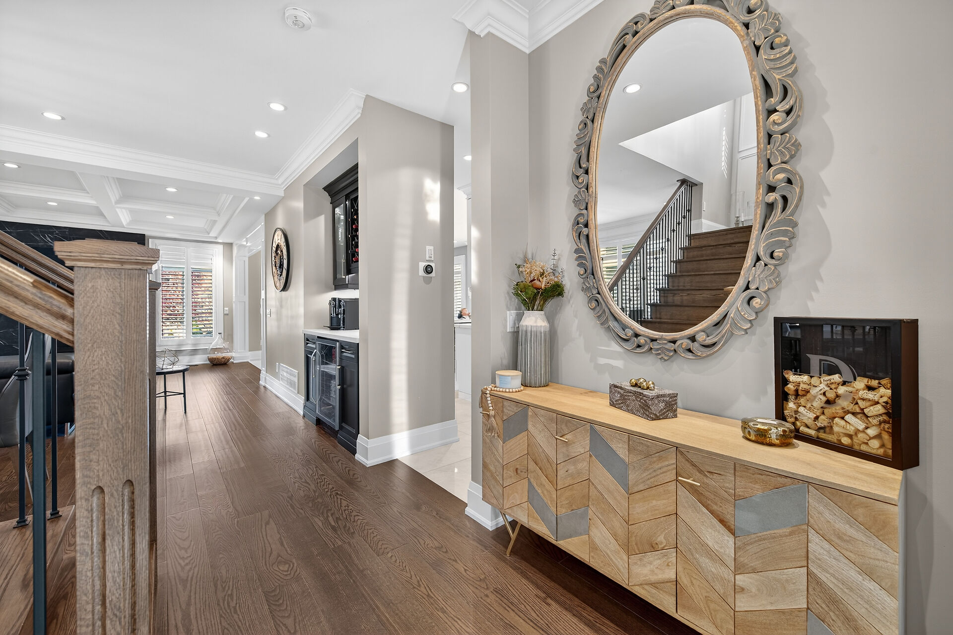 Every inch of this 2,531 sq ft custom-built home has been thoughtfully designed. Featuring 3 spacious bedrooms and 2.5 luxurious baths, this home offers quartz countertops in all bathrooms, kitchen, laundry, and wet bar. Enjoy engineered hardwood throughout, solid wood doors, custom cabinetry in every room, built-in ceiling speakers, wide staircase, and a private side entrance to the insulated, unfinished basement. Coffered ceilings, California shutters, and pot lights elevate every room. The fenced backyard with newly planted cedar trees offers growing privacy. Double garage + 4-car drive. A truly turnkey luxury home!