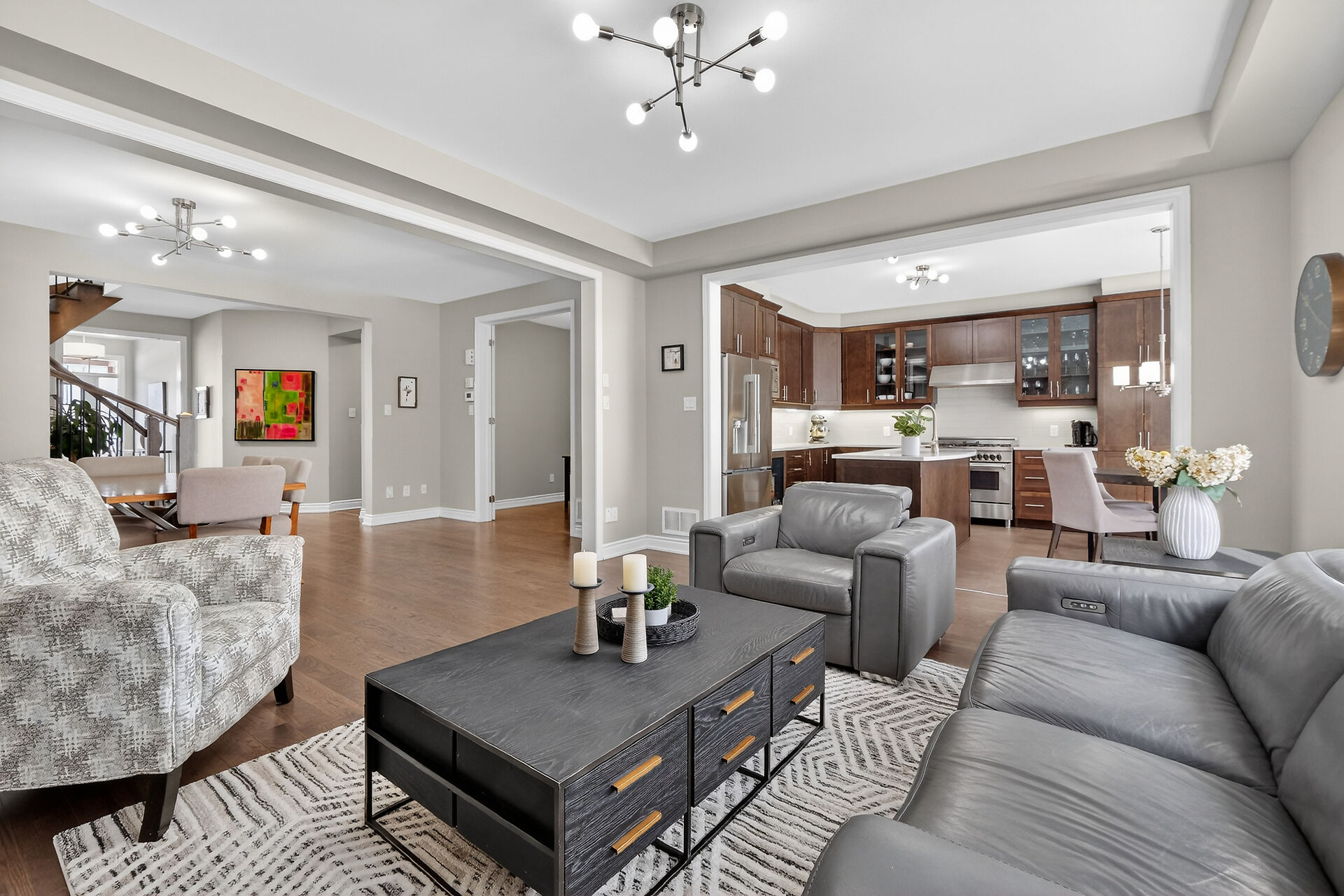 This home is the perfect choice for the growing family and an absolute MUST SEE as it offers 4 large bedrms all w/walk in closets (2 w/ensuite bathrms and 2 w/ jack n' jill bathrm) stunning Primary bedrm complete with 5 pc ensuite, glass shower, quartz top vanity w/double faucets and luxurious soaker tub. Huge walk in laundry on 2nd level. Features of the main level include a chef inspired, gourmet kitchen complete w/upgraded Maple cabinets, Quartz counters, and high end Stainless appliances including a 36" Bertazzoni dual fuel oven and stove, sunfilled greatrm hi-lited by cozy gas fireplace and beautiful reclaimed wooden mantle, formal diningrm area, main floor office/den plus 2 walk in coat closets! Walk-out L/L