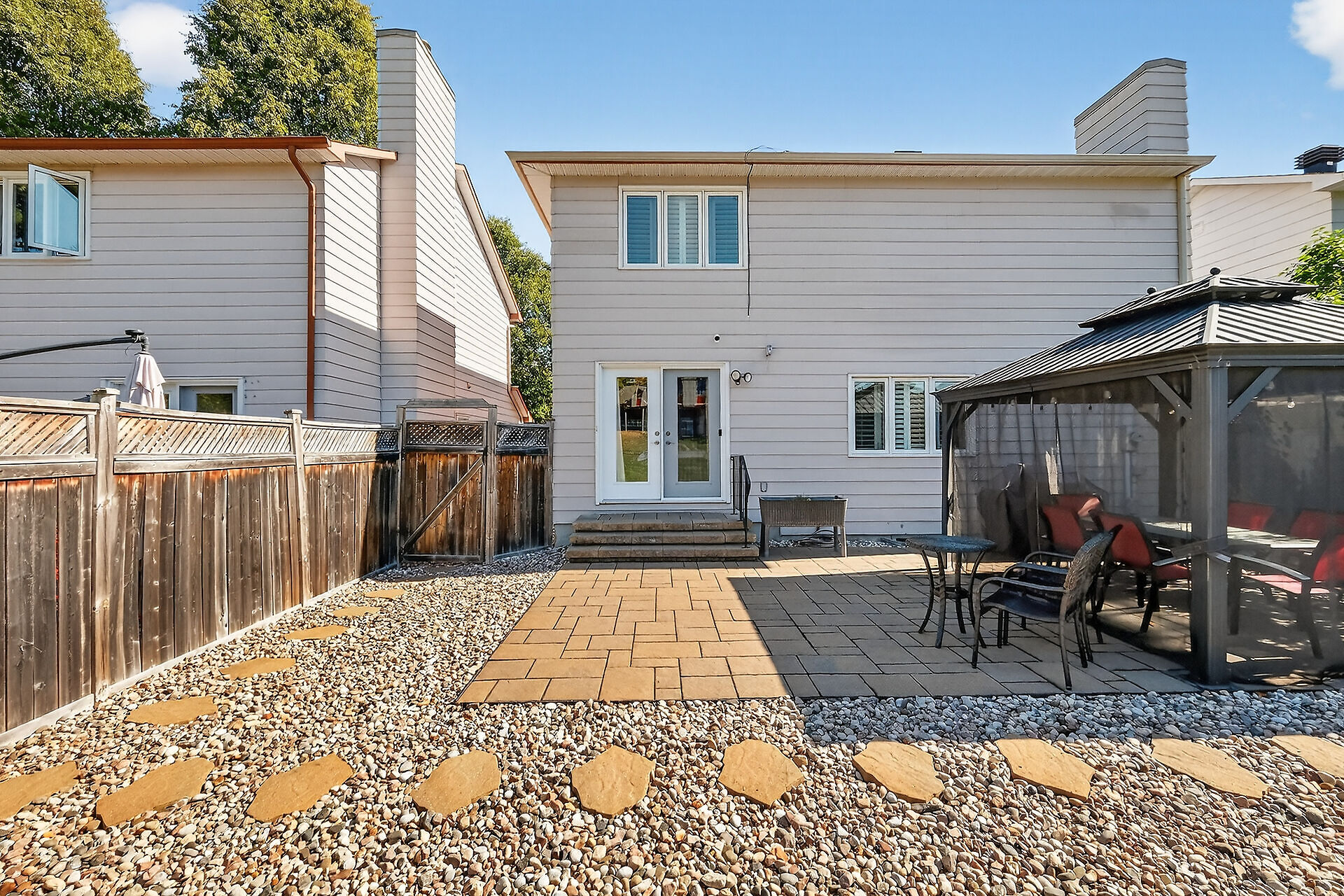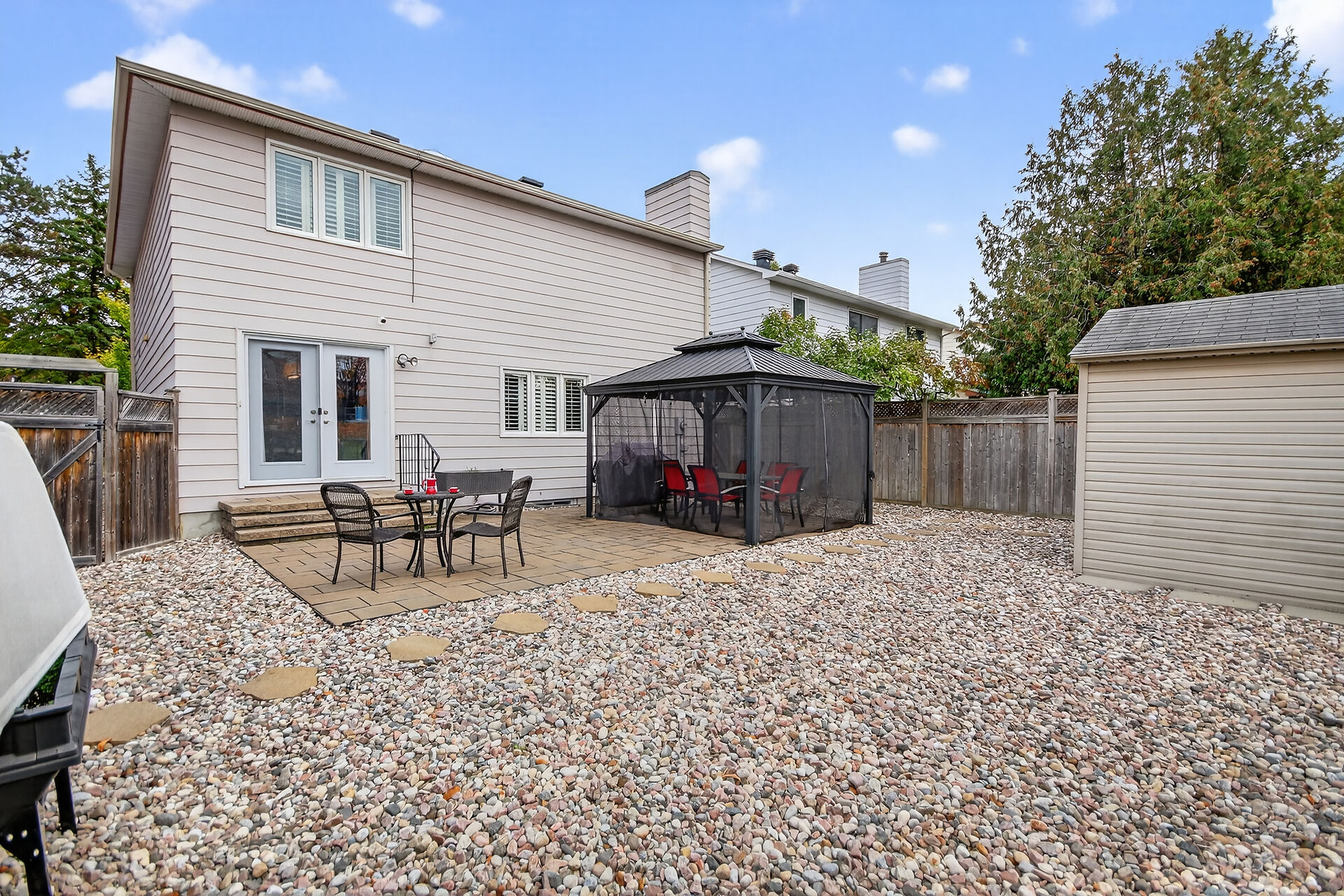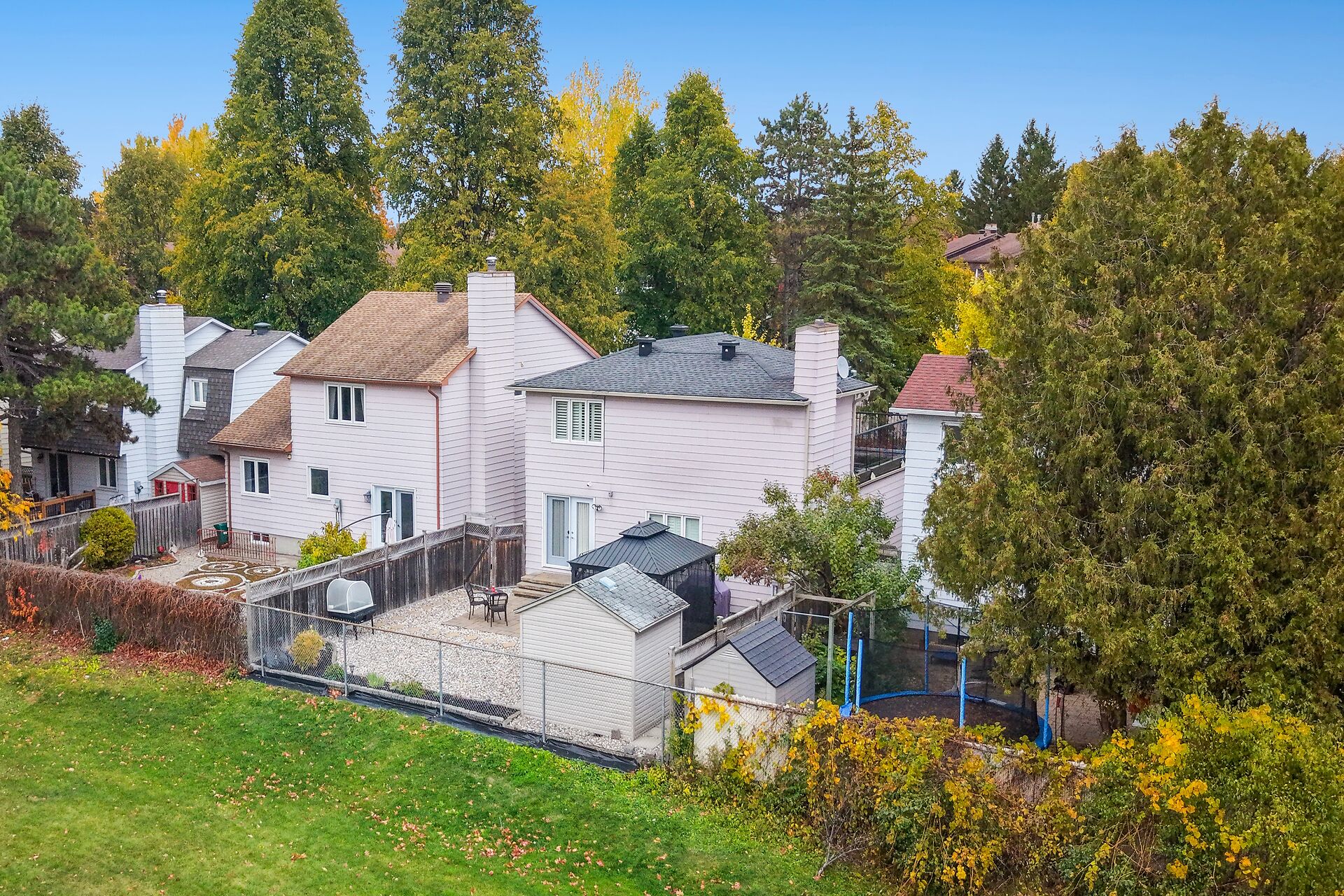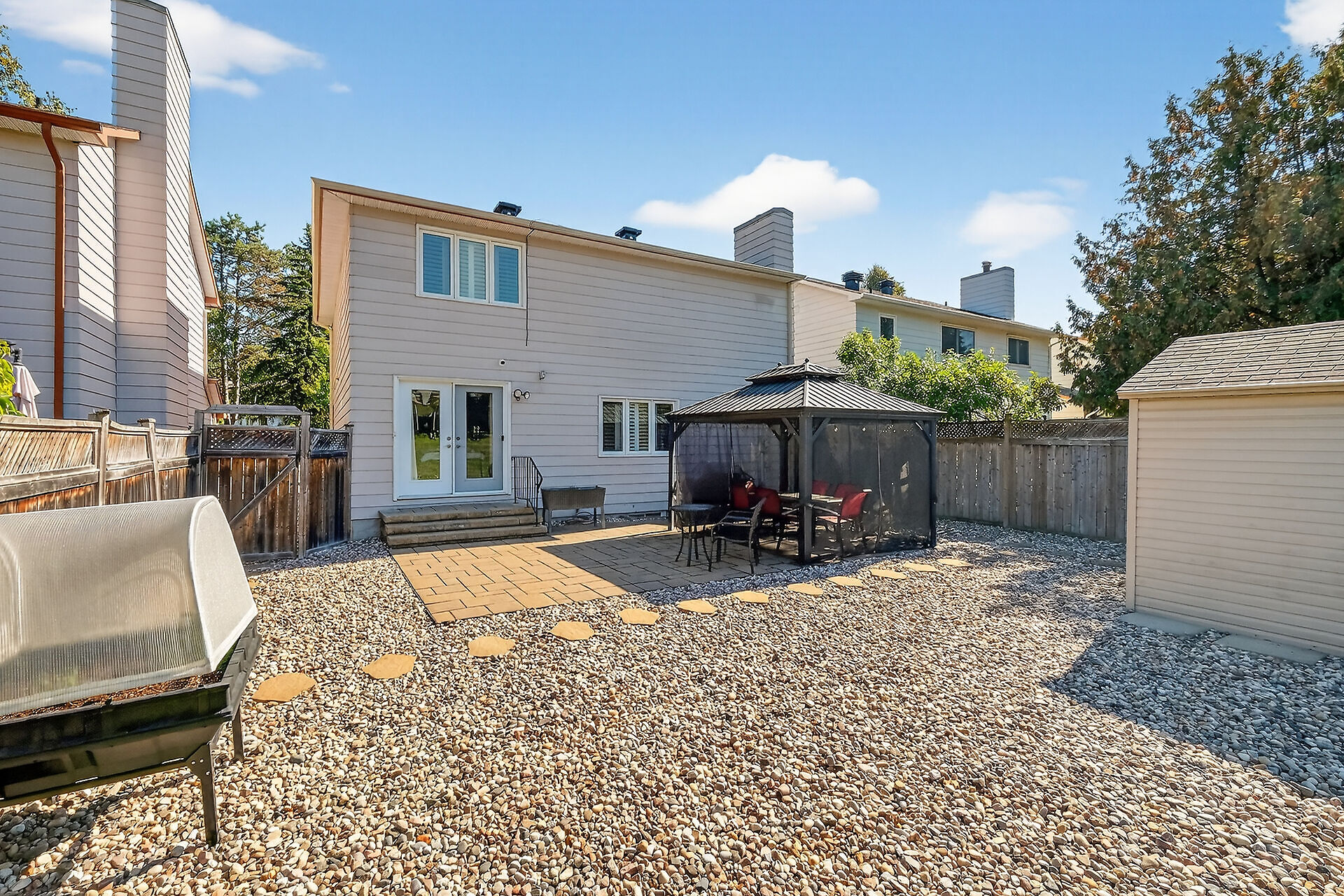 Enjoy an unparalleled location with no rear neighbours, offering both privacy & convenience. Close to Mooney's Bay, Hog's Back Falls, & Rideau Canal. The main level has pristine Bird's Eye maple flrs, custom cherry wood cabinetry in the kitchen, maple banister, & gas fireplace accented w Carrara marble. The dining room opens directly to a landscaped / private backyard, w custom Shed & gazebo. The 2nd level has maple floors,3 bedrooms, a 4pce bath and 4 pce ensuite. A large rooftop patio to relax and unwind. The lower level features an updated recreation rm & den + storage/laundry room .Welcome Home where comfort, sophistication, & location come together beautifully