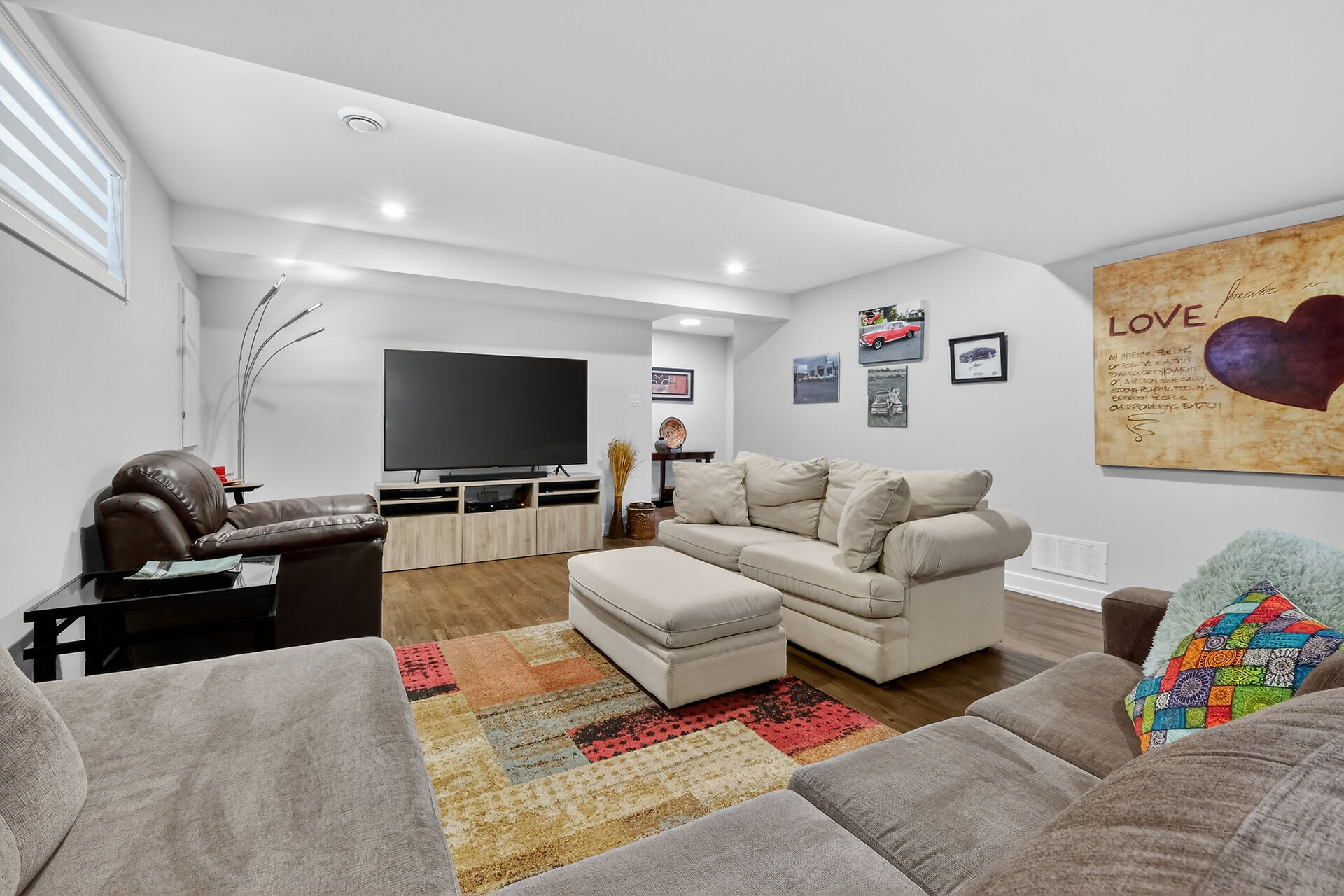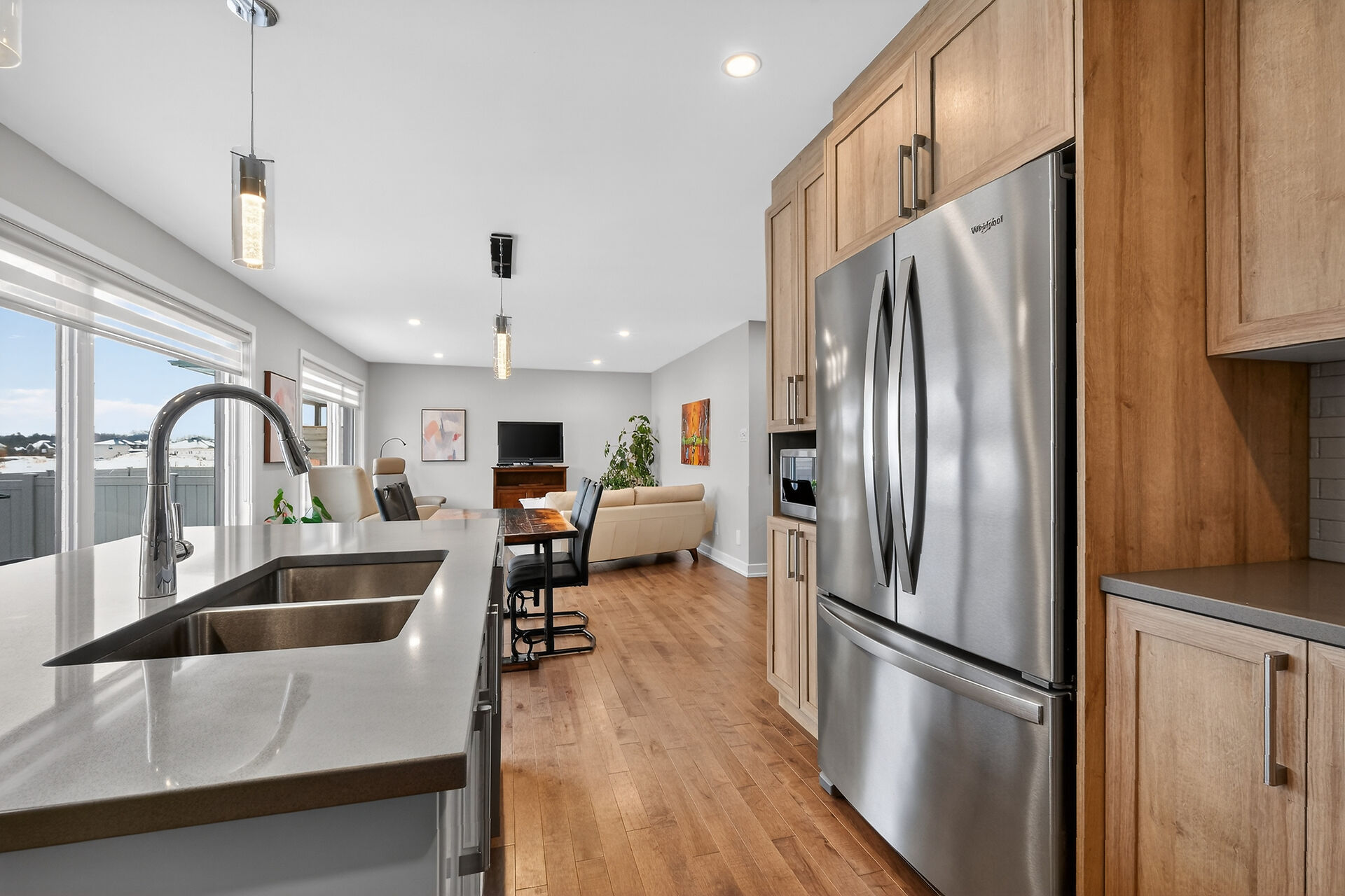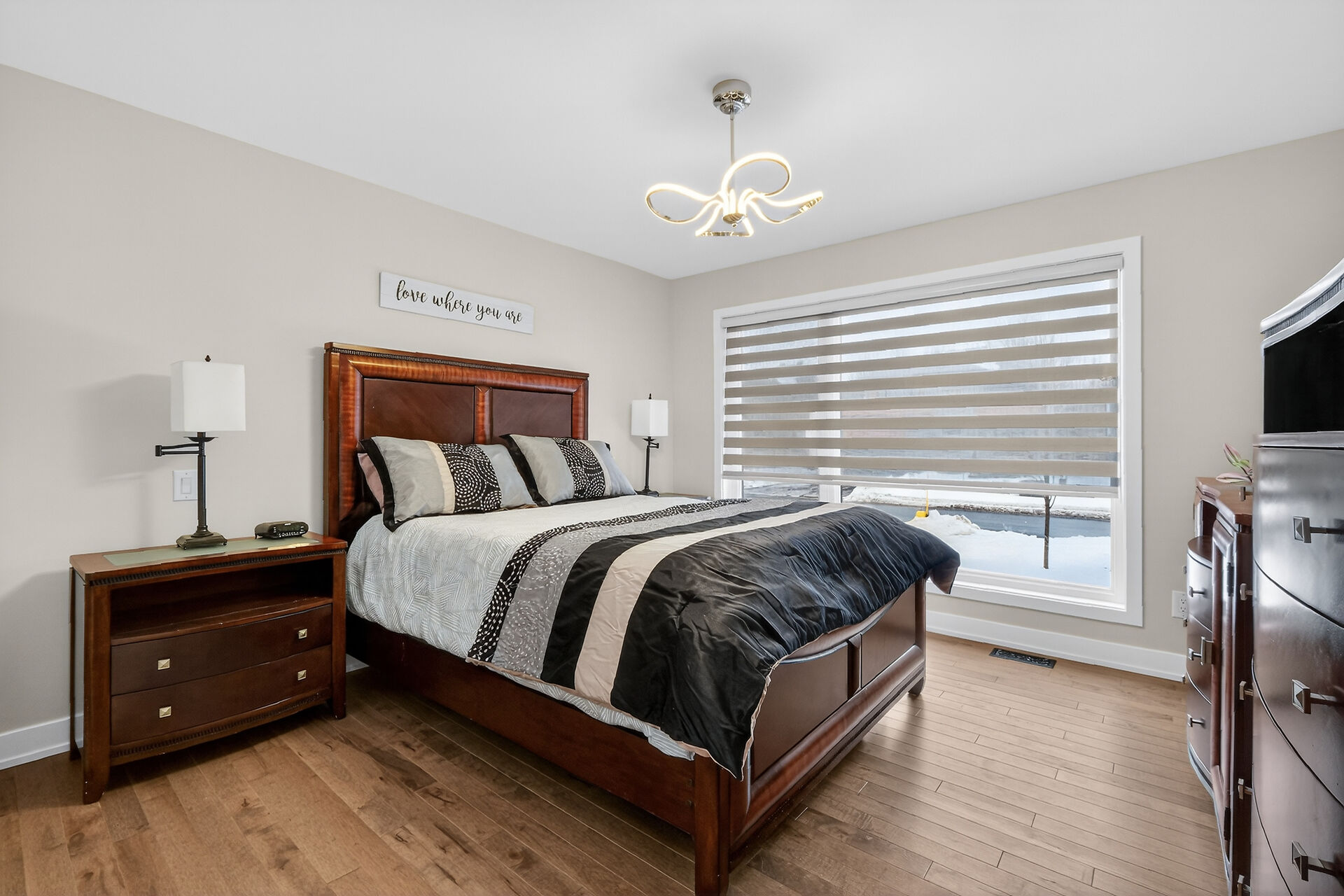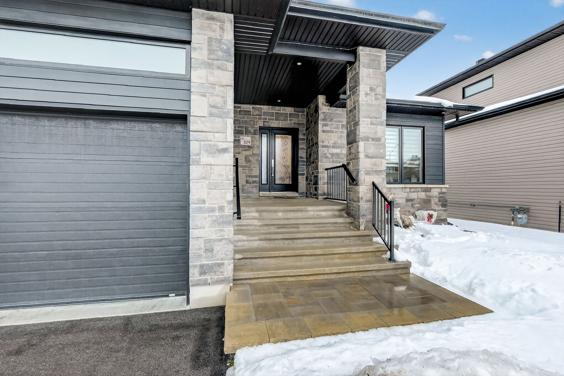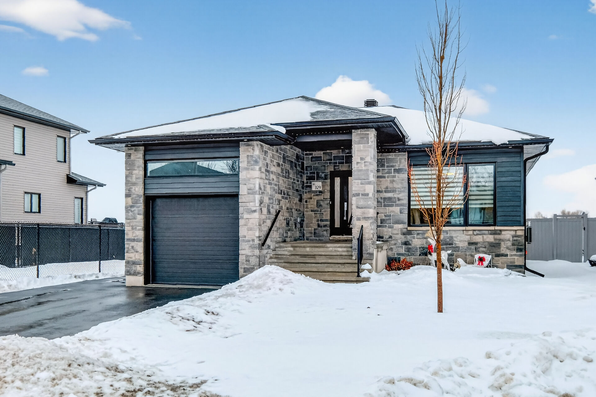 Beautiful stone-front bungalow with impressive curb appeal, featuring interlocking stonework and professionally landscaped grounds. The open-concept main level offers a seamless flow between the living and dining areas, highlighted by hardwood flooring and abundant natural light. The stylish kitchen is complete with quartz countertops, stainless steel appliances, pot lights, a gourmet hood fan, elegant backsplash, undermount sinks, and custom blinds throughout. The main floor includes two well-appointed bedrooms and a modern bathroom featuring a relaxing soaker tub and quality finishes. The fully finished basement expands the living space with a spacious recreation room, full bathroom and dedicated laundry room.
