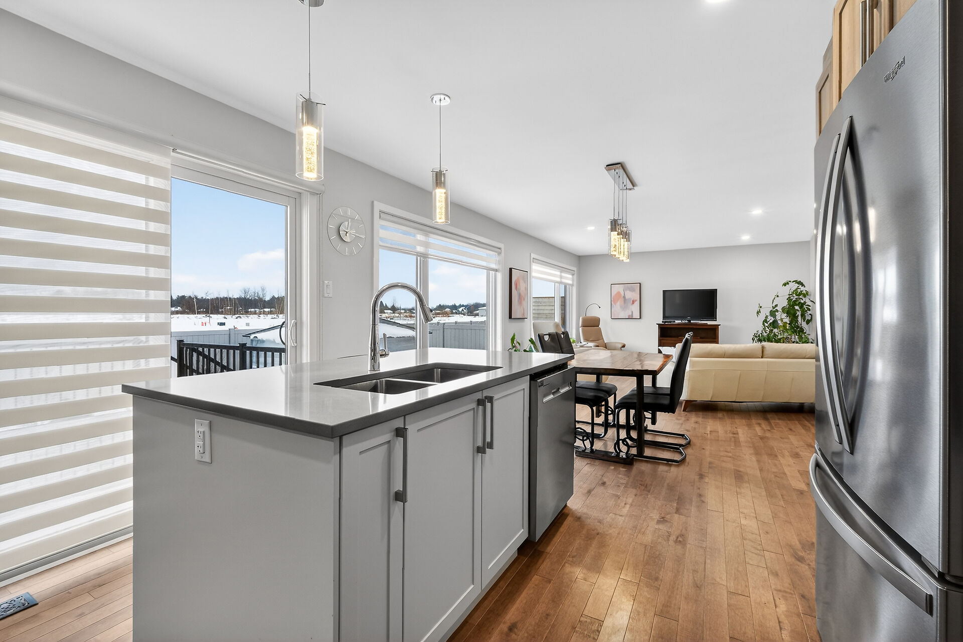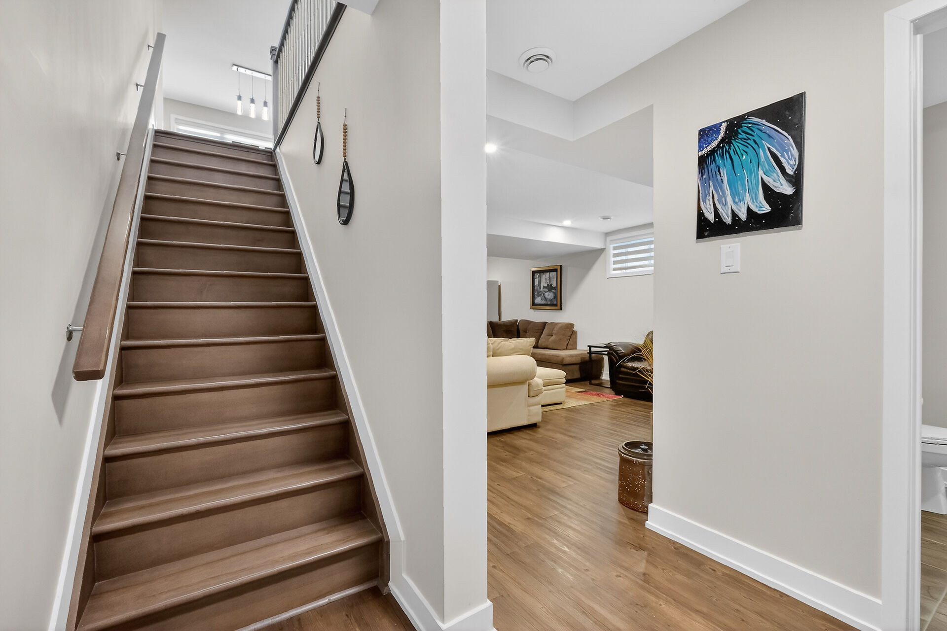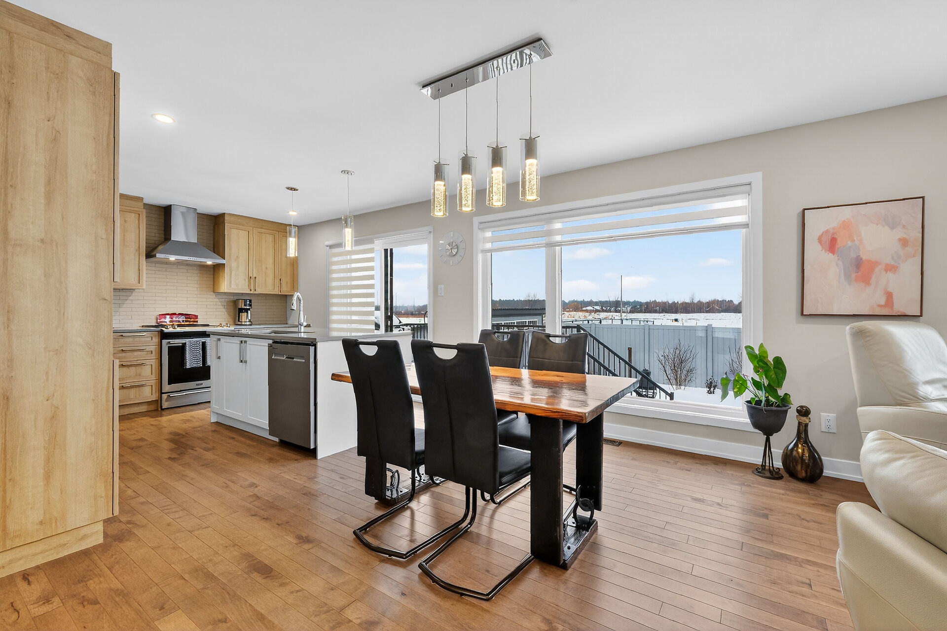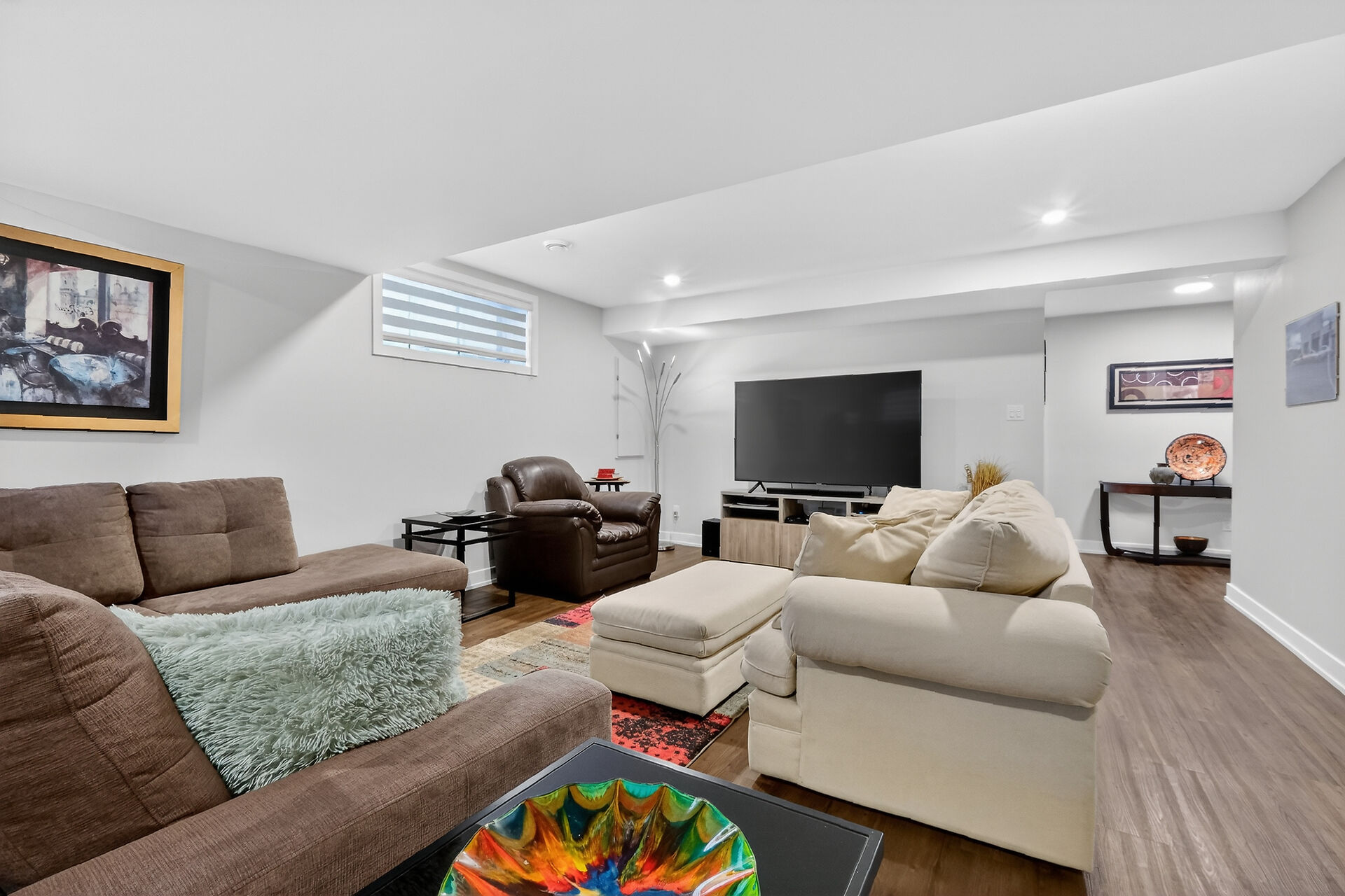 Beautiful stone-front bungalow with impressive curb appeal, featuring interlocking stonework and professionally landscaped grounds. The open-concept main level offers a seamless flow between the living and dining areas, highlighted by hardwood flooring and abundant natural light. The stylish kitchen is complete with quartz countertops, stainless steel appliances, pot lights, a gourmet hood fan, elegant backsplash, undermount sinks, and custom blinds throughout. The main floor includes two well-appointed bedrooms and a modern bathroom featuring a relaxing soaker tub and quality finishes. The fully finished basement expands the living space with a spacious recreation room, full bathroom and dedicated laundry room.