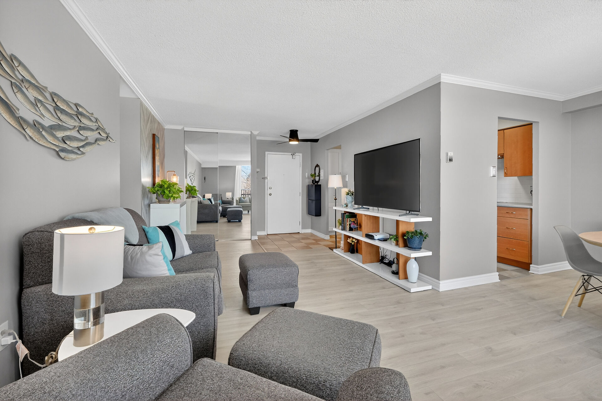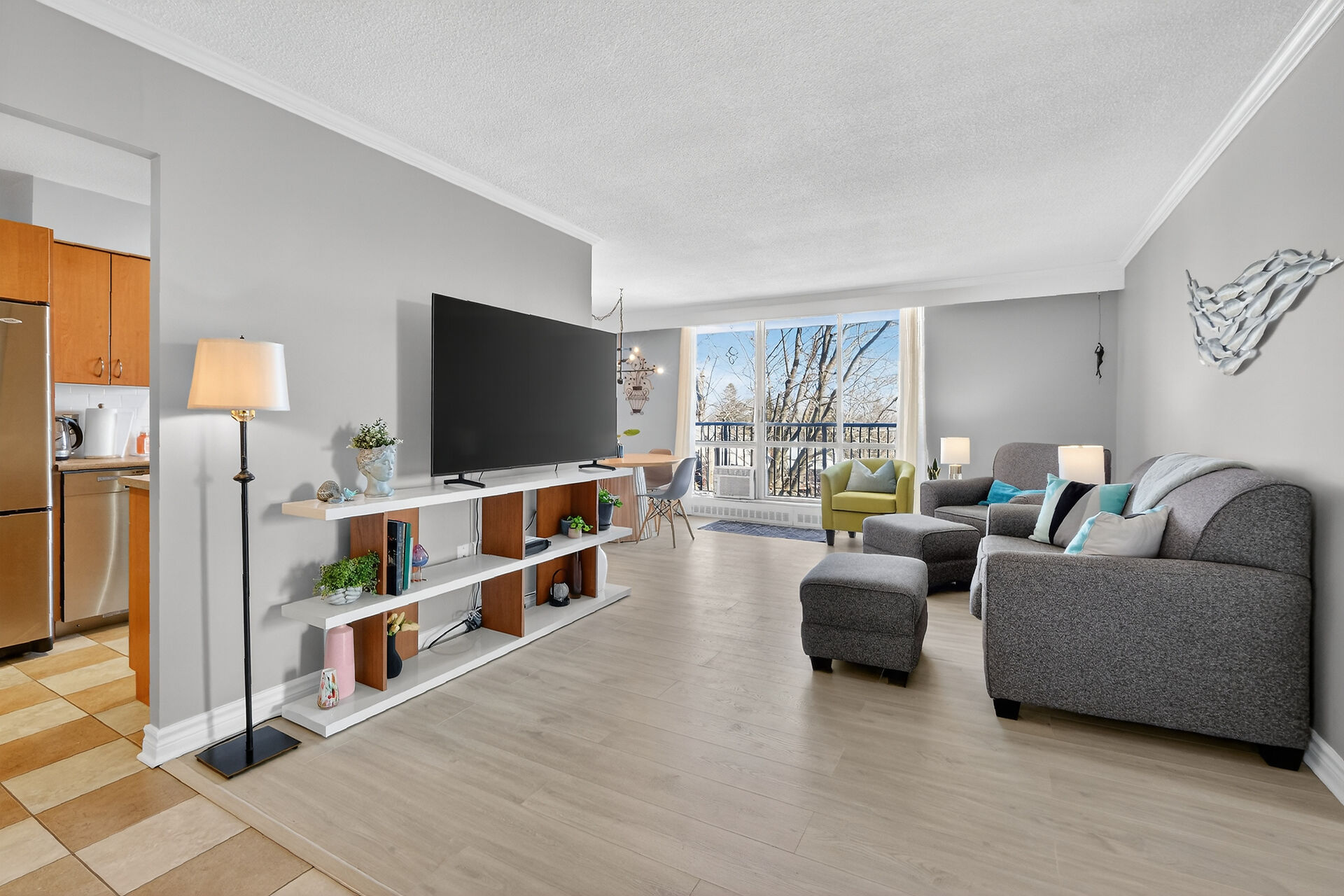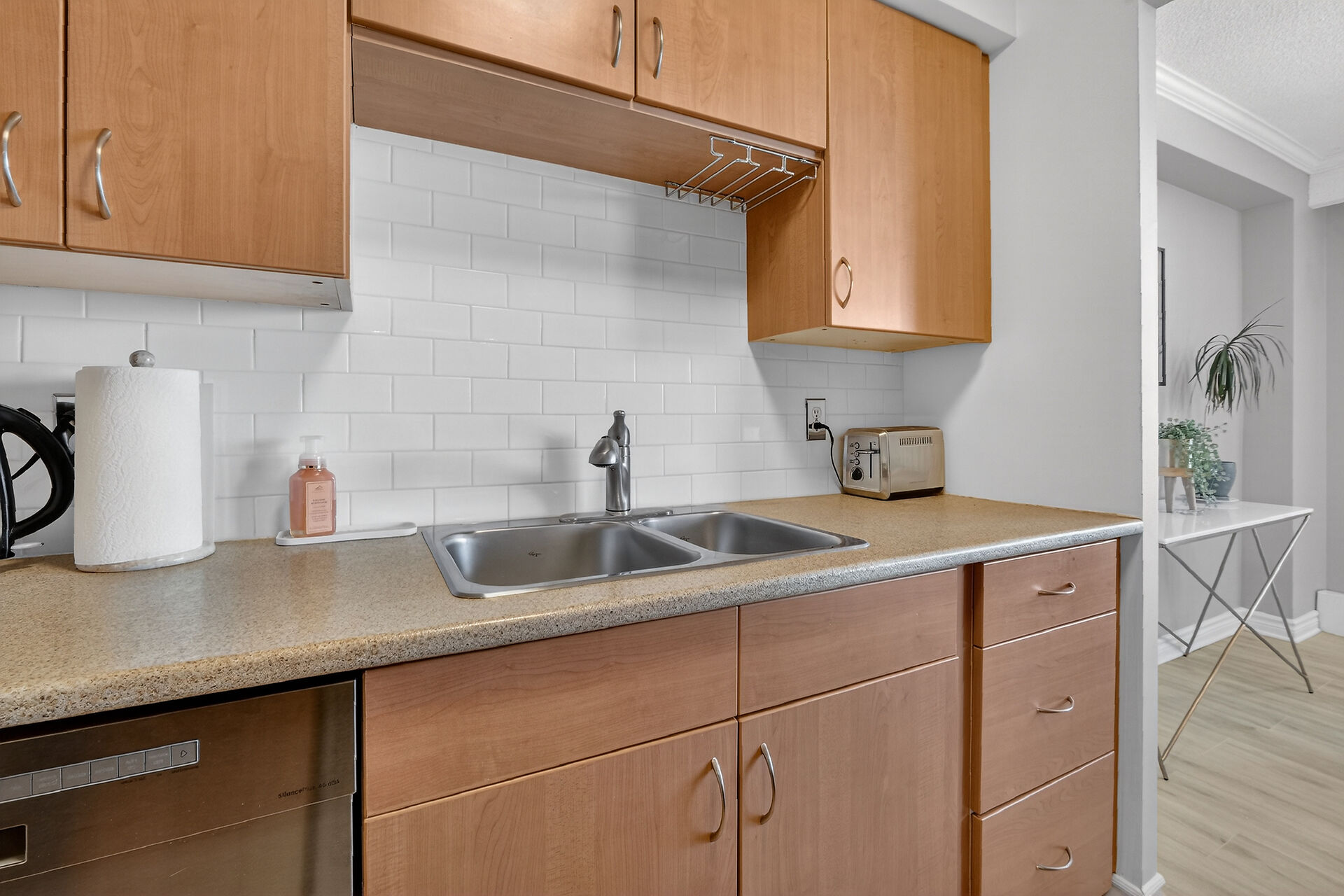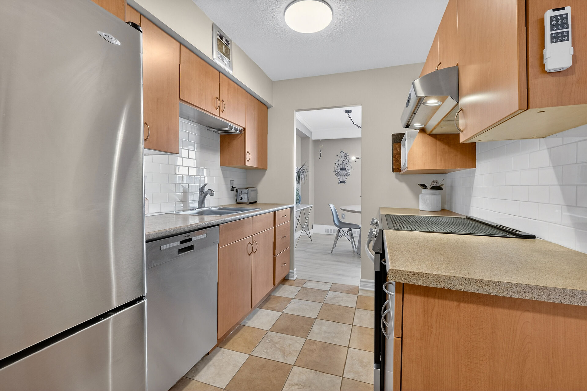 Enviable corner unit on the 4th floor enjoys space and sunlight throughout, with unobstructed eastern view. Meticulously maintained two bedrooms, two bathrooms, large living room/dining room with a well laid out galley kitchen. Tastefully updated, with additional cupboards, cabinets and drawers, offering ample storage and counterspace. Primary bedroom has walk-in closet & a 2-pce ensuite. Second bedroom, and a full bathroom. Bathroom reno 2024. High end laminate flooring throughout in recent years. INCLUDED in the condo fees are the heat, hydro and water. Lower level Storage #403, and easy underground parking #53 - Exclusive use. Fabulous amenities and close to so much!