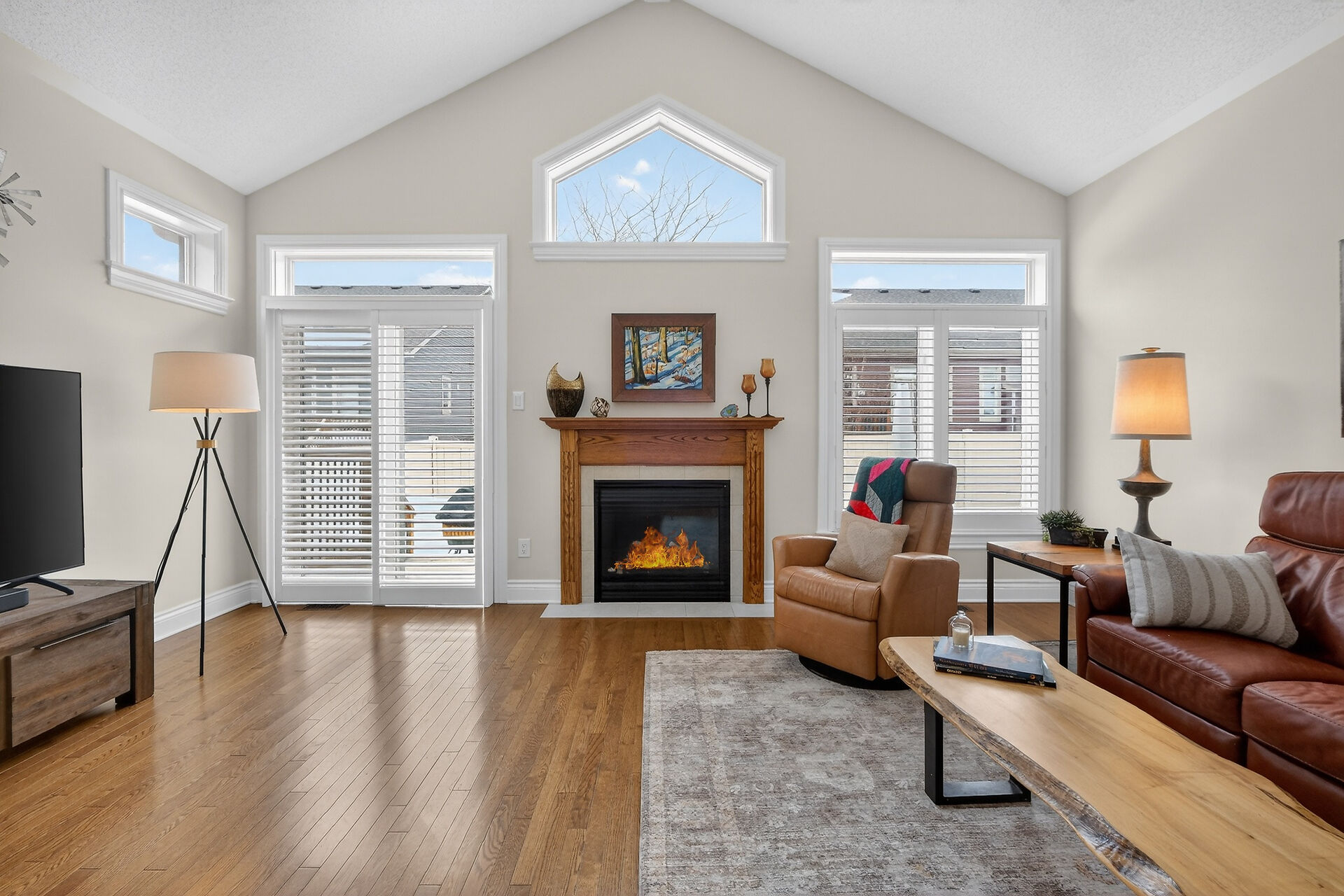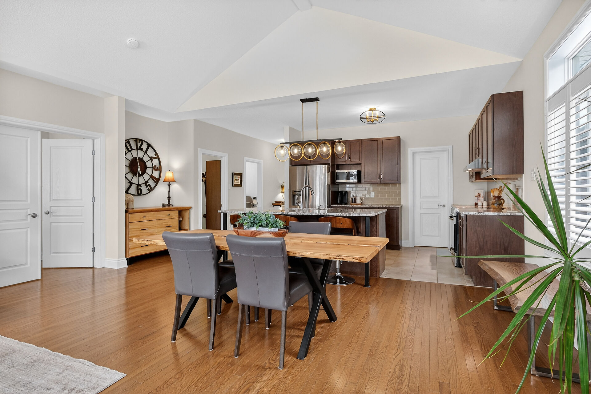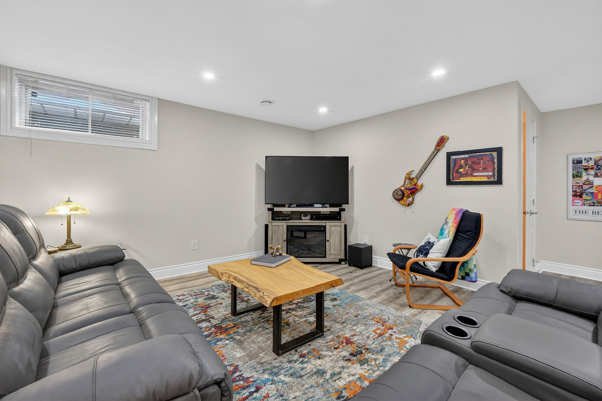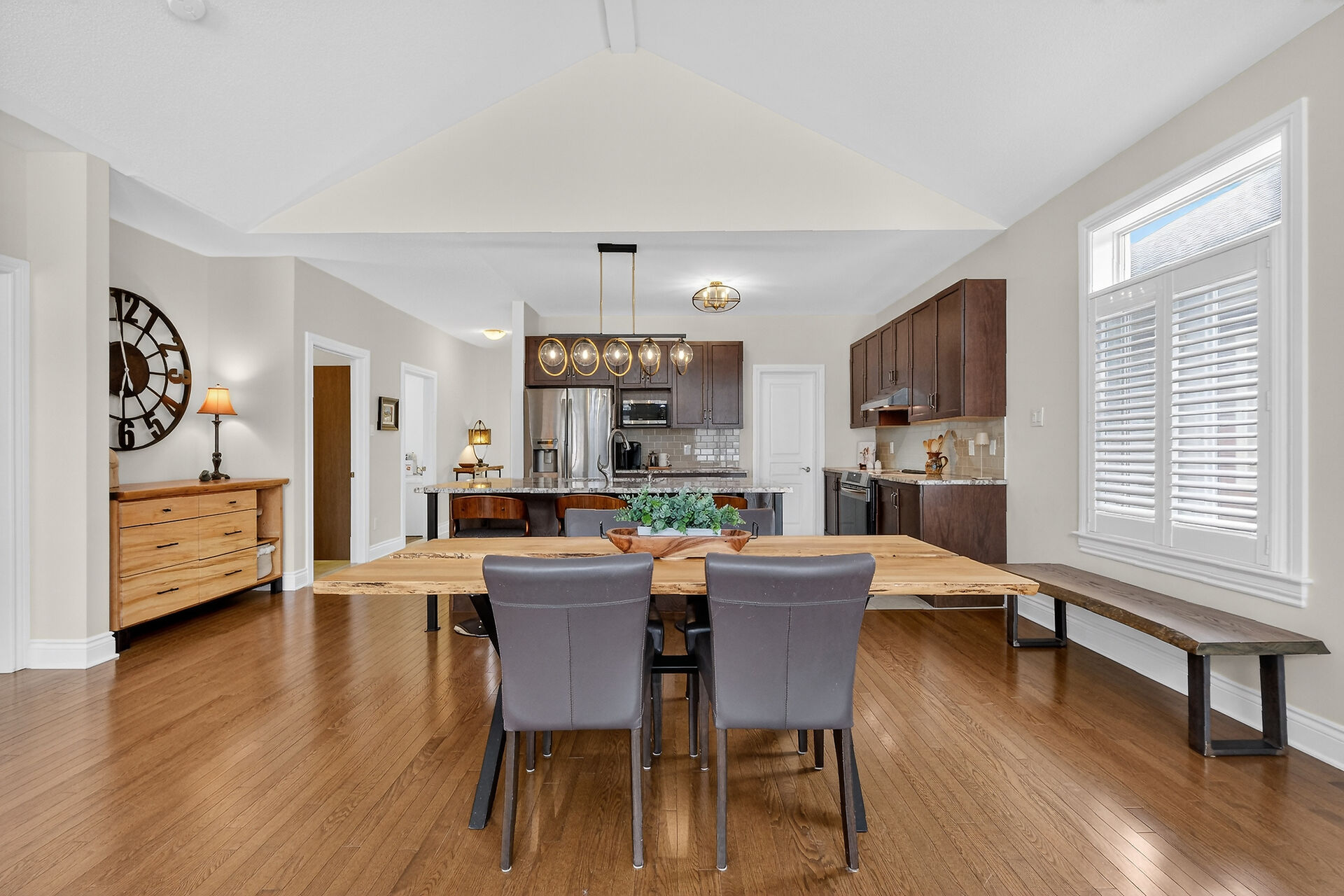 This inviting bungalow blends comfort and style in all the right ways. Rich hardwood flooring and a vaulted ceiling set the tone as you step into the open-concept living and dining area, anchored by a natural gas fireplace. The kitchen is ready for gatherings with stainless steel appliances, a breakfast bar, stone countertops, and a large pantry. A main-floor den offers a quiet retreat, while the primary bedroom features a walk-in closet and a private three-piece bathroom. A secondary bedroom and main-floor laundry complete the level. Downstairs, a generous recreation room with luxury vinyl flooring. Guests will appreciate the additional bedroom and full 3piece bathroom. Fenced yard with an interlocking stone patio.