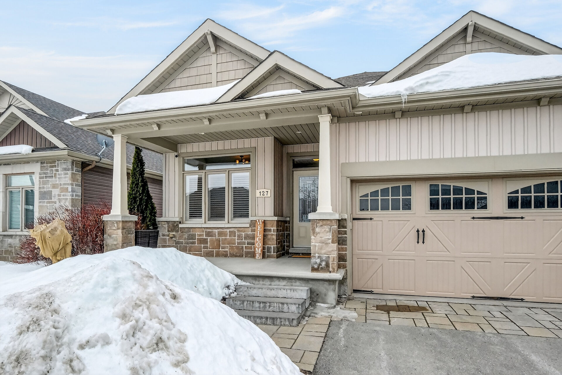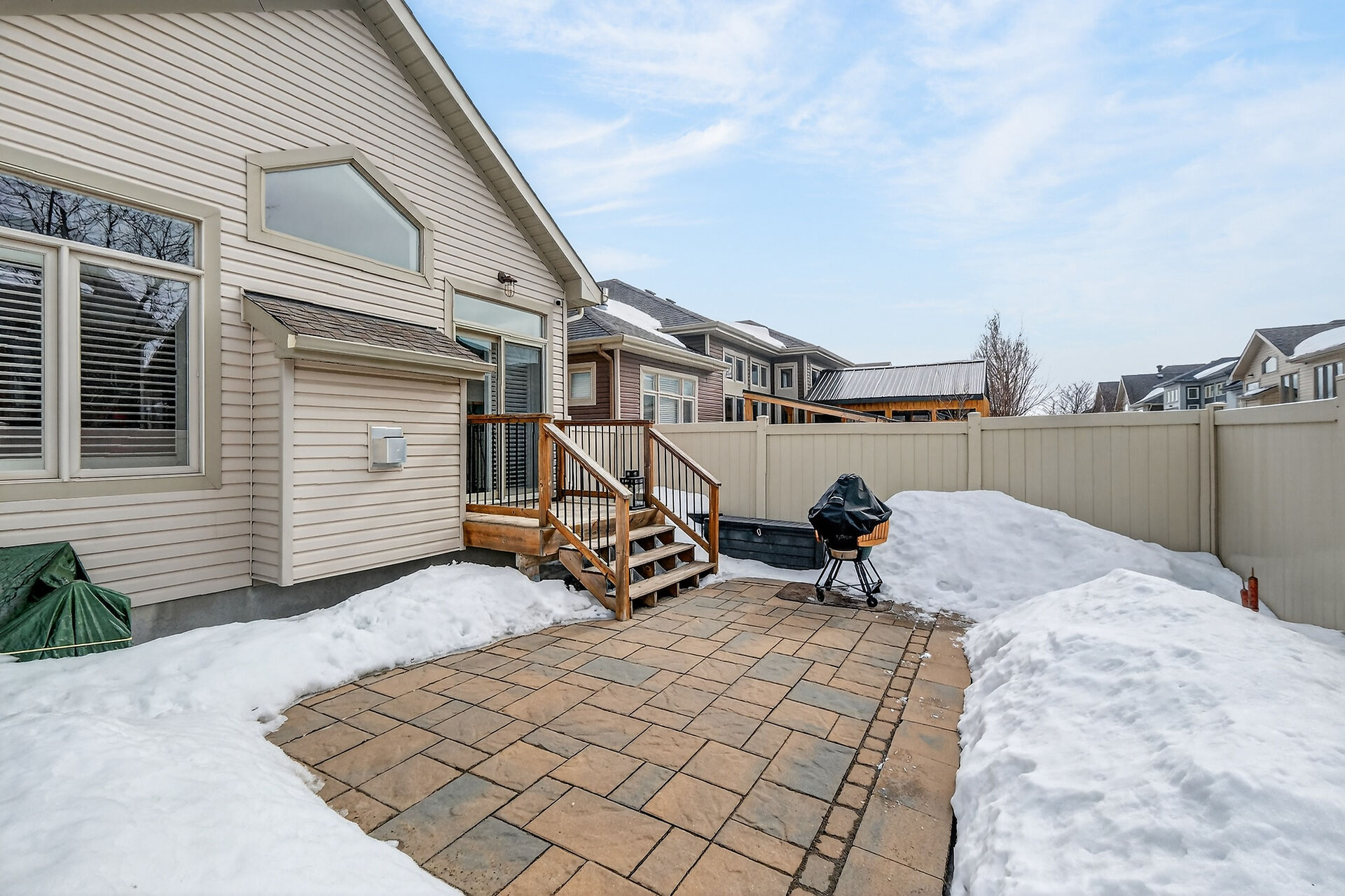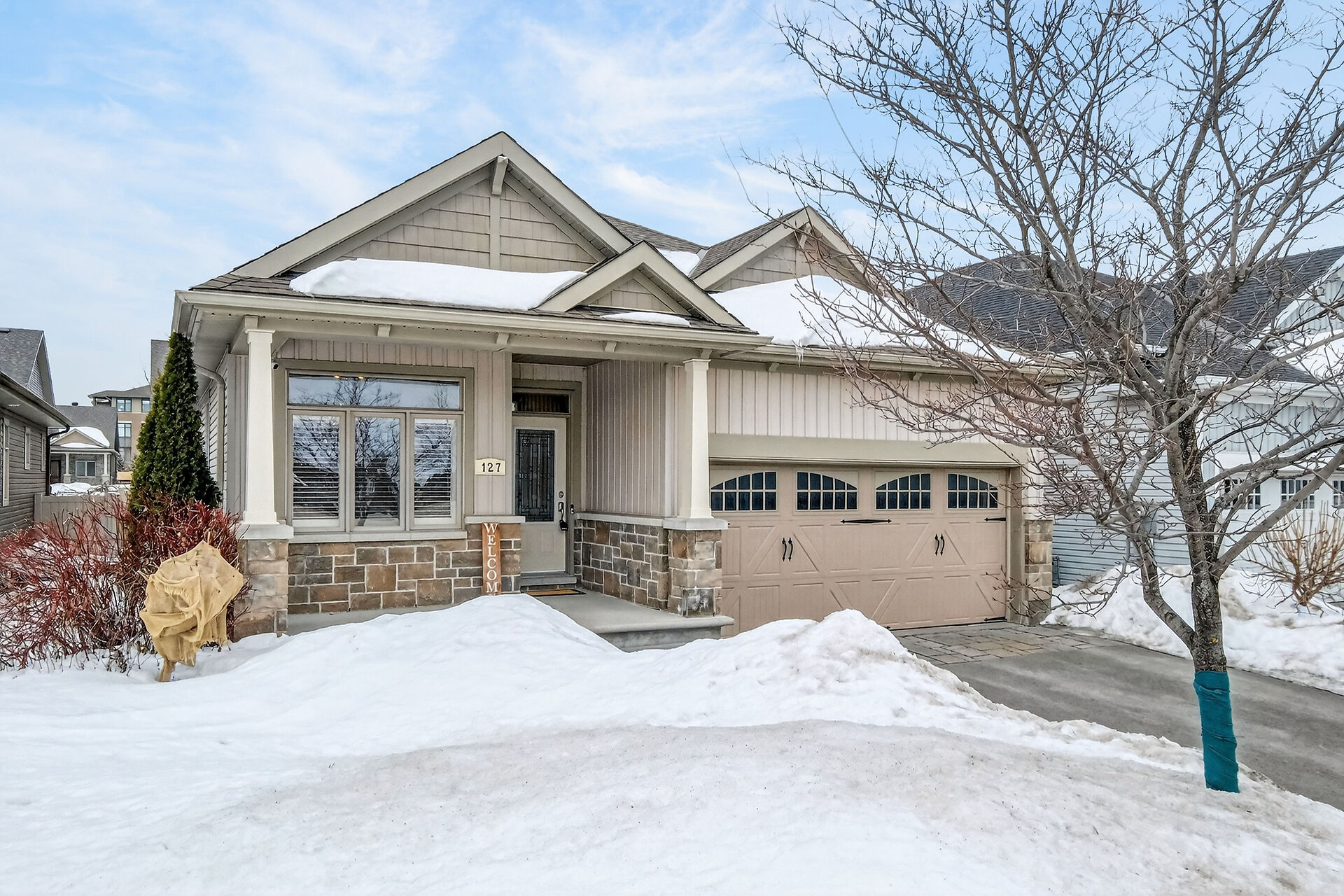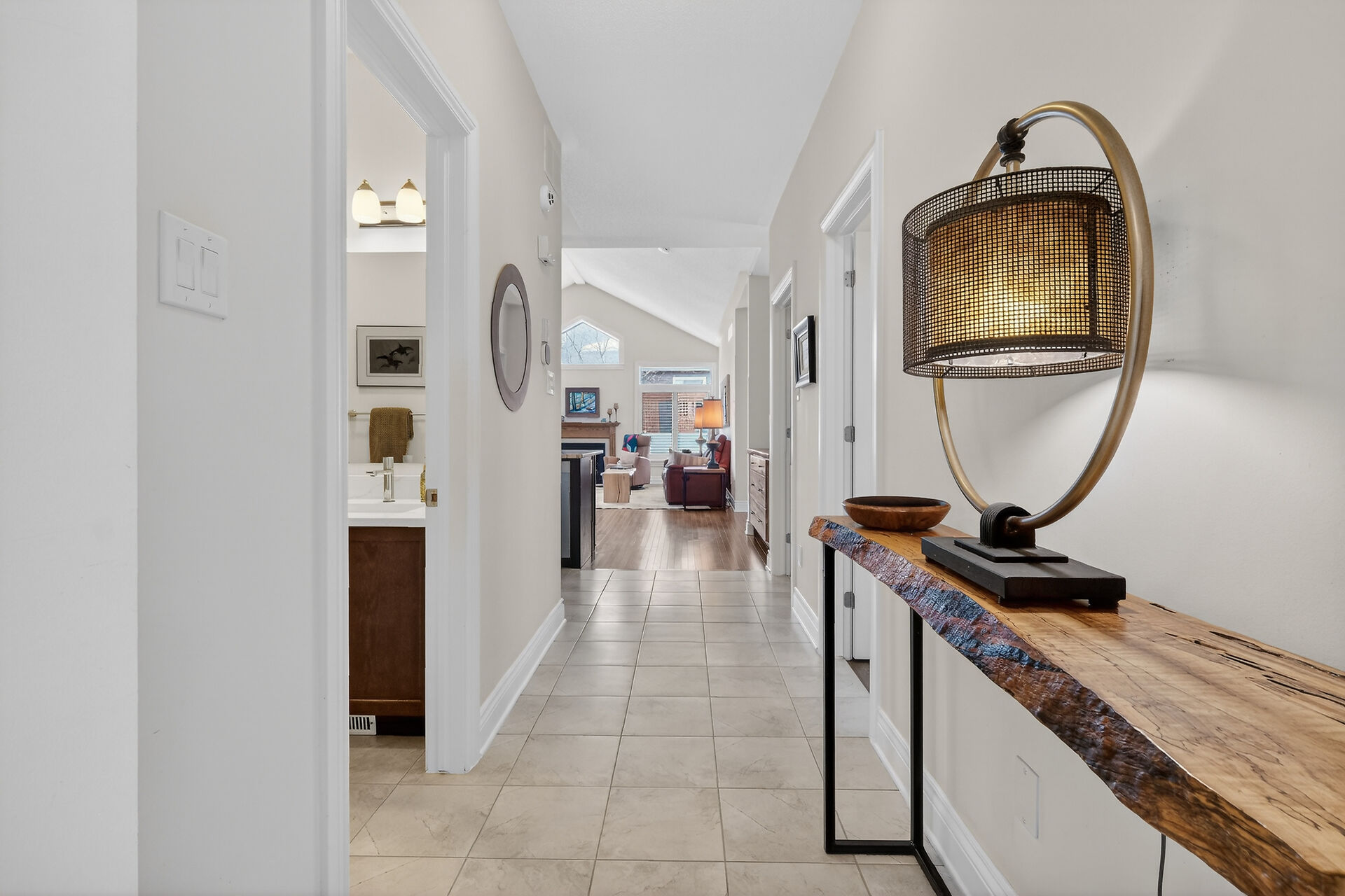 This inviting bungalow blends comfort and style in all the right ways. Rich hardwood flooring and a vaulted ceiling set the tone as you step into the open-concept living and dining area, anchored by a natural gas fireplace. The kitchen is ready for gatherings with stainless steel appliances, a breakfast bar, stone countertops, and a large pantry. A main-floor den offers a quiet retreat, while the primary bedroom features a walk-in closet and a private three-piece bathroom. A secondary bedroom and main-floor laundry complete the level. Downstairs, a generous recreation room with luxury vinyl flooring. Guests will appreciate the additional bedroom and full 3piece bathroom. Fenced yard with an interlocking stone patio.