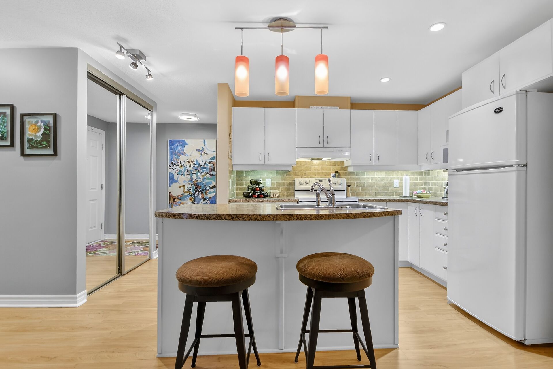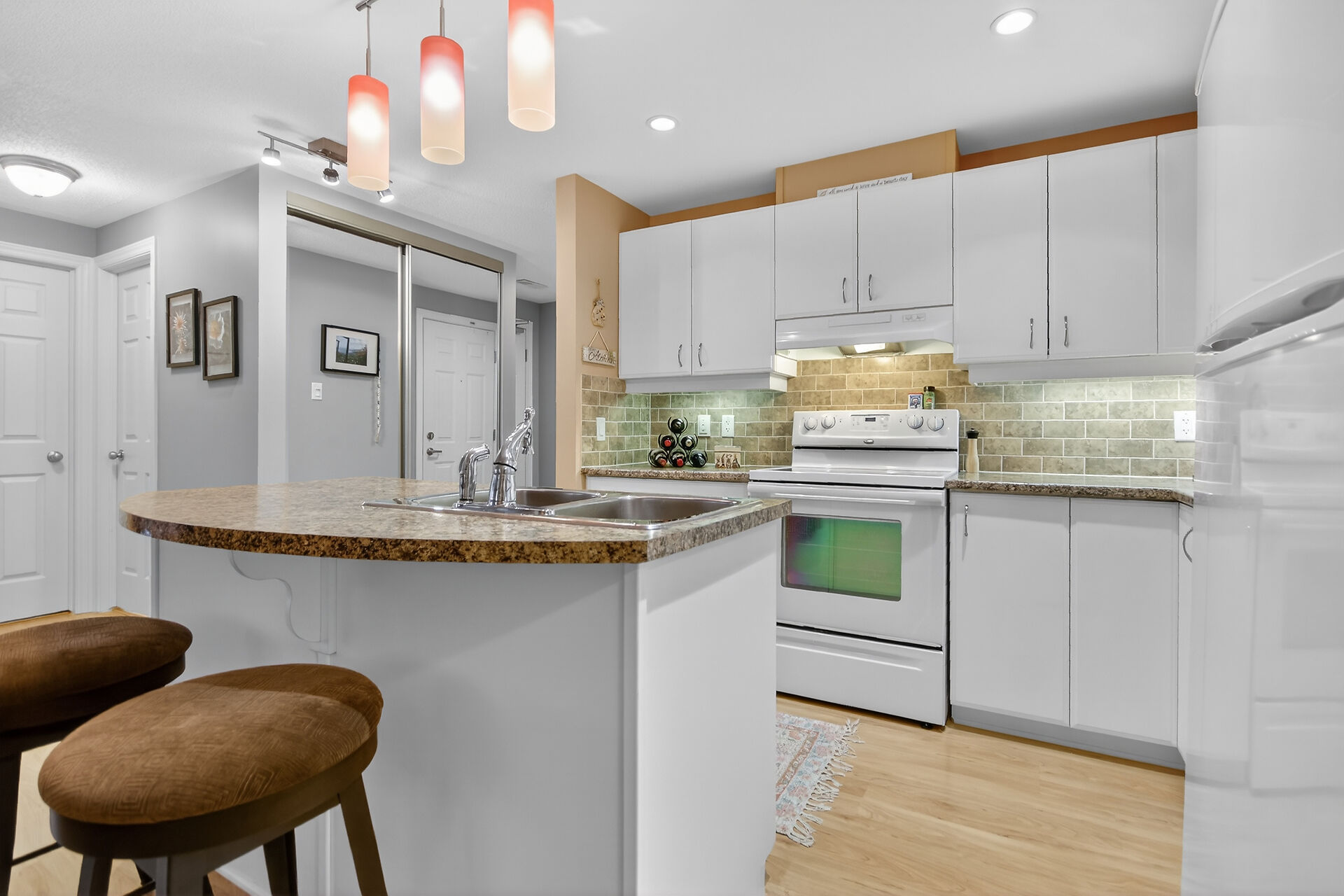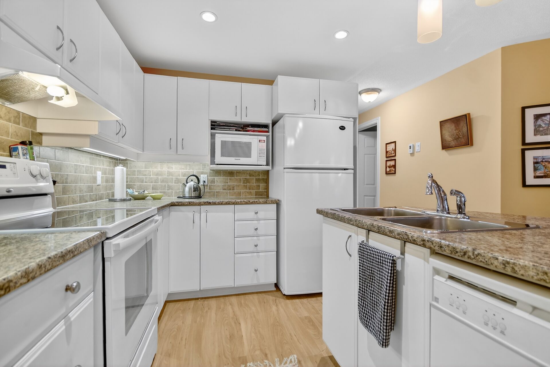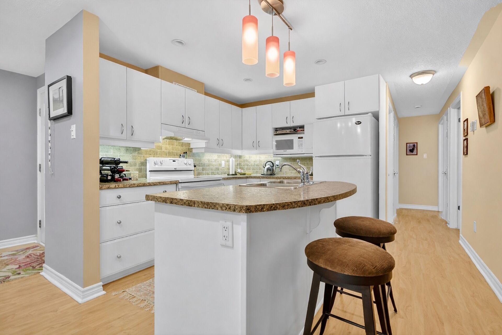 Welcome to this beautifully maintained condo in the heart of Centrepointe, offering effortless, turnkey living in one of the area's most desirable communities.This bright and spacious unit features approximately 1,100 sq. ft. of thoughtfully designed living space, including 2 bedrooms, a versatile den, and 1.5 bathrooms, ideal for professionals, downsizers, or small families. Enjoy a peaceful, nature-filled backdrop from your rear windows, creating a serene atmosphere that truly sets this home apart. Inside, you'll find a range of quality upgrades, including laminate flooring throughout the main living areas, enhanced underpadding where carpeted. The kitchen is both functional and inviting with many great features.