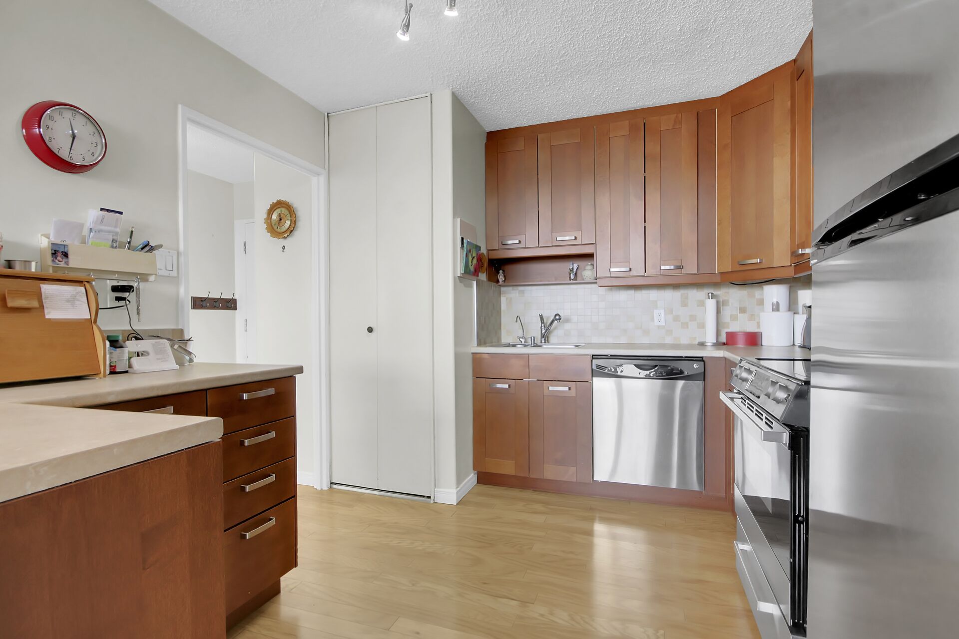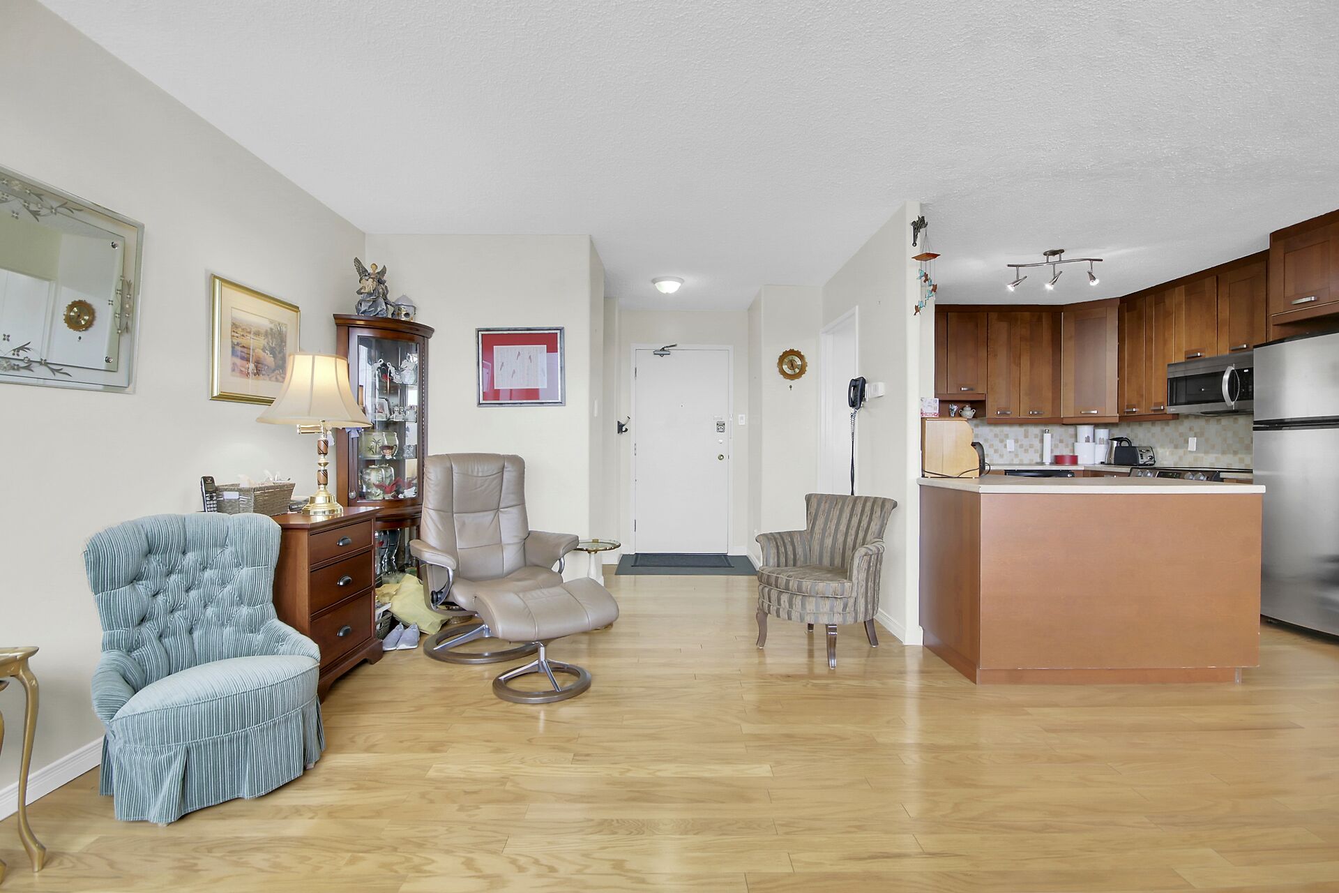 A well-maintained 2-bedroom corner unit. This bright and spacious apartment features a functional layout with a large living room, adjacent dining area, two bedrooms, and two 3-piece bathrooms. The updated kitchen offers ample counter space, and abundant cabinetry with thoughtful additions such as a built-in spice rack and Lazy Susan. Convenient in-unit laundry adds to everyday ease. Primary Bedroom enjoys a spacious 3-pce ensuite. Both bedrooms provide excellent space and storage, complemented by high-end California Closets. This quiet, well-managed, high-security building is known for its strong financials and long-term ownership. Covered, garage parking. Residents enjoy a full range of amenities!