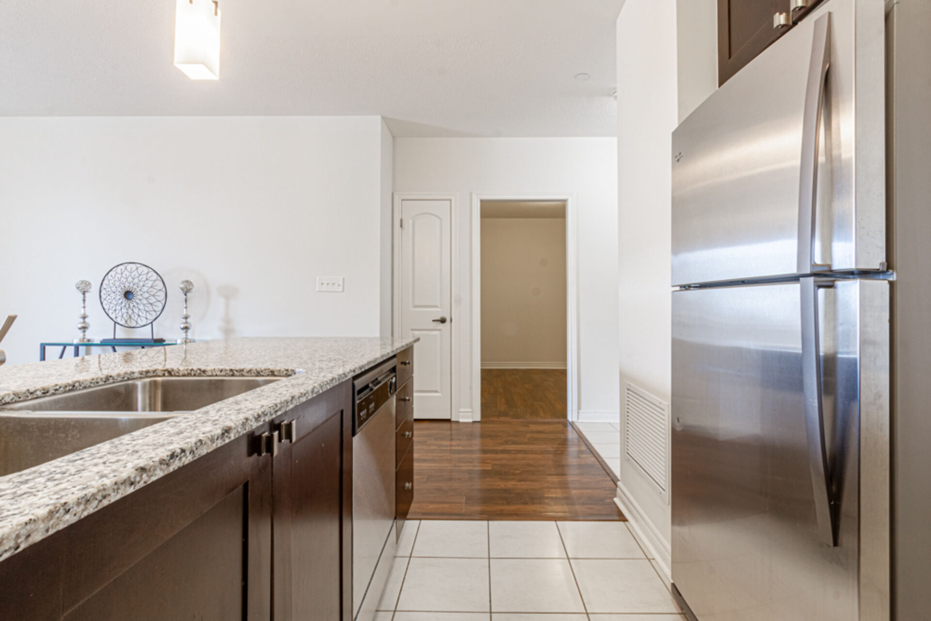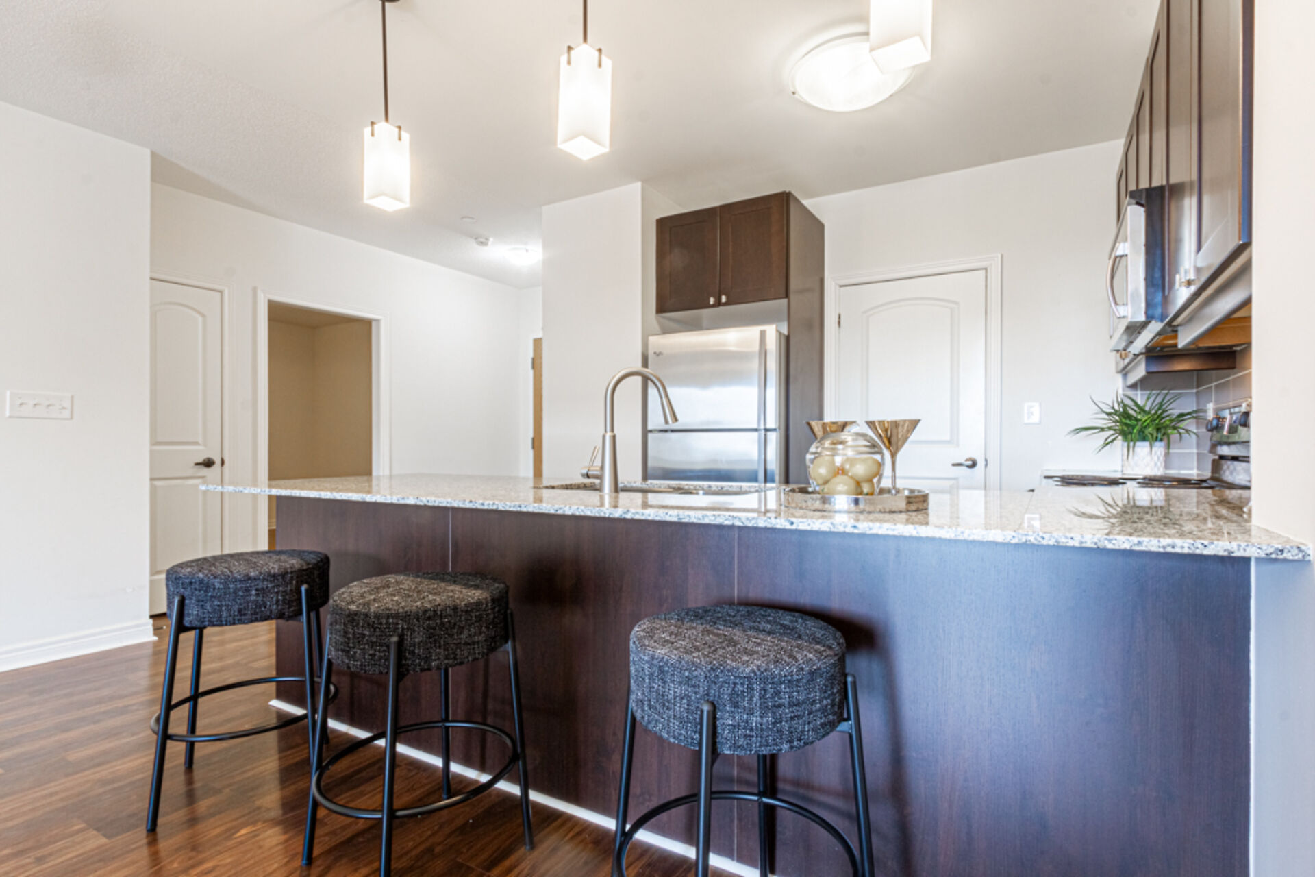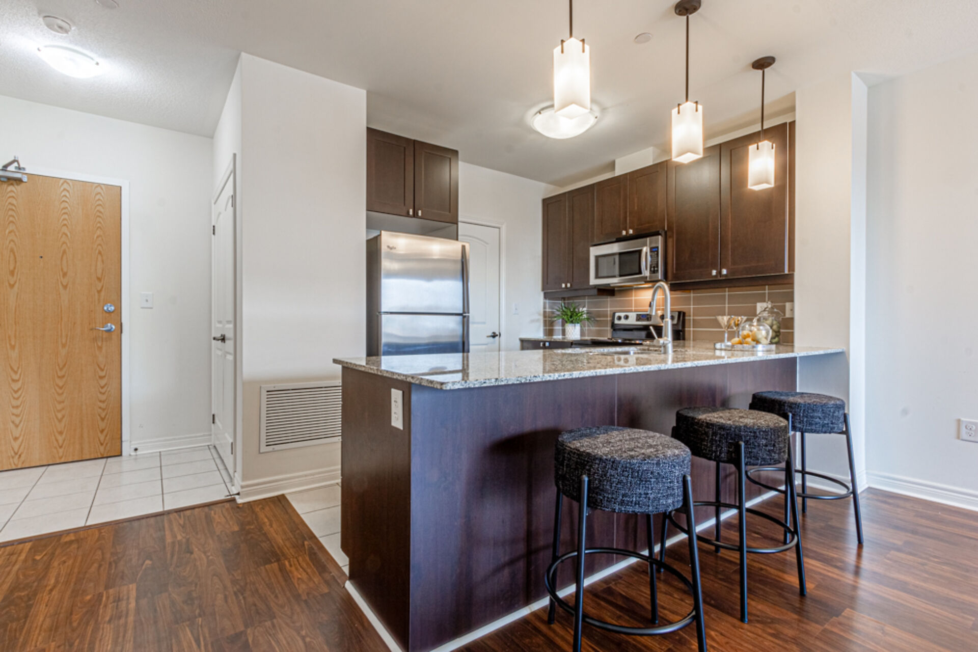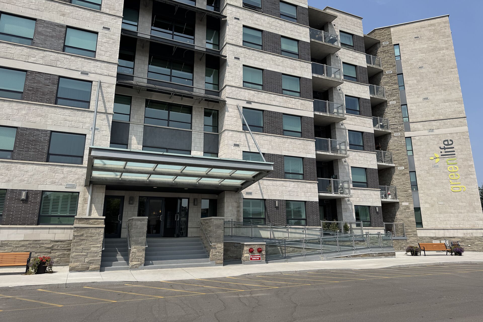 Perfect blend of space, style and sustainability at the sought-after Greenlife Condos. Boasting over 1,200 sq. ft, this unit features a rare and valuable perk - 3 underground parking spots: 2 full-sized spaces and a dedicated spot for a small vehicle or motorcycle. The kitchen showcases granite countertops and stainless steel appliances. The Primary ensuite bath has a jetted tub to wind down in after working out in the building gym. The large den has many possibilities, a home office, playroom, or guest bedroom. Just steps from downtown Milton, you'll enjoy easy access to the farmers' market, shops, and local dining. Plus, the environmentally conscious design of the Greenlife building keeps maintenance fees low.