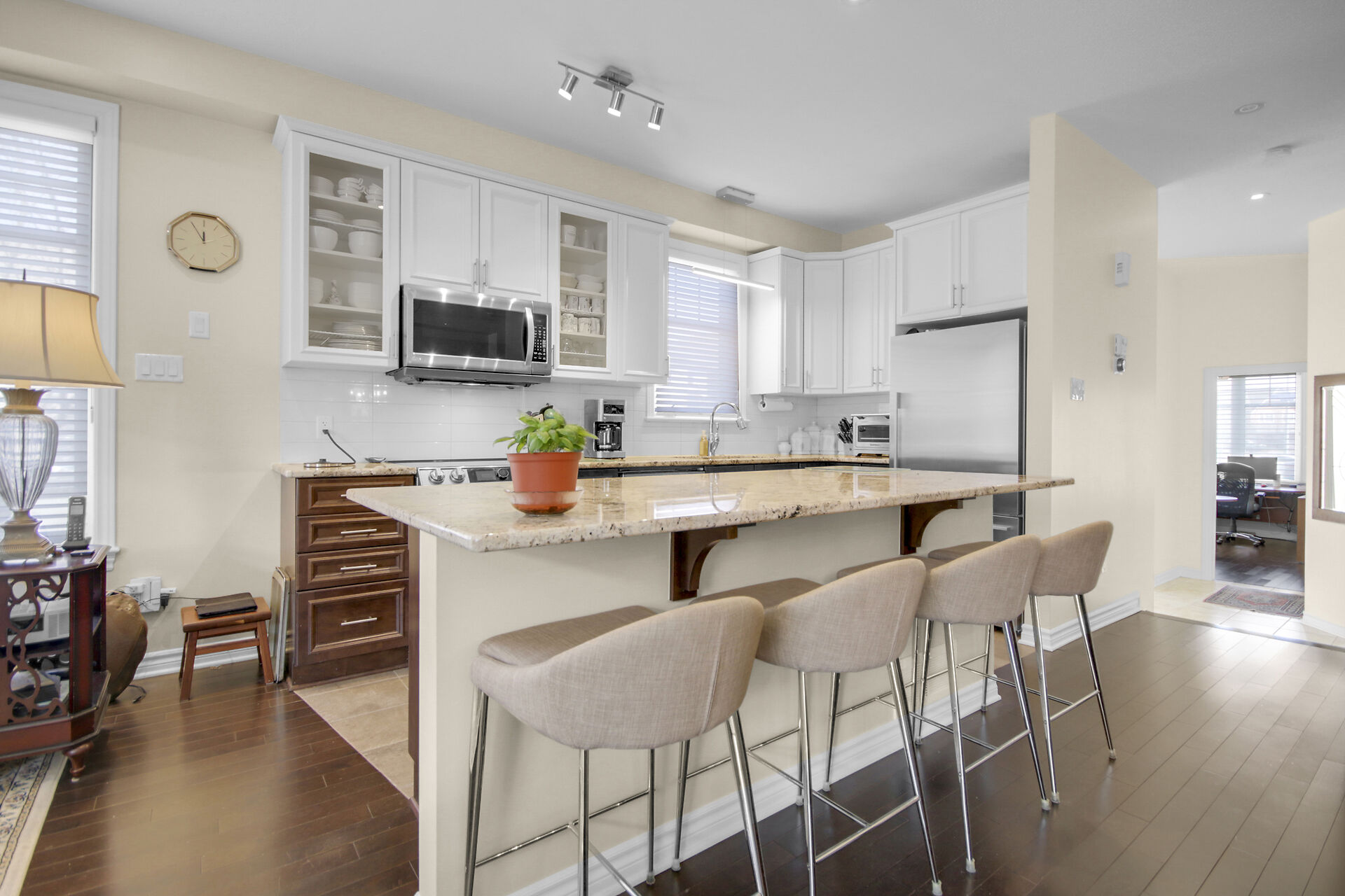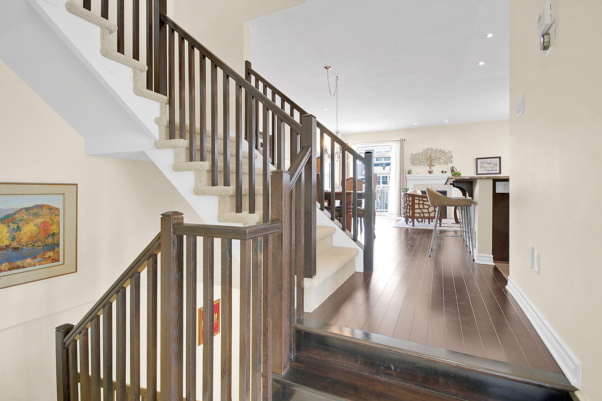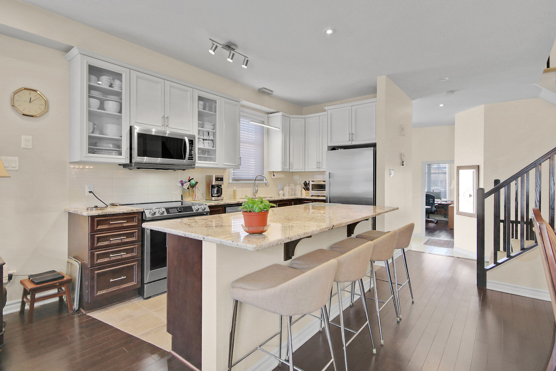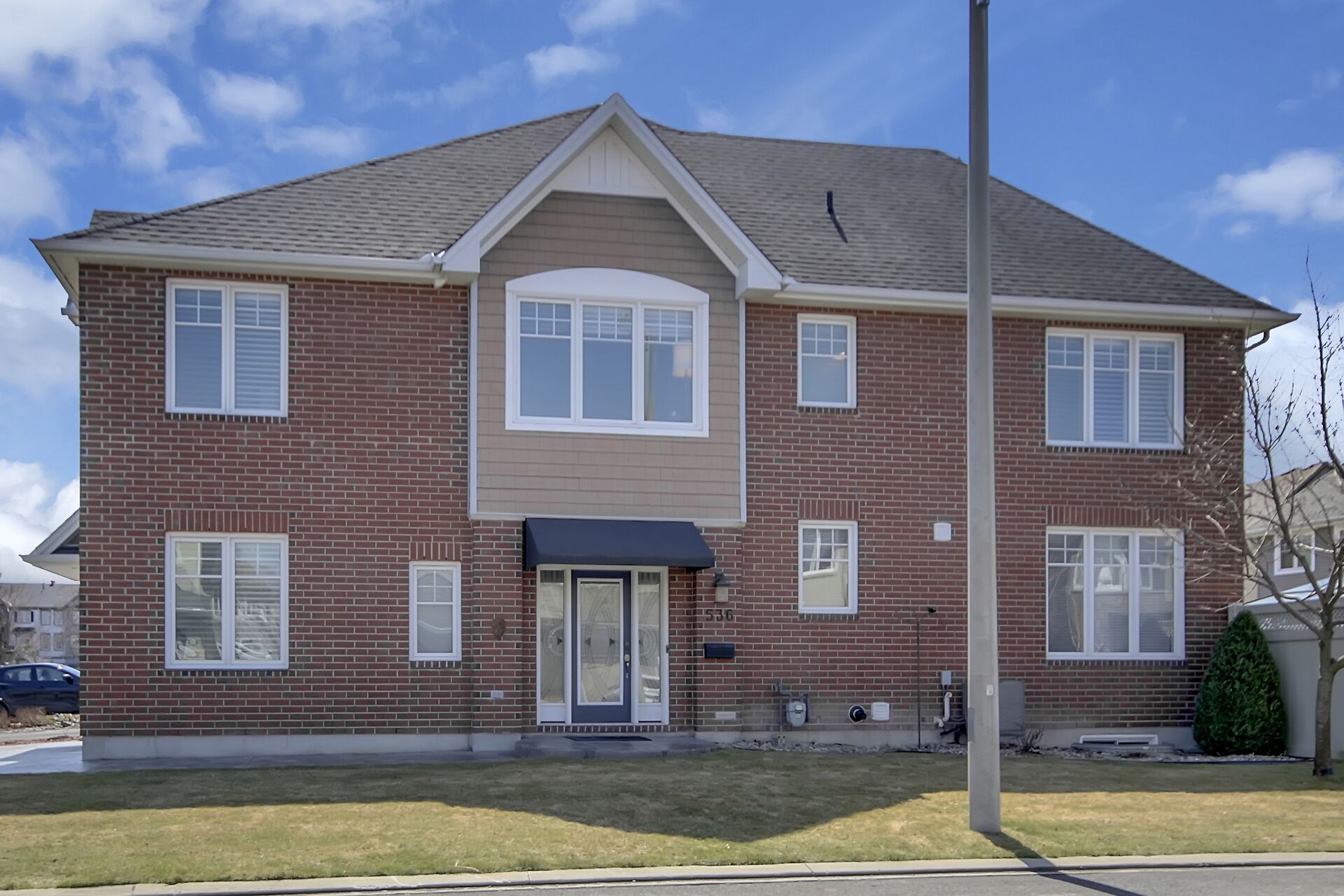 Welcome to this outstanding end unit home. From the stamped concrete driveway, walkway & fully fenced yard to the hdwd floo flowing throughout the spacious layout you will not be disappointed. Some of the many features include, main floor office with two corner windows, open concept great room ideal for entertaining or relaxing, built in buffet in the dining room. Include all appliances. Cozy gas fireplace in the lvgrm. 2nd level offers 3 bdrms + a fabulous loft and 2nd floor laundry. The good size primary bedroom enjoys a spa like ensuite with separate shower and walk in clothes closet. Lower level is your large bright L shaped recreation room plus huge storage area. Over $70K in upgrades.