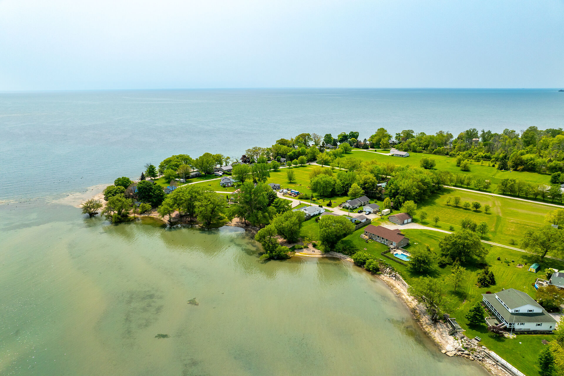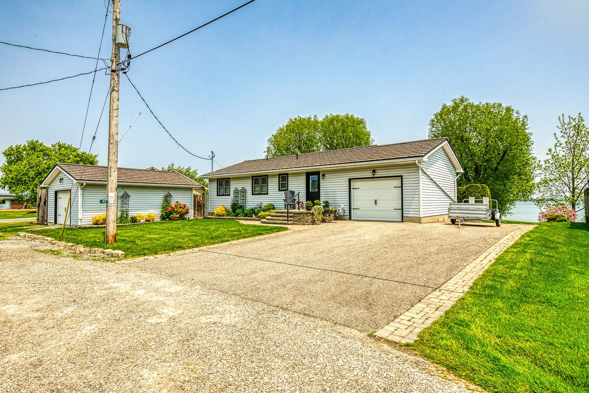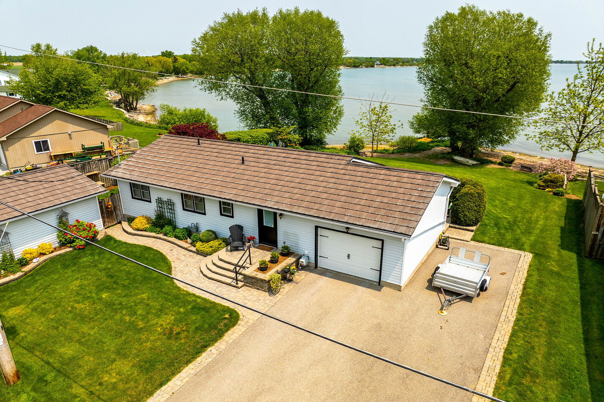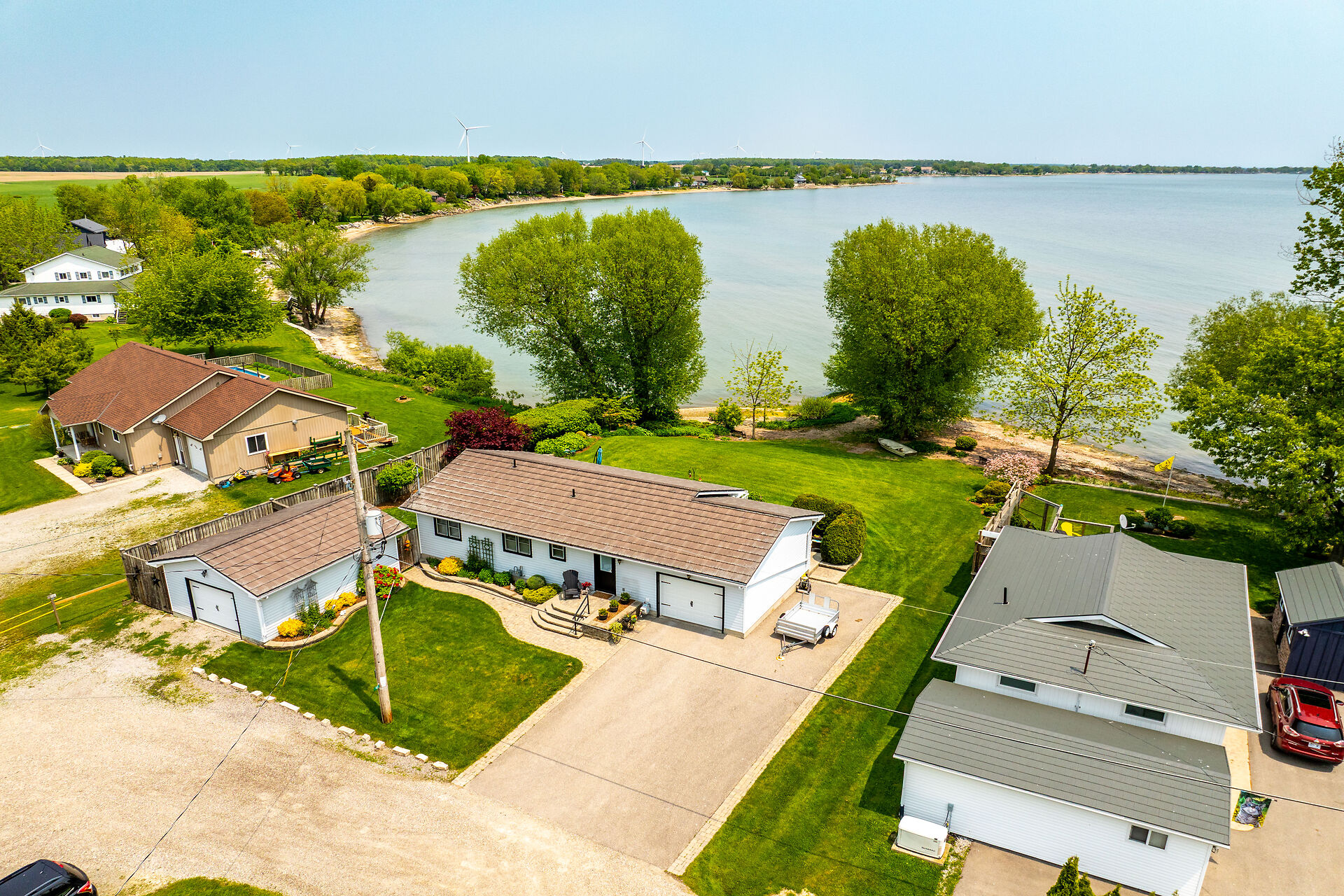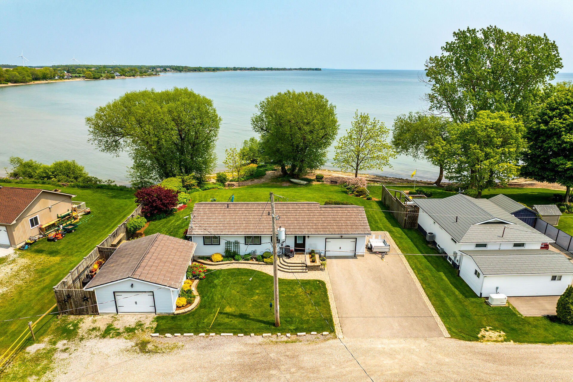 This year-round lake-house/cottage offers nearly 2000 sqft of living space with 3 bedrooms and a finished lower level. Located on a premium ½ acre waterfront lot at Hoover's Point Lane, it features panoramic views and a private beach with about 100 ft of sandy shoreline extending into Lake Erie. The property includes a paved driveway for 4 vehicles and an RV/boat, interlock brick walkways, privacy fenced yard, mature trees, manicured lawn, vibrant gardens, and extraordinary landscape. Also included are an attached garage with inside entry and a detached boathouse/workshop.The outdoor amenities perfectly complement the luxurious interior, creating an inviting atmosphere for relaxation and entertainment.