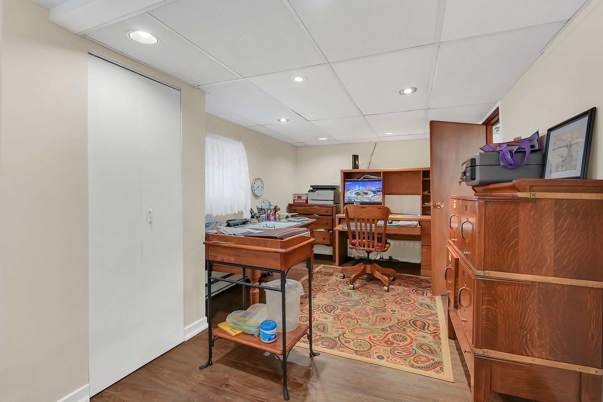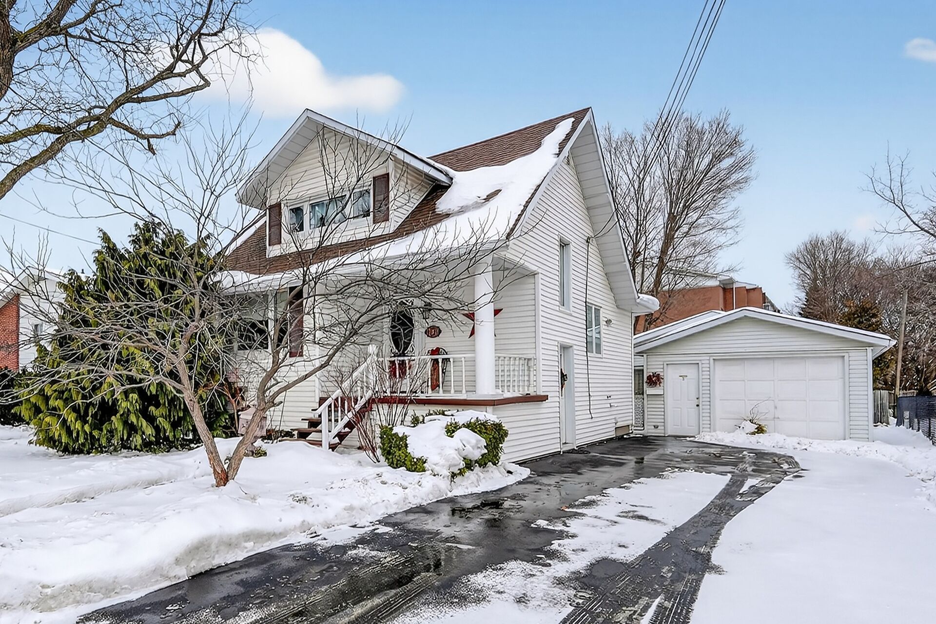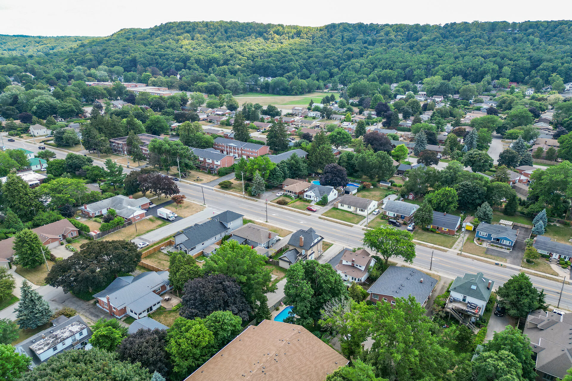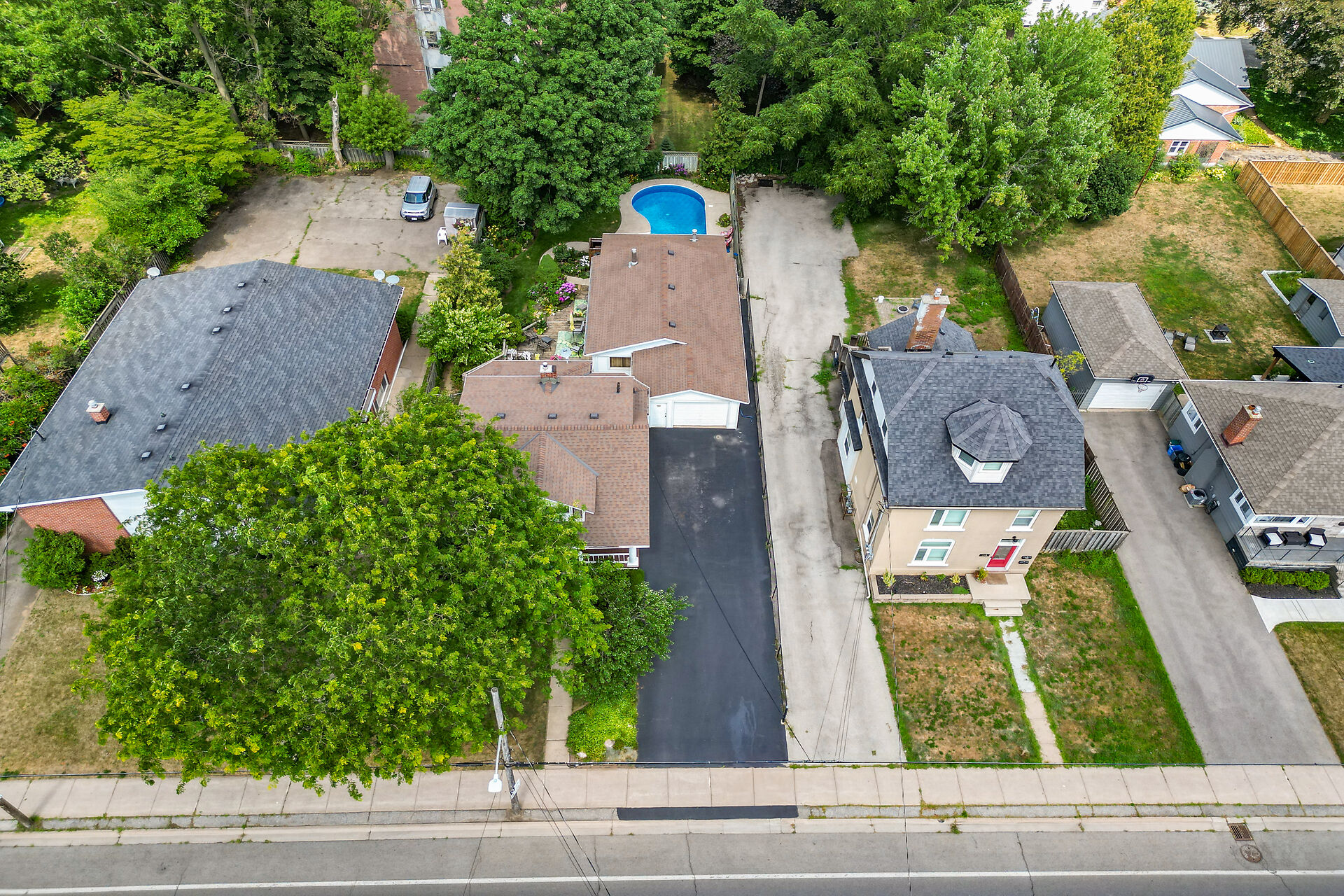 This gracious Grimsby home blends historic charm with modern comfort. Hardwood floors flow through the open-concept main level, featuring an updated eat-in kitchen and a warm family room with a brick gas fireplace. The elegant living/dining room offers crown moulding, an electric fireplace, and abundant natural light. Upstairs are two inviting bedrooms, including a primary with walk-in closet. The lower level adds a cozy rec room and storage. Outside, a private "secret garden" awaits with an inground pool, outdoor shower, multiple decks, and a change room. A large outbuilding offers a heated garage, office, and workshop. Minutes from shops, dining, and amenities with easy highway access.