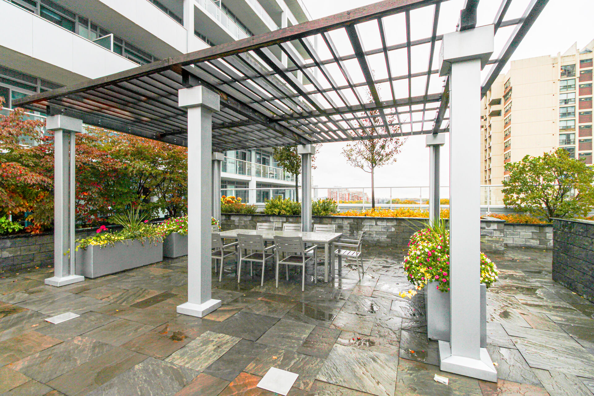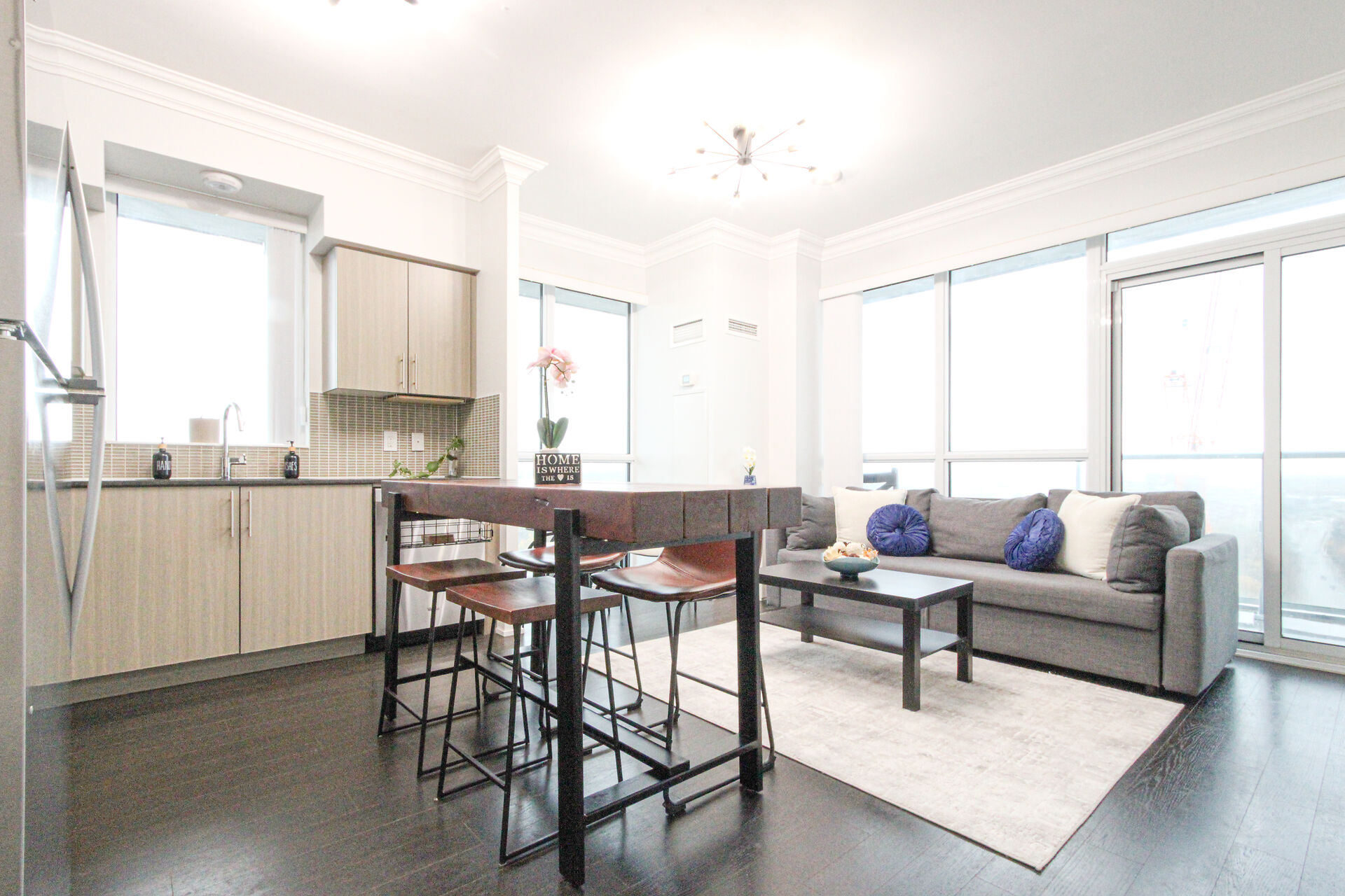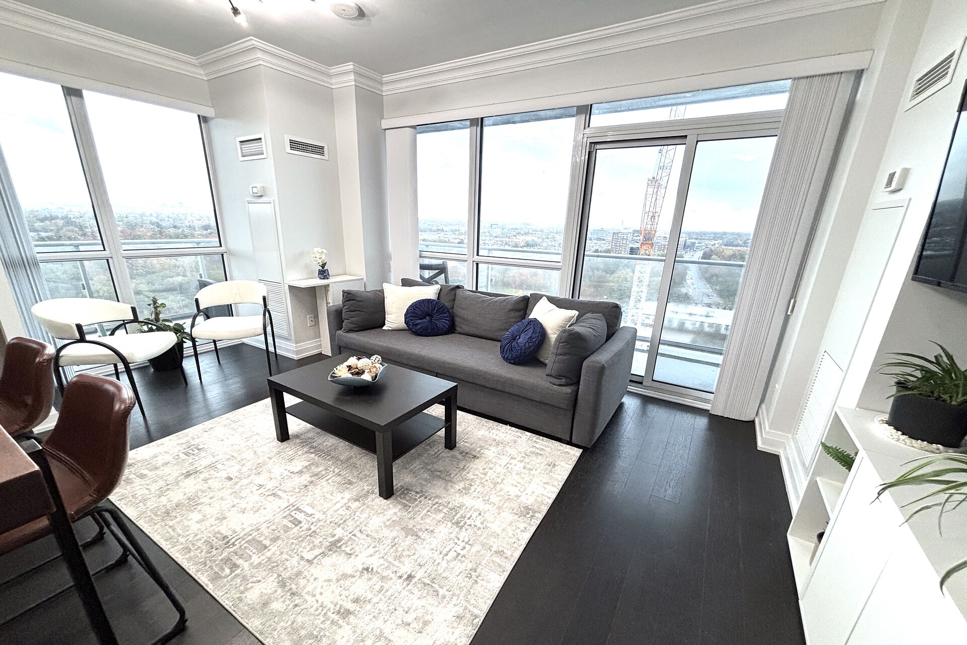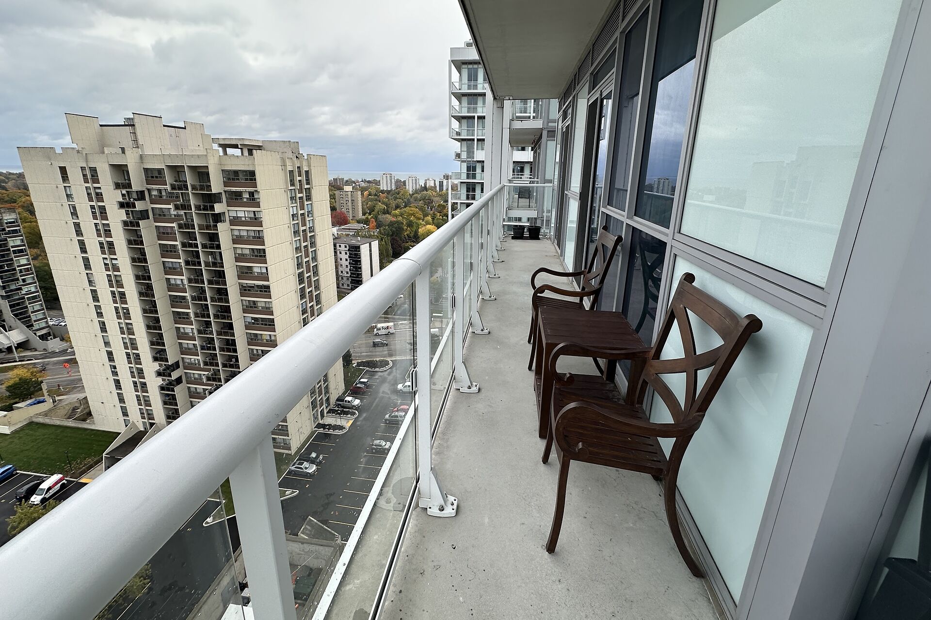 Bright & spacious 2-bed, 2-bath suite in Rain Condos by Empire Communities. Open-concept layout with 9' ceilings, crown moulding, hardwood floors & floor-to-ceiling windows. W/out from every room to a 300 sqft wrap-around balcony! Modern kitchen with S/S appliances & glass backsplash. Primary bdrm with 3-pc ensuite & W/I closet. Includes 2 side-by-side parking & locker. indoor pool, hot tub, cold plunge, sauna, gym with yoga studio, party room, library, rooftop terrace with BBQs & lounge areas, 24-hour concierge, EV chargers, visitor parking, car wash, guest suites, & secure parcel lockers. Free Wi-Fi in gym, library, & pool area. Steps to GO, Kerr Village & mins to QEW, downtown & harbour. Unobstructed skyline view