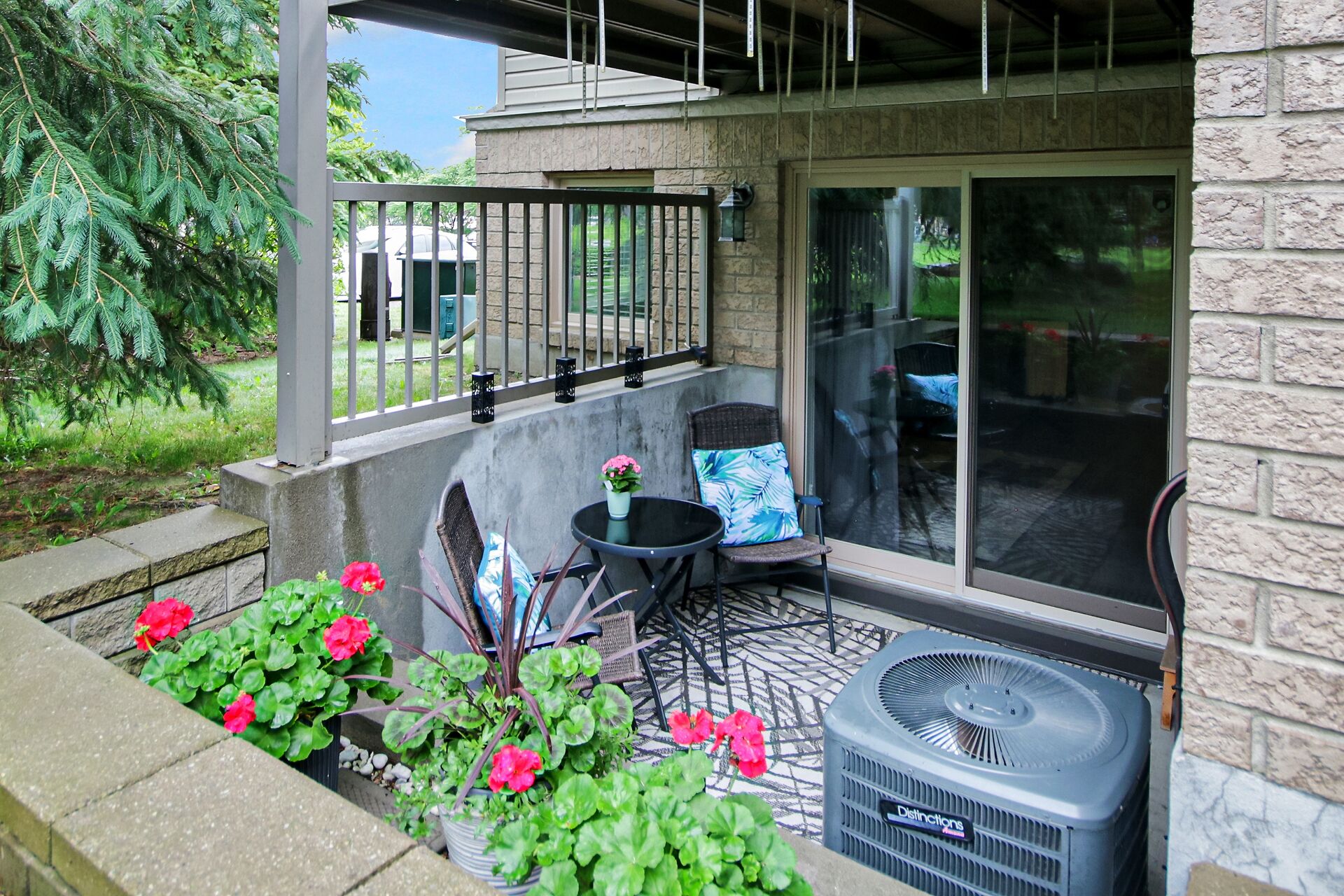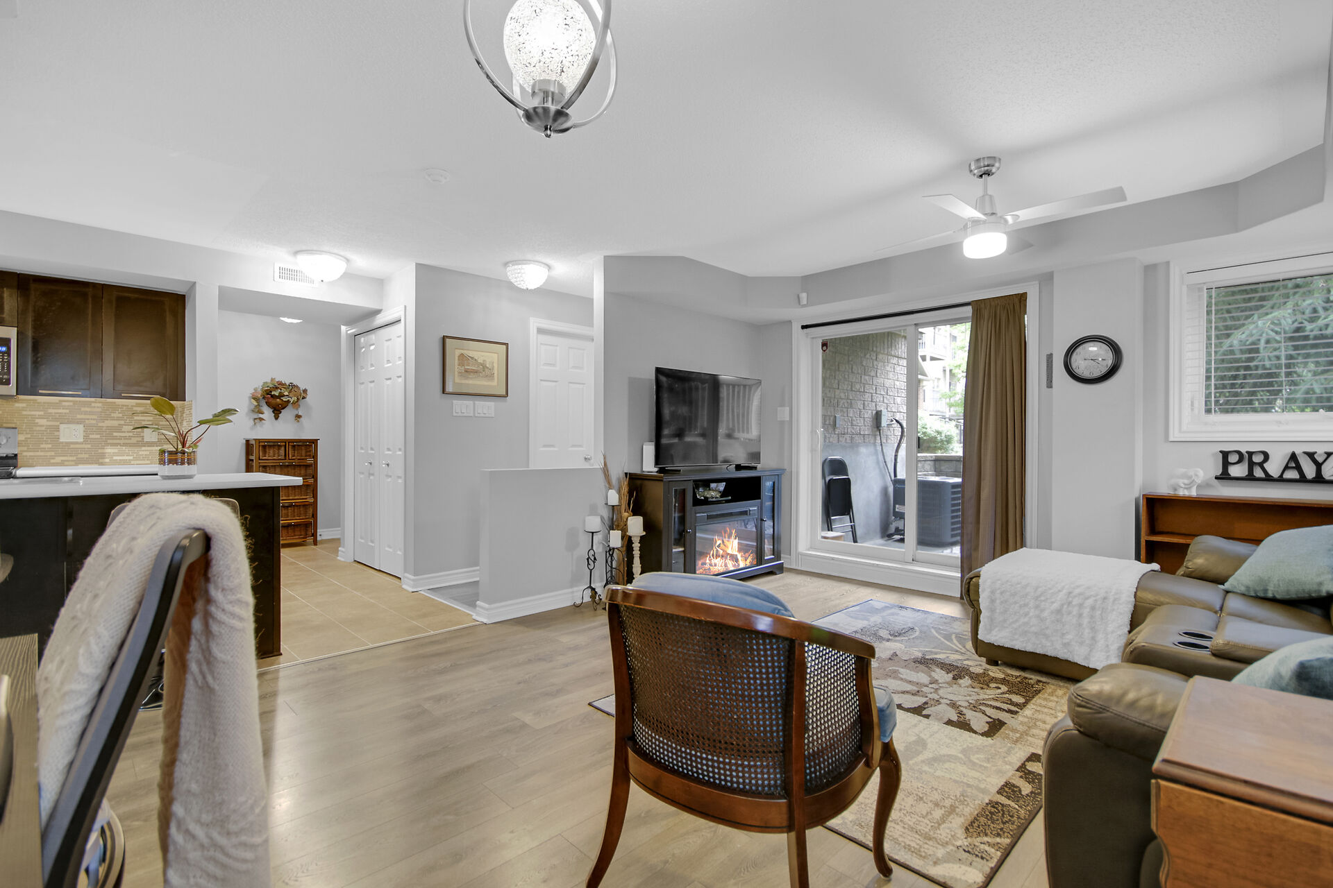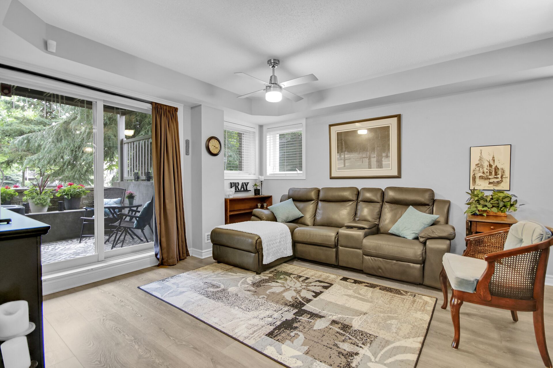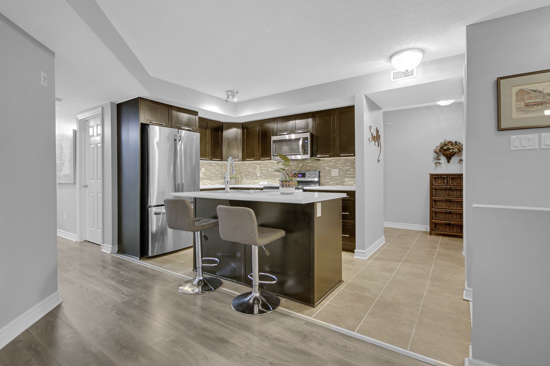 2 - 565 Stonefield Private. Rarely offered 2 bedroom PLUS den or possible spare bedroom. End unit offers extra windows and is flooded with natural light. Patio doors lead to a covered patio overlooking a beautifully maintained, parklike courtyard. Enjoy summer in your own private enclave. Open concept living room/dining room with an island and breakfast bar for casual meals. Stainless steel kitchen appliances including a microwave/hood fan. NO carpeting here. All flooring is low maintenance laminate or tile. 1.5 bathrooms with a 2 piece powder room for guests. Main bathroom is bright with a window and is nicely appointed with a vessel sink. Heating is a gas furnace & central air for hot summer days. Parking spot #77