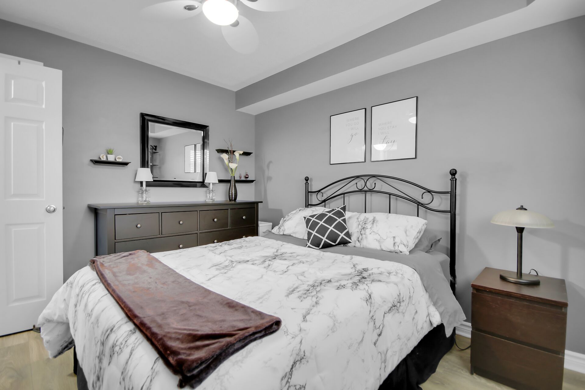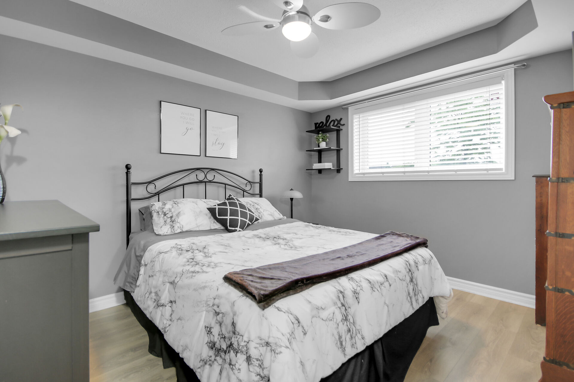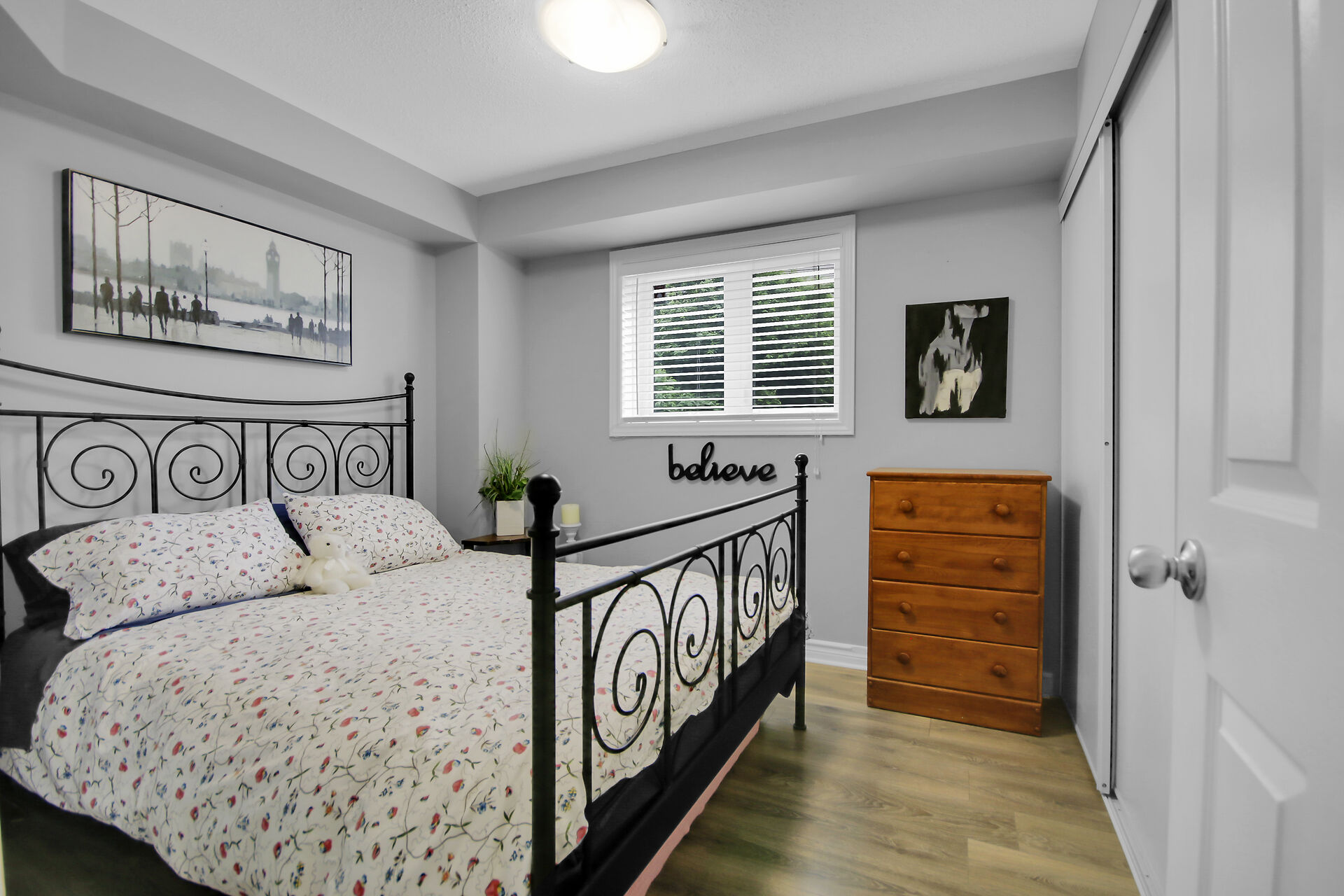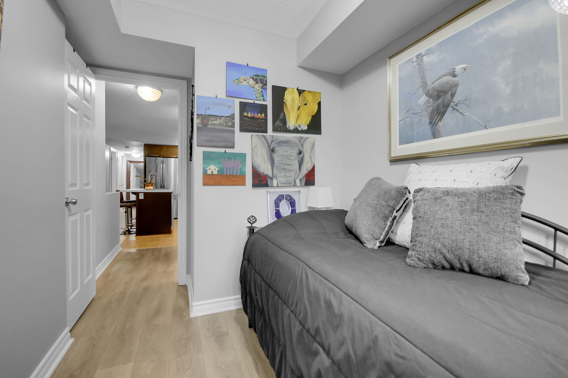 2 - 565 Stonefield Private. Rarely offered 2 bedroom PLUS den or possible spare bedroom. End unit offers extra windows and is flooded with natural light. Patio doors lead to a covered patio overlooking a beautifully maintained, parklike courtyard. Enjoy summer in your own private enclave. Open concept living room/dining room with an island and breakfast bar for casual meals. Stainless steel kitchen appliances including a microwave/hood fan. NO carpeting here. All flooring is low maintenance laminate or tile. 1.5 bathrooms with a 2 piece powder room for guests. Main bathroom is bright with a window and is nicely appointed with a vessel sink. Heating is a gas furnace & central air for hot summer days. Parking spot #77