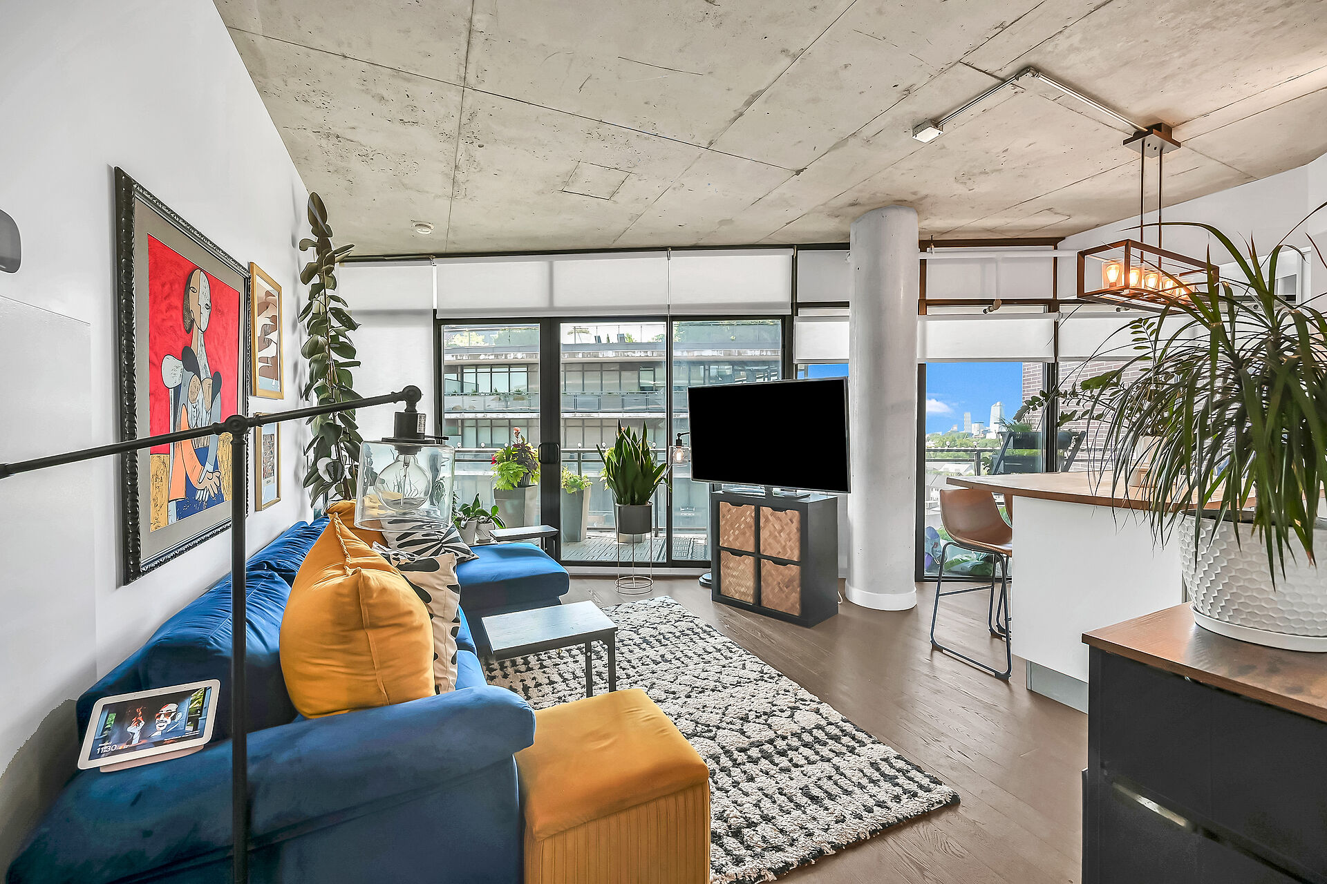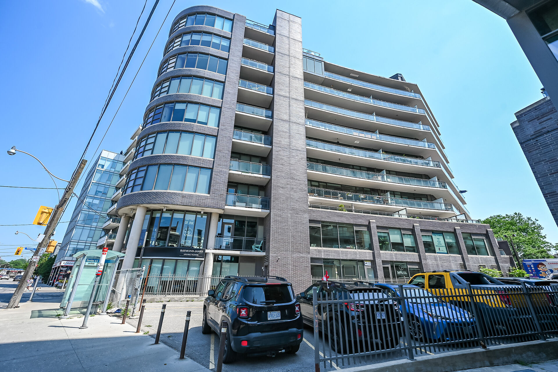 Welcome to #902 at the Flat Iron Lofts – a stunning, light-filled corner suite in the heart of vibrant Leslieville! This spacious 1 bedroom plus den loft features a thoughtfully designed, open-concept layout with soaring exposed concrete ceilings and expansive floor-to-ceiling windows that flood the space with natural light. Enjoy seamless indoor-outdoor living with a large private terrace equipped with a gas BBQ hookup – perfect for entertaining or relaxing while watching the sunset. The suite boasts modern finishes, a sleek kitchen with full-size stainless steel appliances, and wide-plank hardwood flooring throughout. South-facing views feature warmth and brightness all day long.