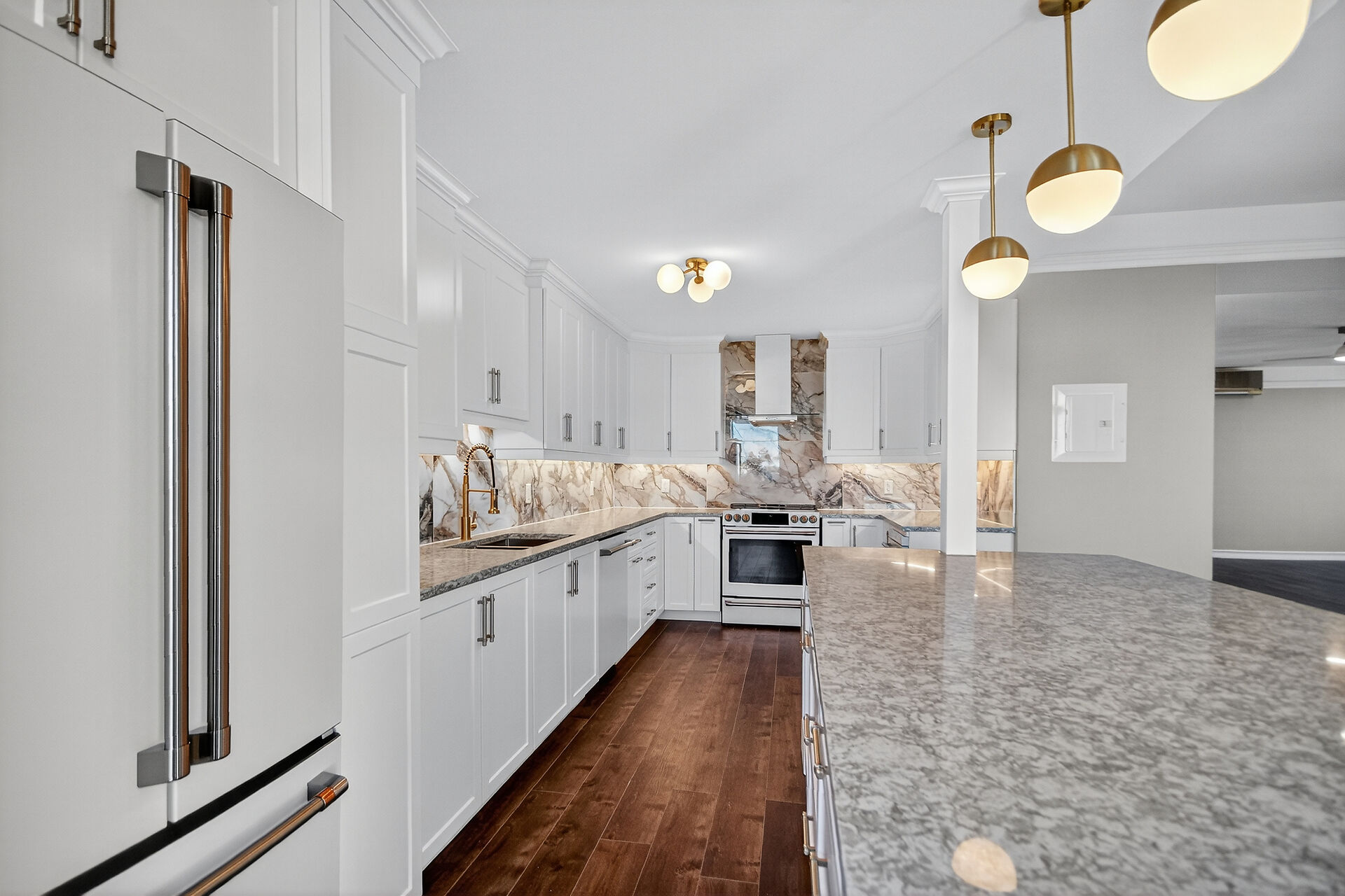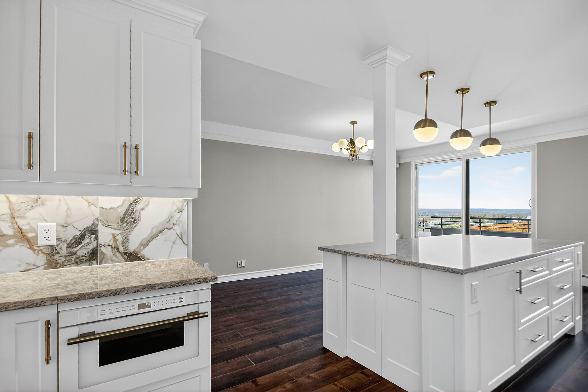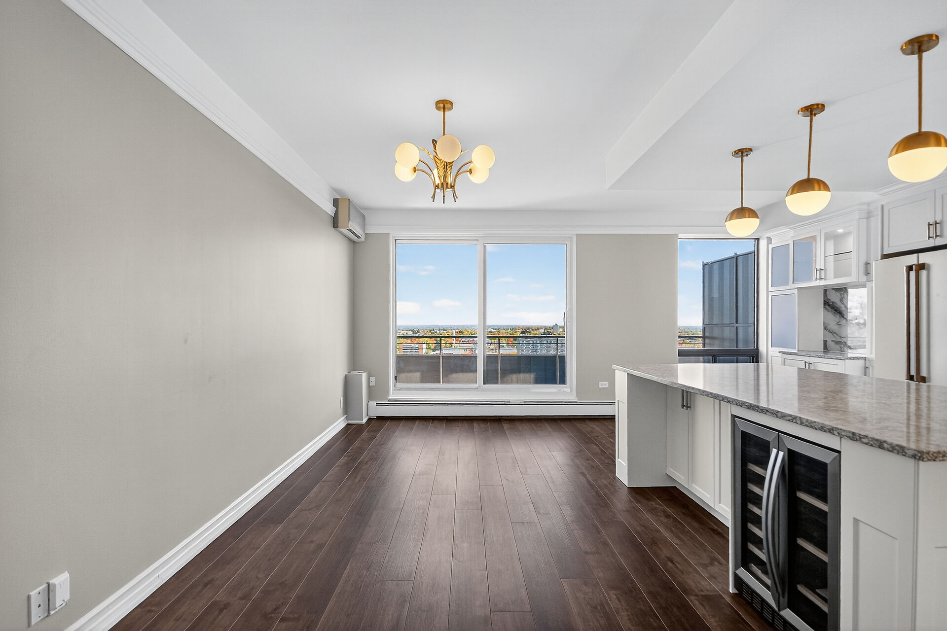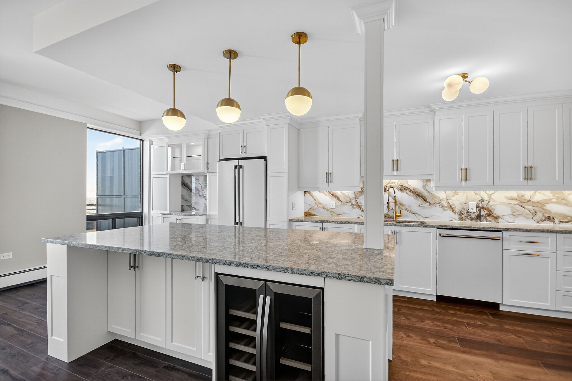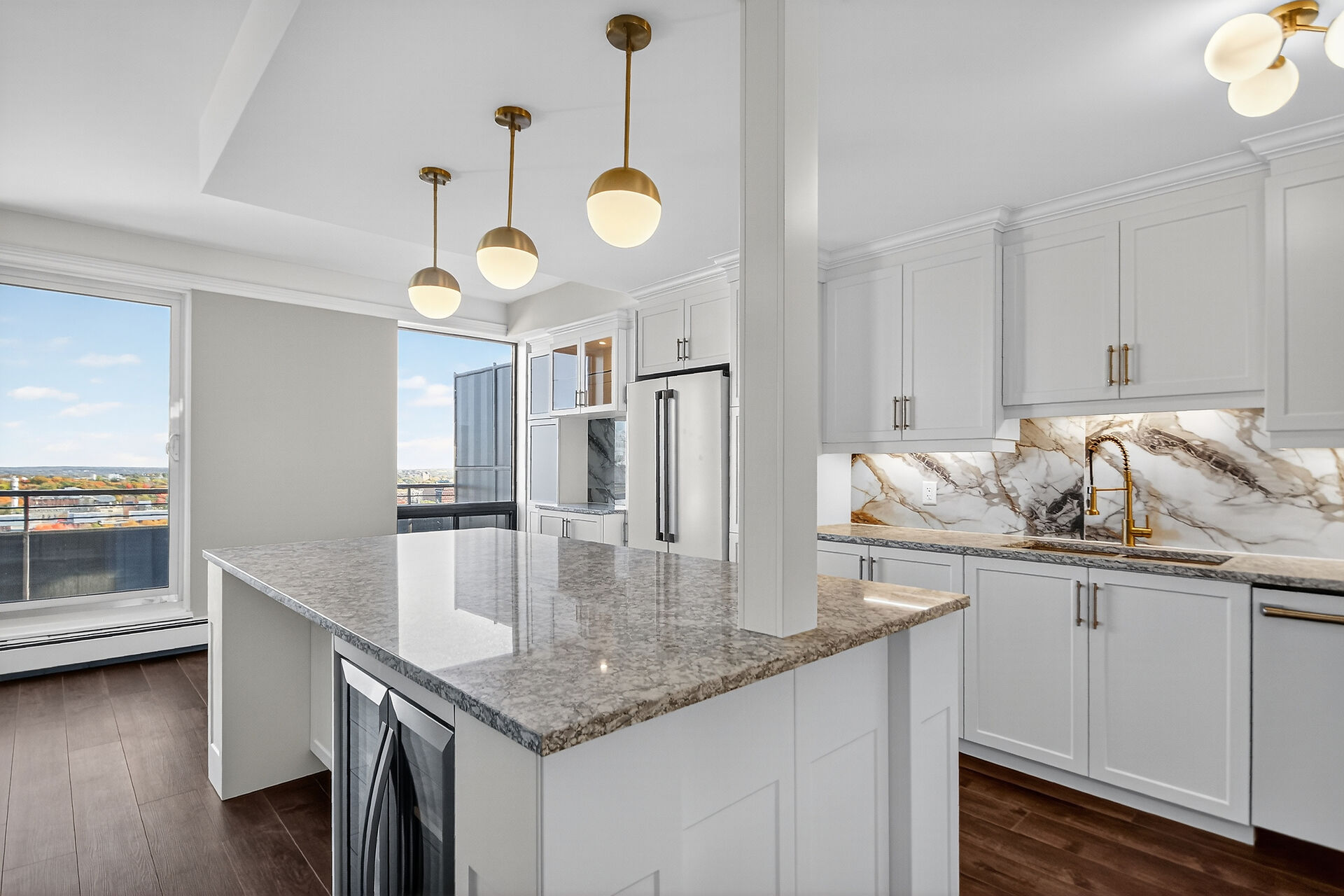 Stop the Car! Penthouse Perfection! Spectacular living, offering over 1900 sq ft of beautifully renovated living space. This stunning "home in the sky" boasts a kitchen to remember with high-end Cafe appliances, including the fridge, stove, microwave, and dishwasher, complemented with a wine fridge and euro style hood fan. Note the elegant granite countertops and gorgeous dramatic backsplash, under cabinet lighting along with an 8-foot island / breakfast bar. Ample storage in this kitchen and room for a large kitchen table. A balcony off the kitchen. The unit features continuous vinyl click flooring throughout, no carpets. This exquisite penthouse features a massive great room - living room and dining room combo ...