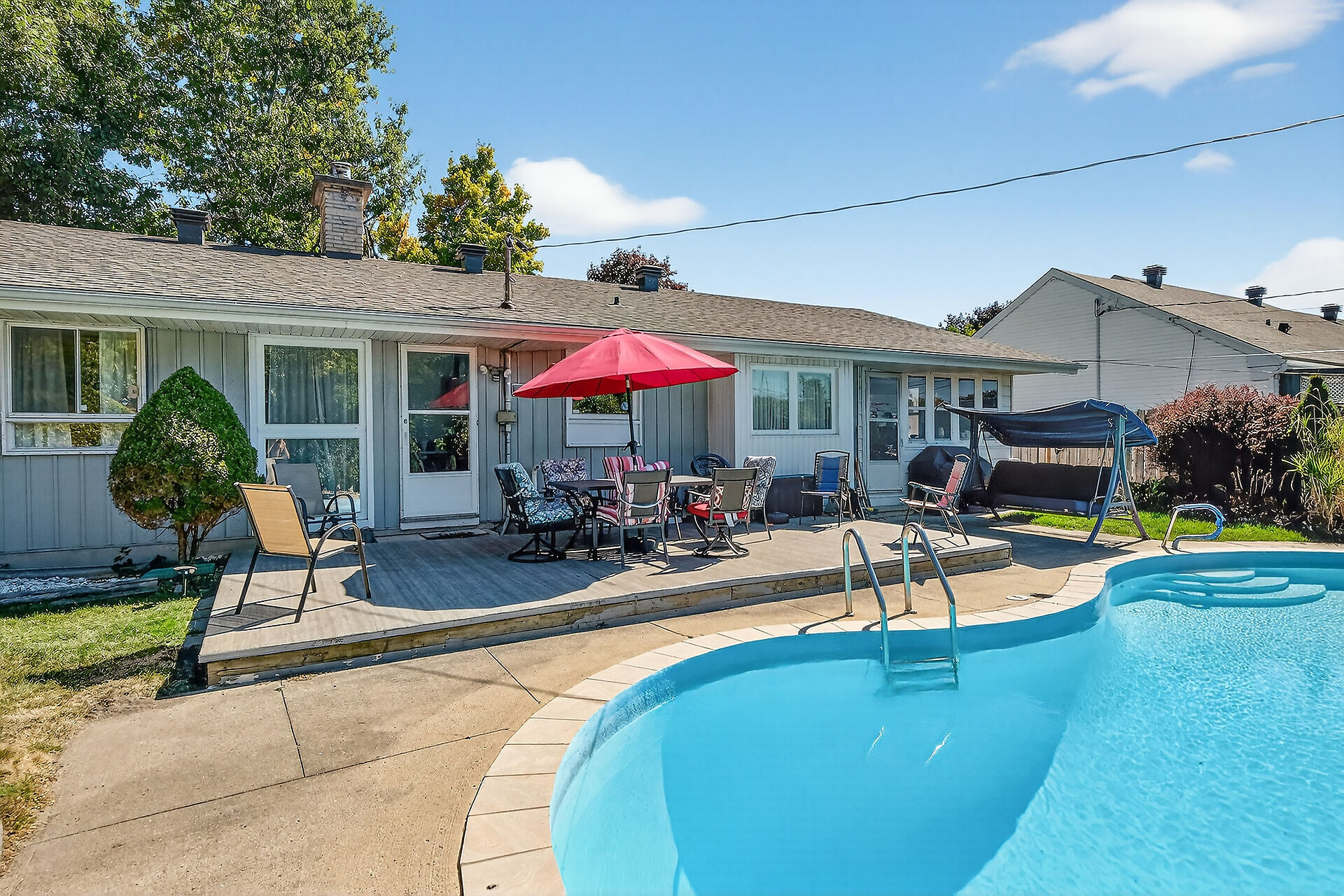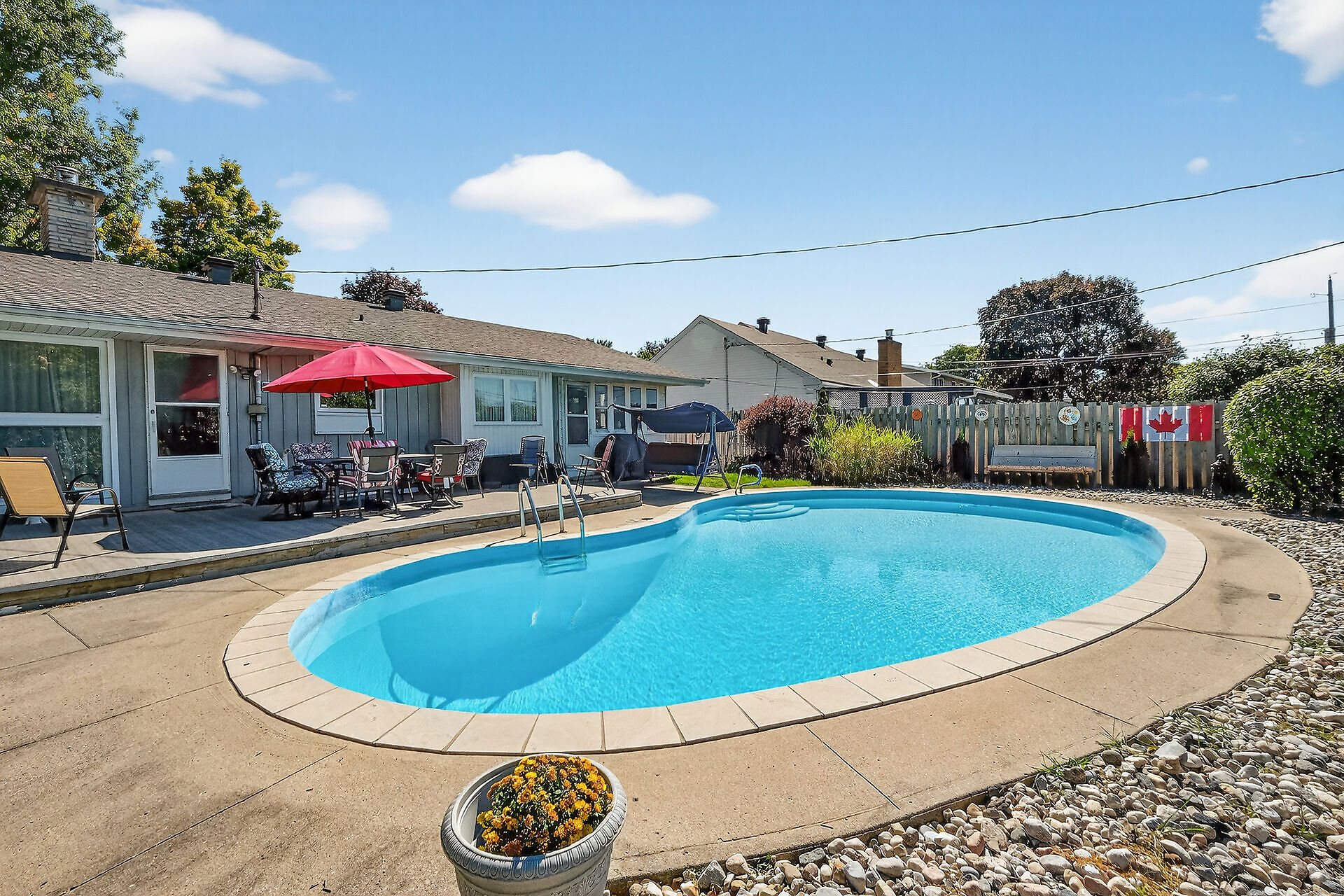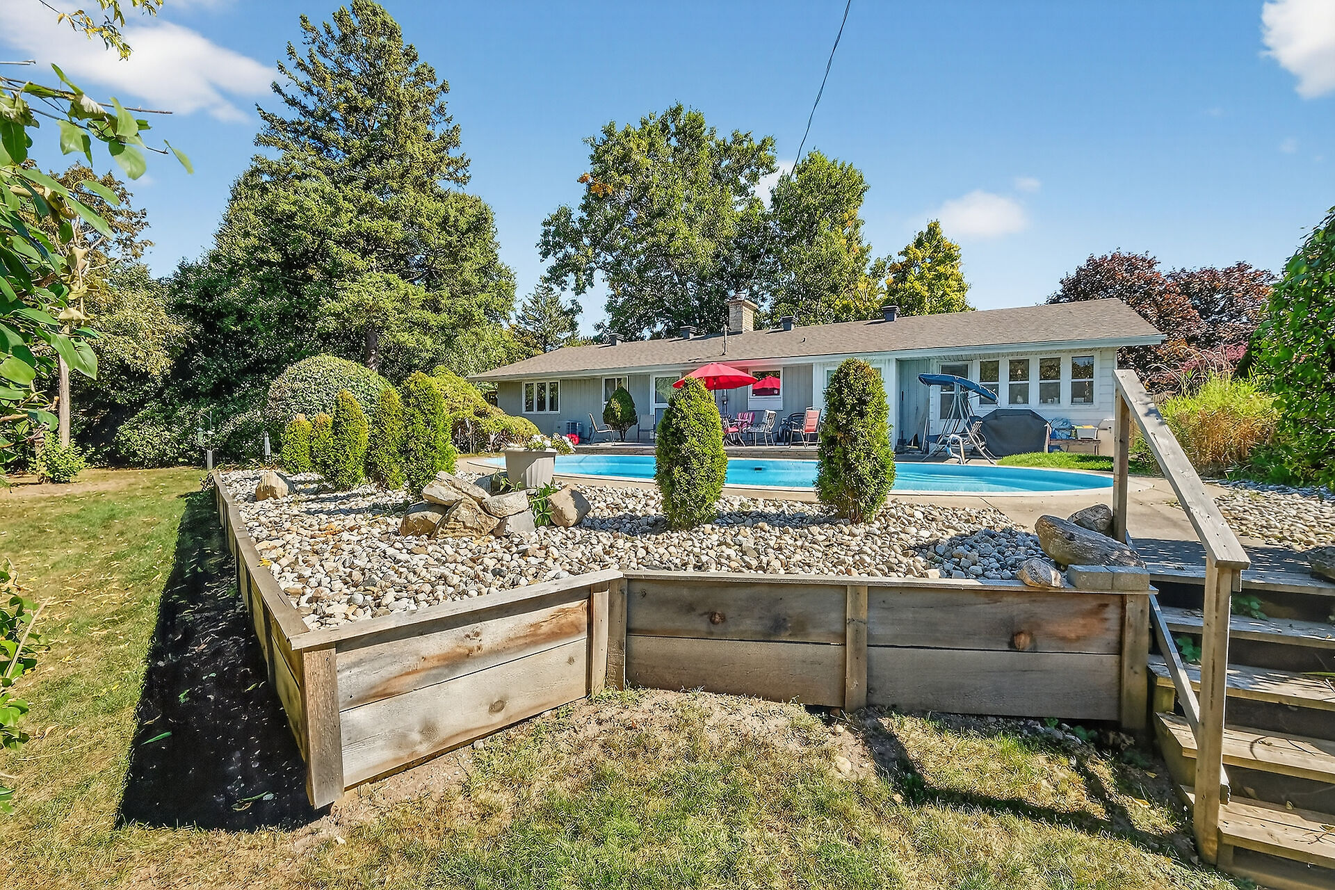 Welcome to an Oasis inside a15 minute drive from Parliament Hill! Well maintained four bedroom bungalow on a pie shaped lot with a double garage. Hardwood flooring throughout. Spacious living area with gas fireplace. Dining area with door to sunroom and recessed buffet nook. Eat-in kitchen with views of the yard. Primary bedroom with 2 pc. ensuite bathroom. Main bath with glass doored shower stall and lots of storage space. Downstairs to massive finished basement with wood burning stove, wet bar and 2 pc. powder room. Laundry area, cold pantry and utility room for ample storage. Step into a huge lot with inground salt water pool, low deck for outdoor dining and entertaining, storage shed with lots of yard to spare!